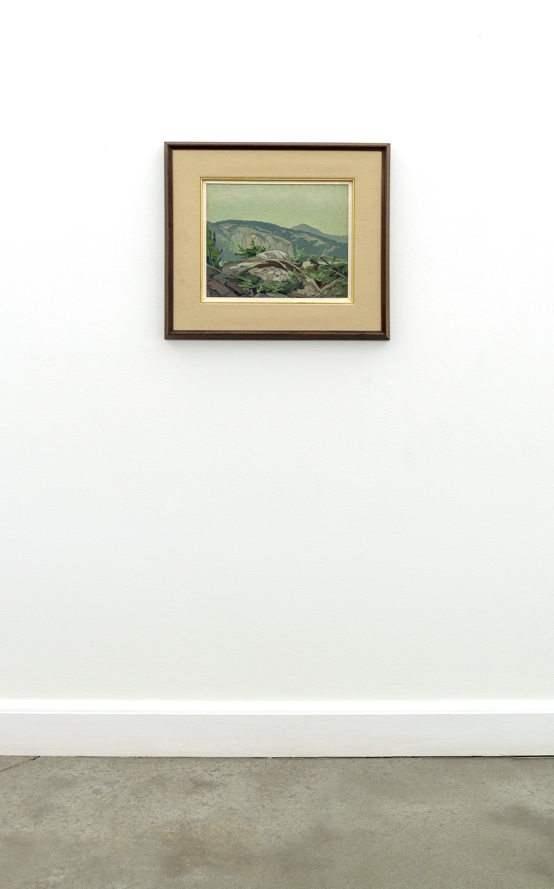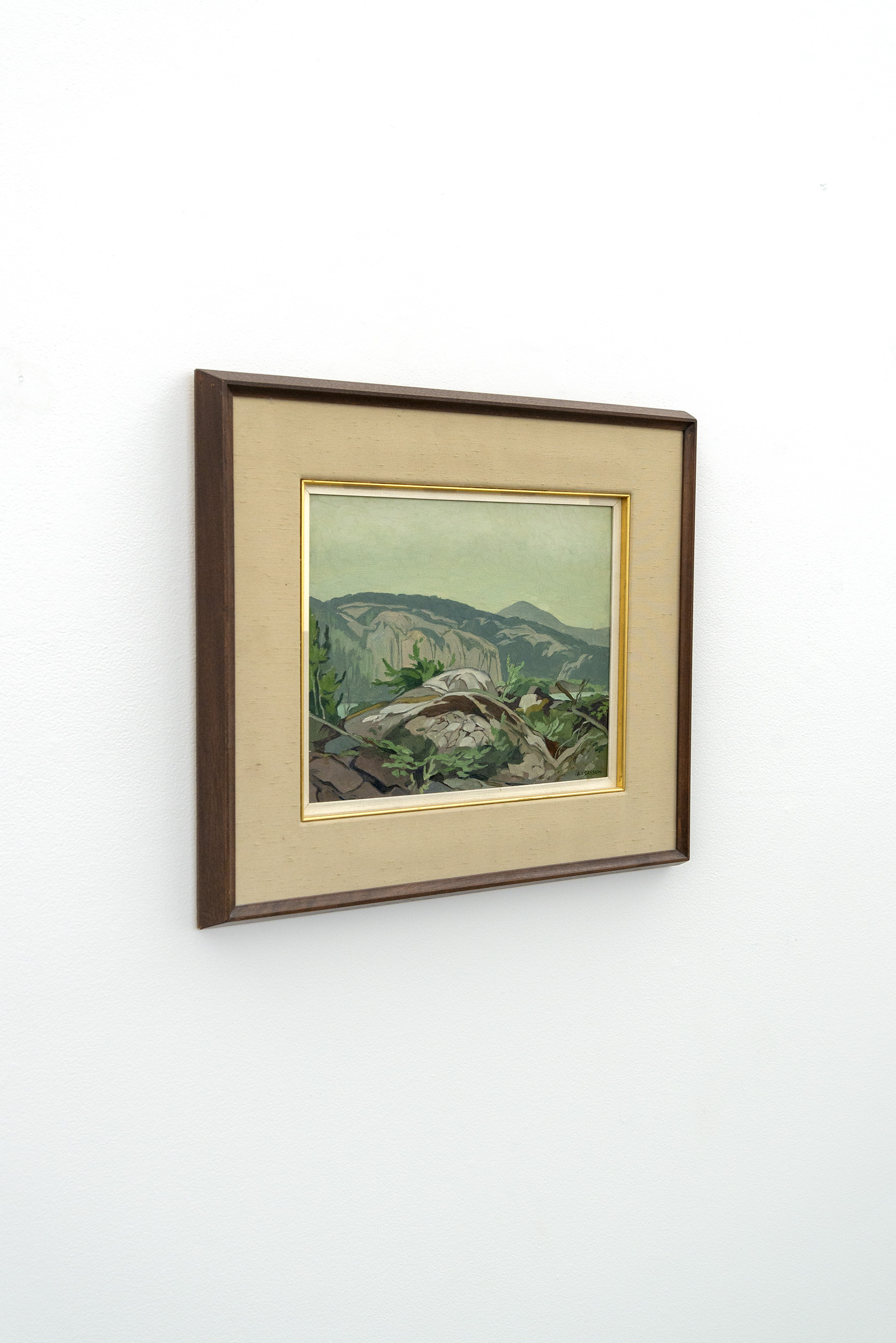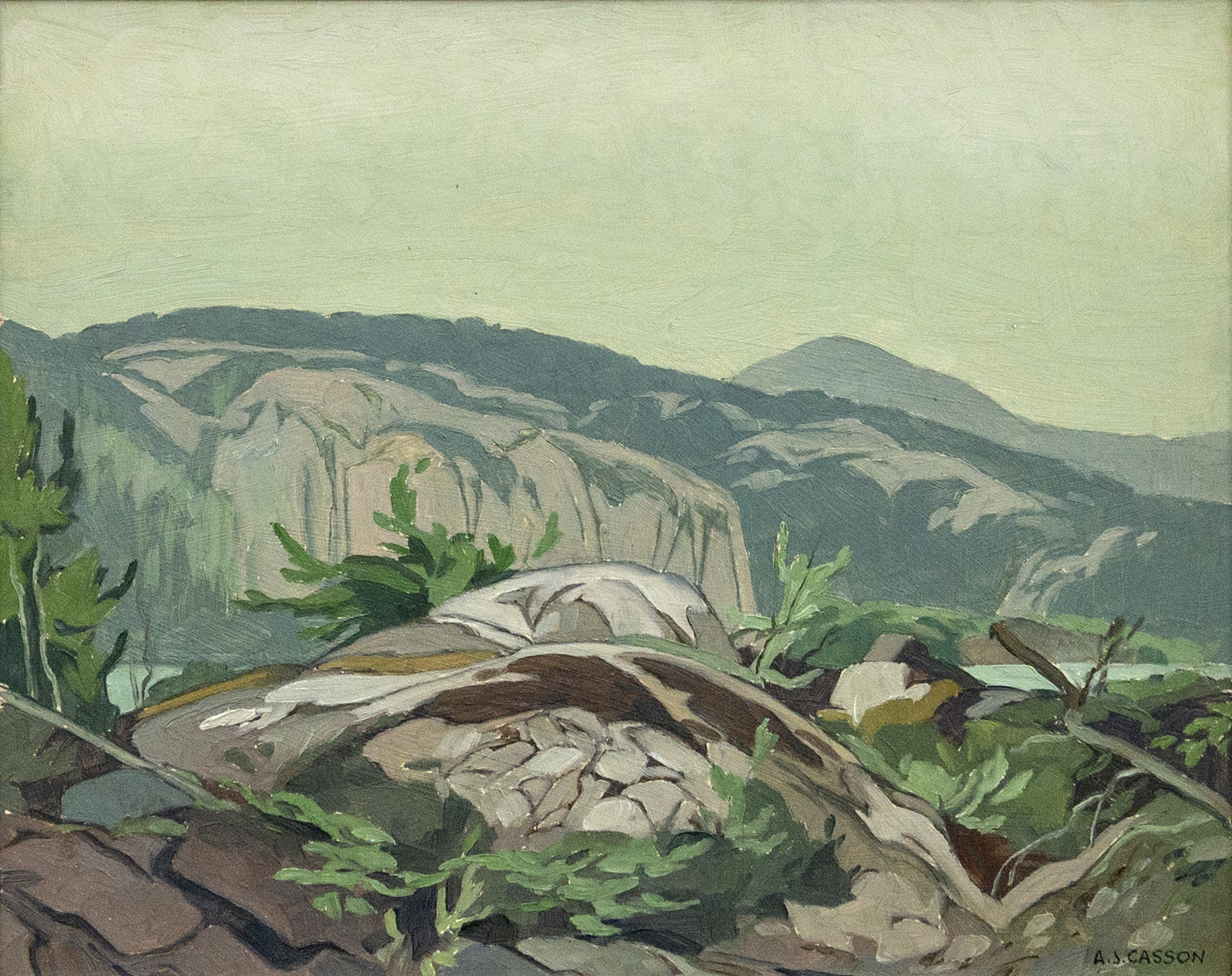 This oil on canvas captures the rugged rocky landscape of the shores of Frood Lake near Sudbury in Northern Ontario. An avid canoeist, Casson spent many hours in the wilderness paddling lakes and documenting the scenery in his signature rich expressive style. The palette is earthy—a rich melange of browns, grays and soft greens.