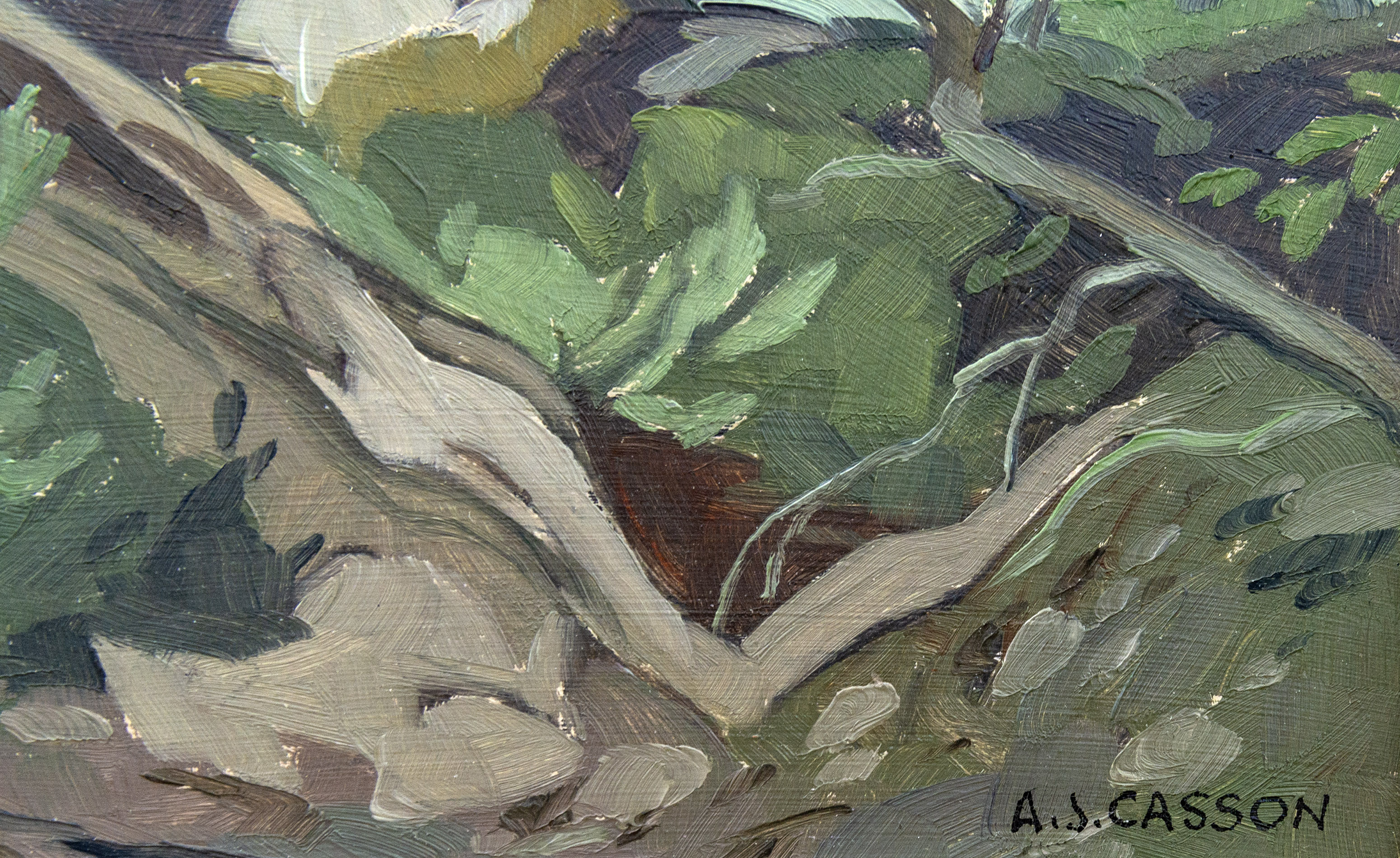 Carmichael encouraged him to sketch and paint on his own. Casson was invited to join the Group of Seven in the 1920s, with whom he painted for years. Following their demise, he formed the Canadian Society of Painters in Water Colour in 1933. He became a member of the Royal Academy of Arts in 1940 and an Officer of the Order of Canada. Casson became the Art Director and finally the Vice President of the Ontario College of Art. He retired in 1957 to paint full time. He died a few days short of his 94th birthday and is buried on the grounds of the McMichael Canadian Art Collection in Kleinberg, Ontario, beside five other members of the Group of Seven. His work is held in many private collections around the world and publicly in the Ontario Gallery of Art, the McMichael Canadian Art Collection and the National Gallery of Canada.