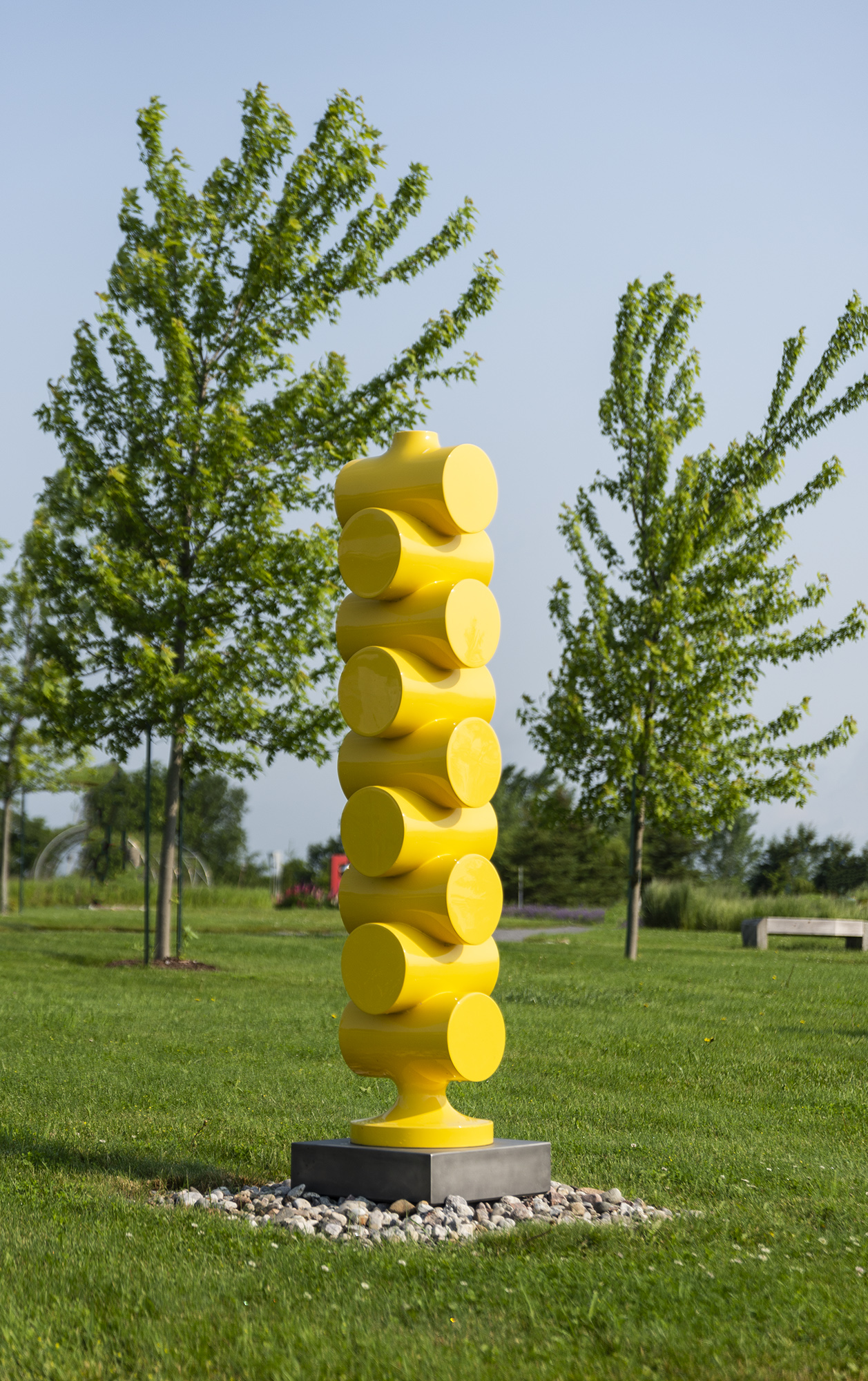 Forged from stainless steel, this contemporary outdoor sculpture is by Alexander Caldwell.The Alberta artist favours sculpting with metal and creating clean lines that are rendered in a vivid palette. The form of this playful piece–a tower of stacked logs is inspired by nature. The industrial material is coated in a brilliant shiny yellow automotive or oilfield paint. It stands an impressive 76 inches (193 cm.) high.