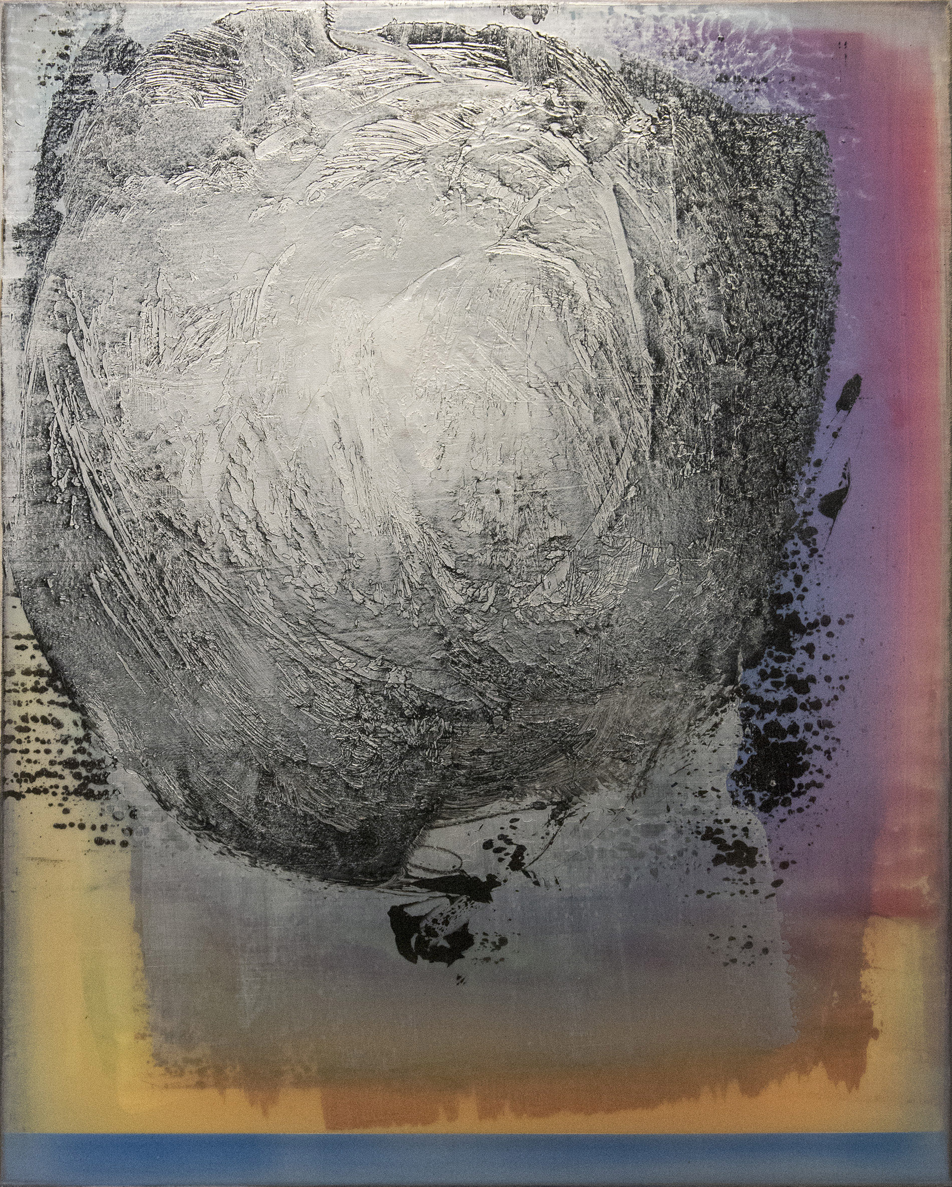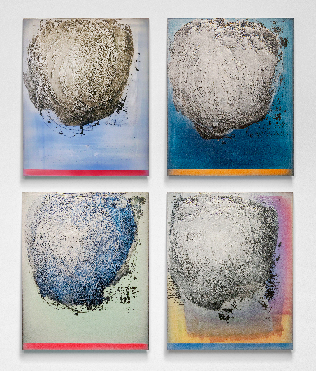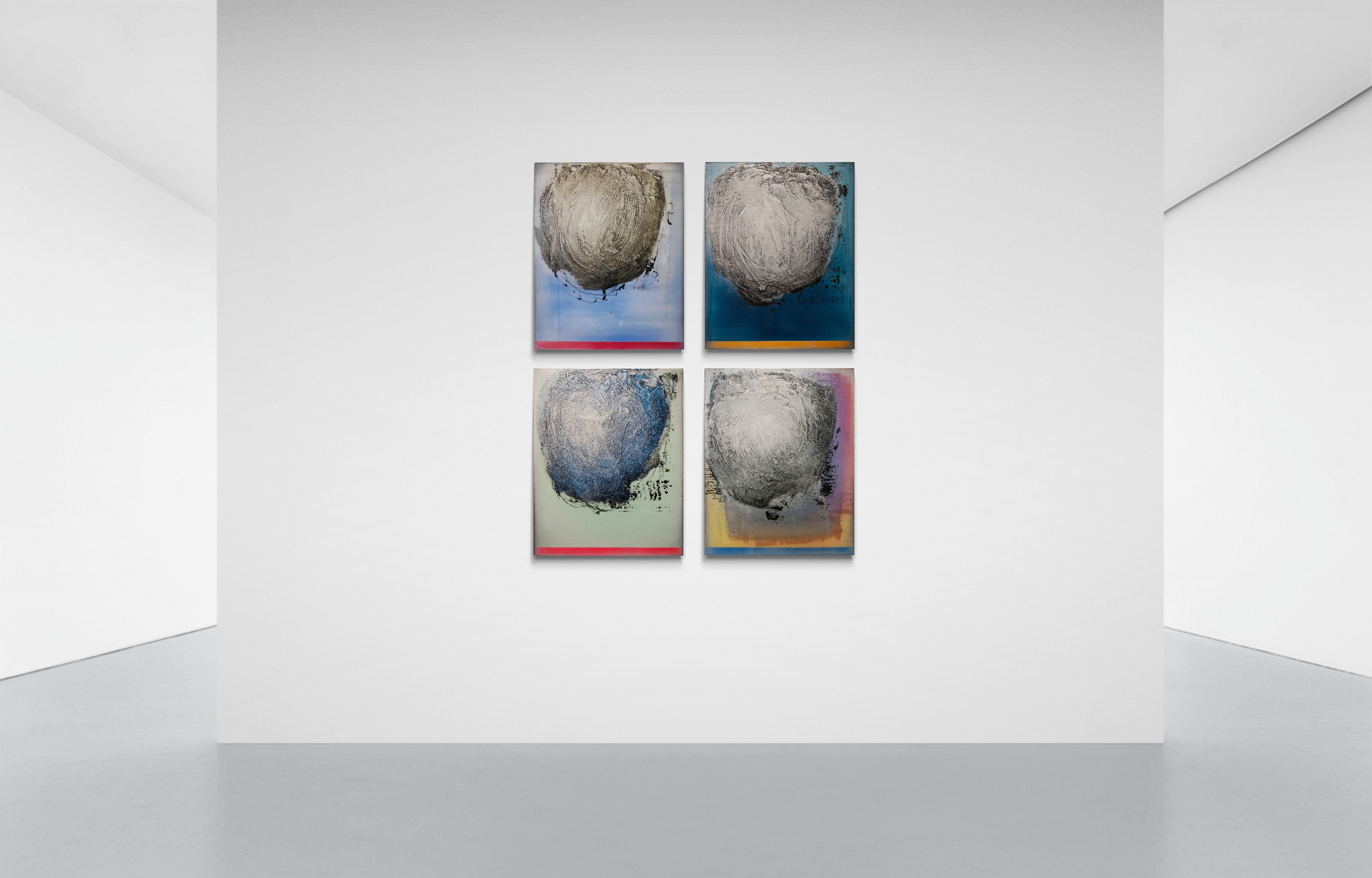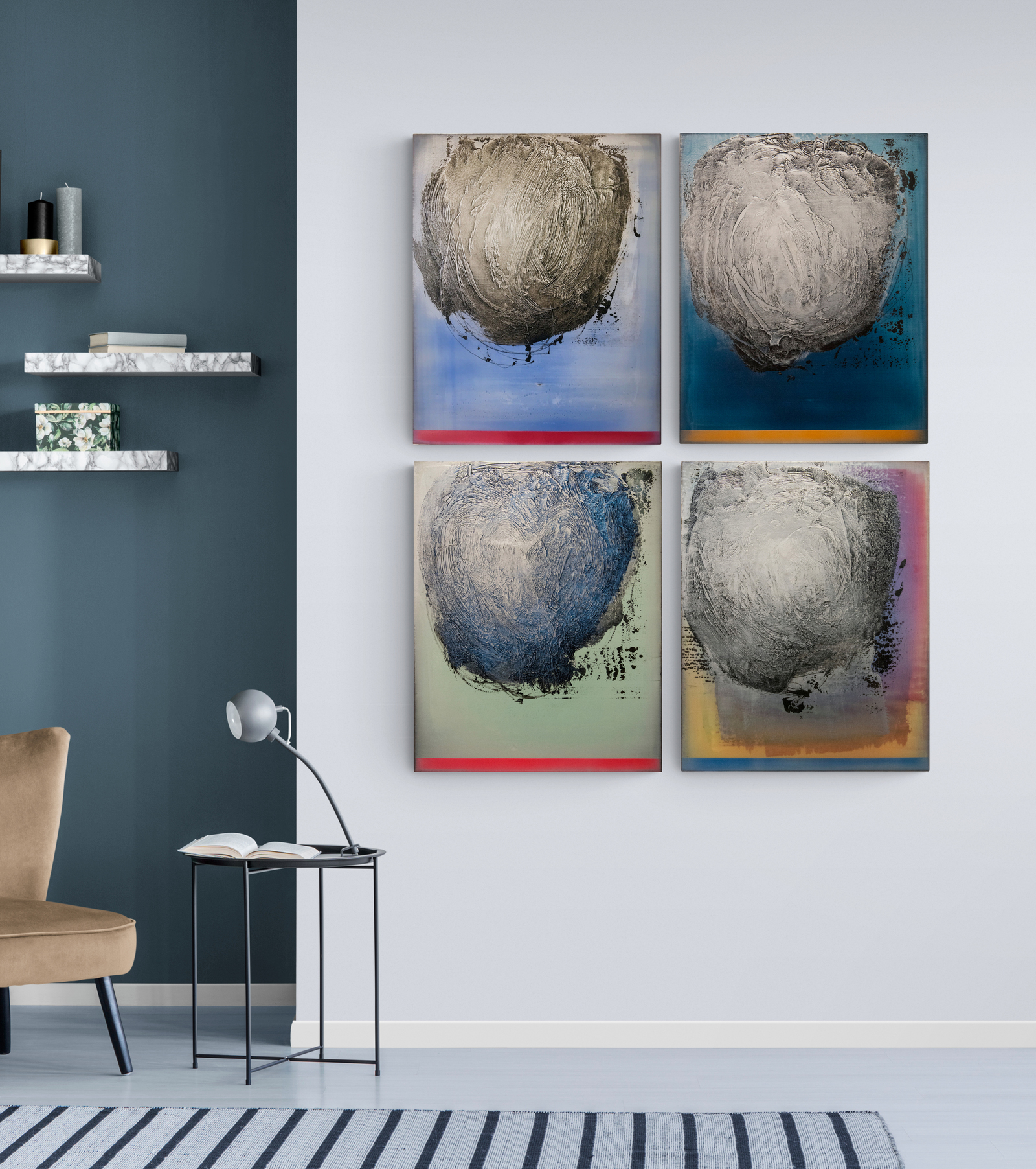 Paris-born Alice Teichert is known for her bold, ethereal and luminous graphic artwork inspired by a background in art, music and literature. These four panels feature a whirlwind of steel gray that appears holographic in depth, played against a backdrop of cerulean, pink, orange and turquoise. Each panel has burnished layers of acrylic pigment underlined by a bright horizon and grounding lines of sunlit oranges, blues and reds. Simply gorgeous.The four panels installed on the wall measure approximately 65 H x 53 W inches. Each panel is 30 x 24 inches.