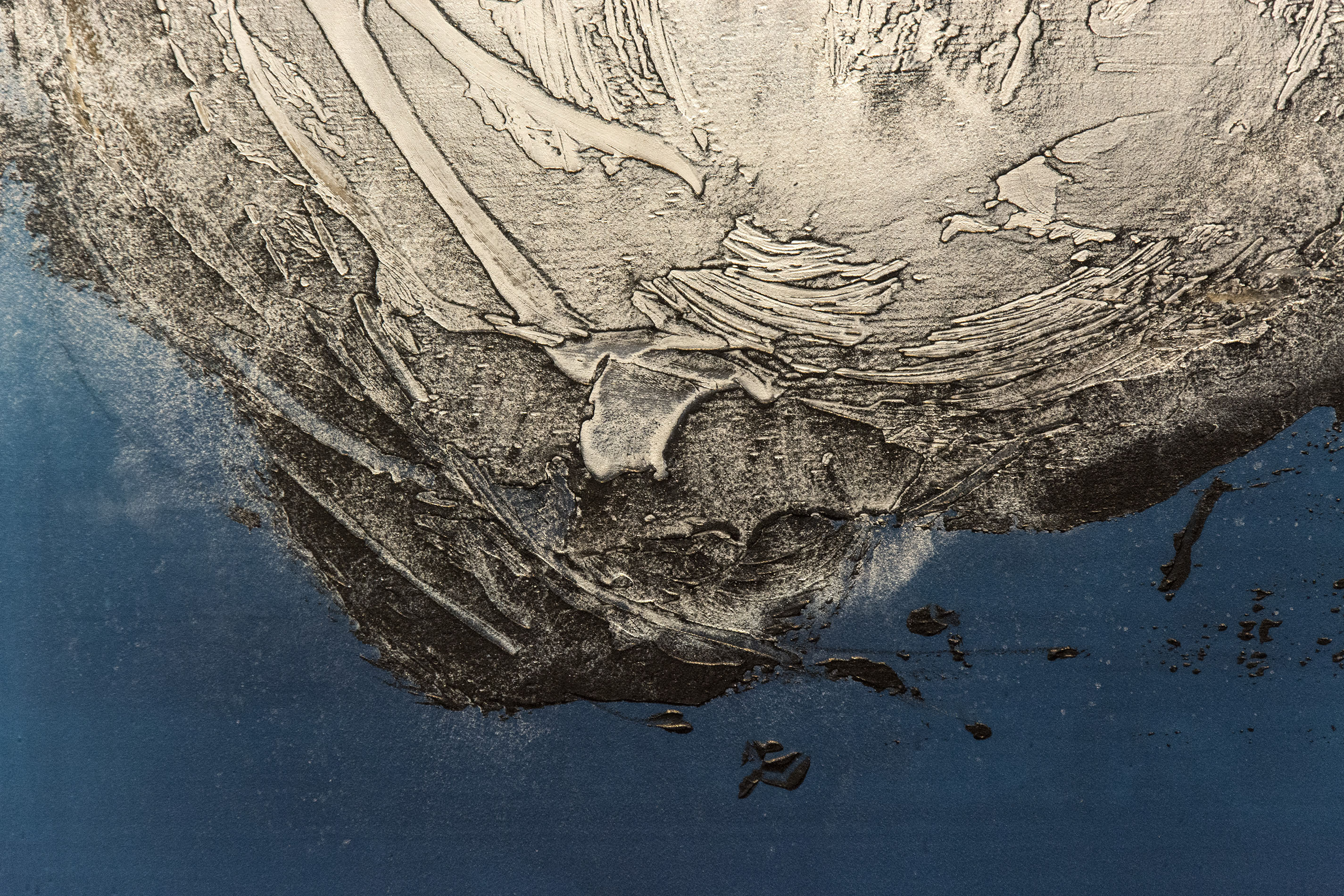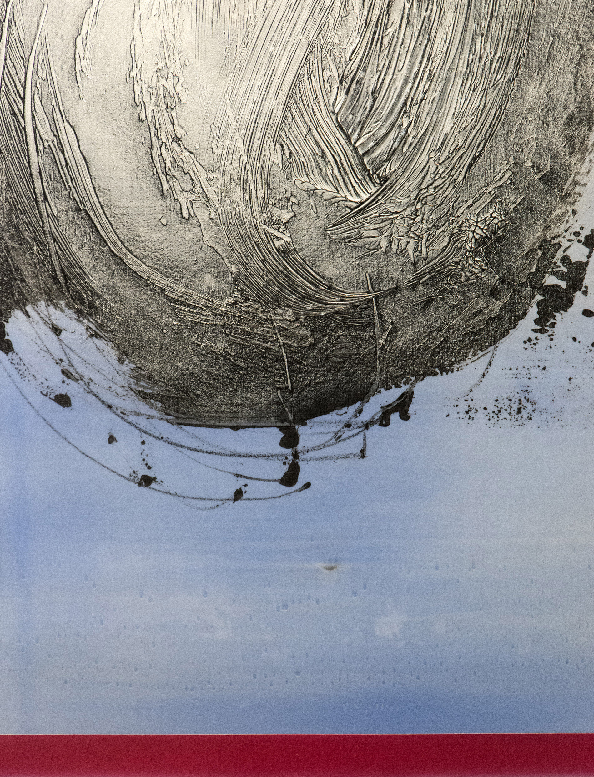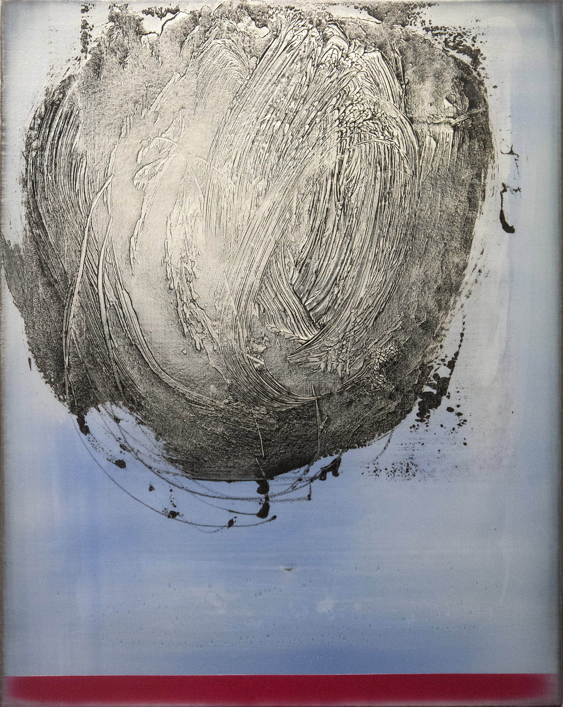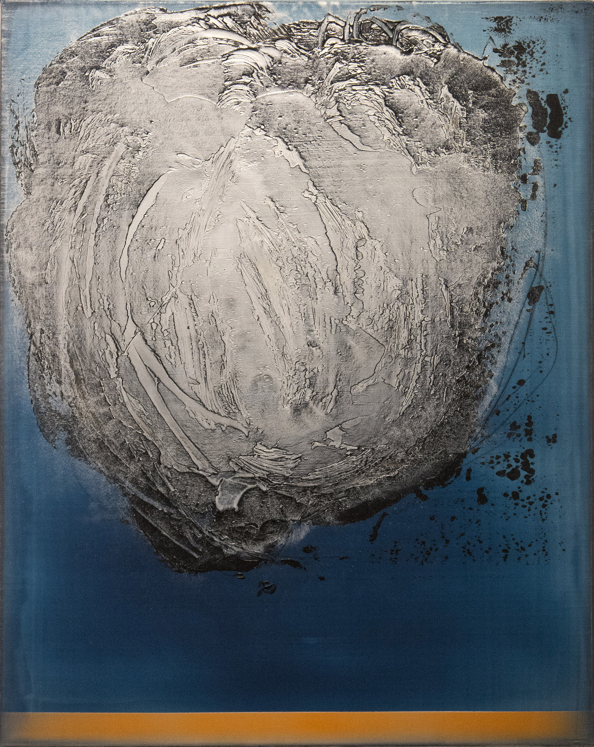Paris-born Alice Teichert is known for her bold, ethereal and luminous graphic artwork inspired by a background in art, music and literature. These four panels feature a whirlwind of steel gray that appears holographic in depth, played against a backdrop of cerulean, pink, orange and turquoise. Each panel has burnished layers of acrylic pigment underlined by a bright horizon and grounding lines of sunlit oranges, blues and reds. Simply gorgeous.The four panels installed on the wall measure approximately 65 H x 53 W inches. Each panel is 30 x 24 inches.