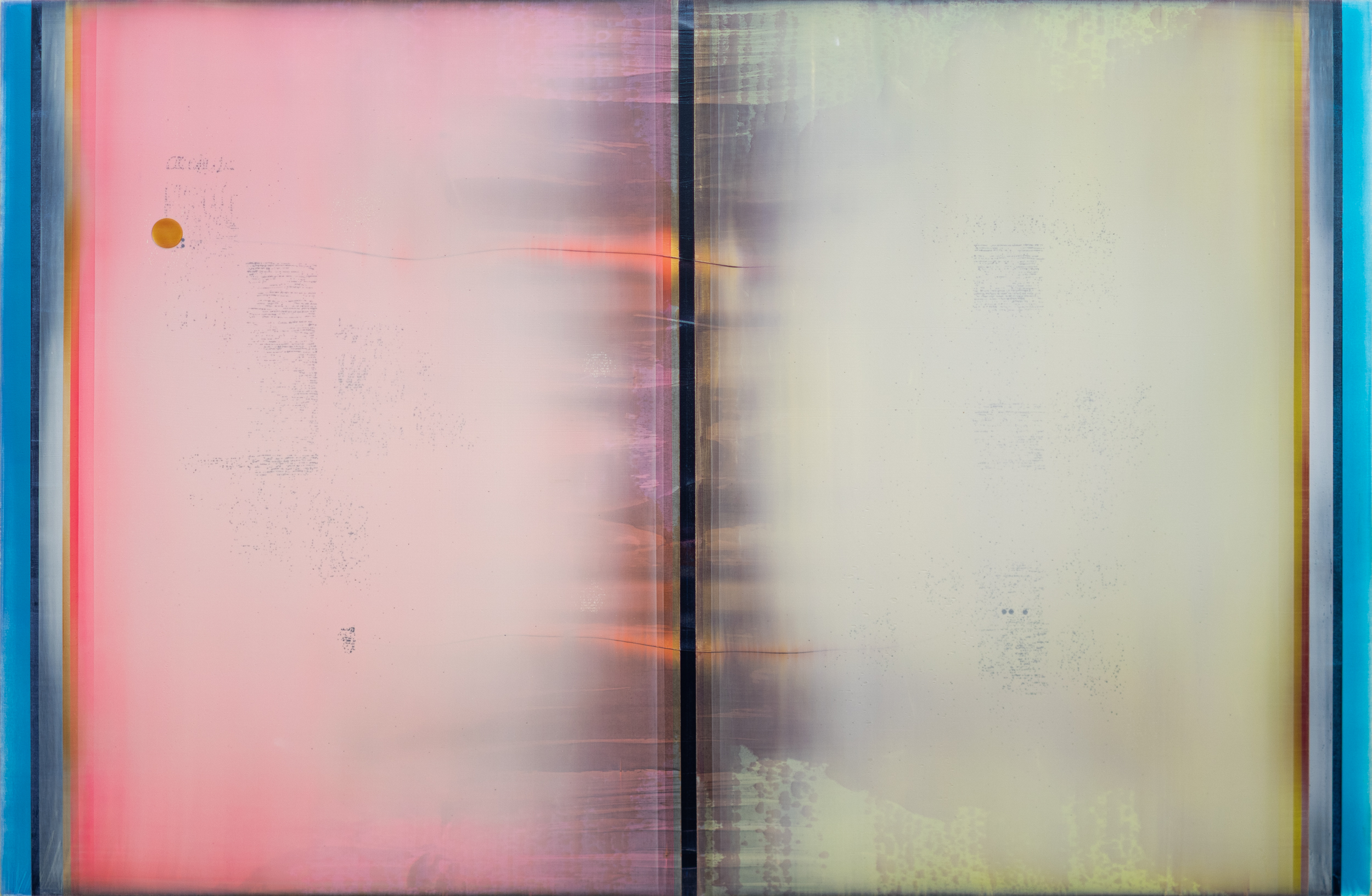 This contemporary abstract painting by Alice Teichert shines like the sun.The radiant imagery of this Canadian artist is achieved through the meticulous application of layer upon layer of translucent pigment. Alice Teichert’s artwork is exceptionally luminous, a quality she associates with energy, motion and the feeling of joy. Central Sun features two large panels of colour—rosy hues and pale yellow. Divided by a clean vertical line in black, flashes of phosphorescent orange and white appear in the center. Borders frame the work, adding both complementary and contrasting colours—deeper tones of golden yellow, burgundy, lavender, turquoise, bright pink, and deep blue. A single bright orange dot appears on one panel—a strategic focal point that draws the viewer’s eye and prompts us to pull back to see the work in its entirety. Remnants of text also appear through the haze of colour…just barely legible, a historical reference and a reminder of Teichert’s background in printmaking and love of books.