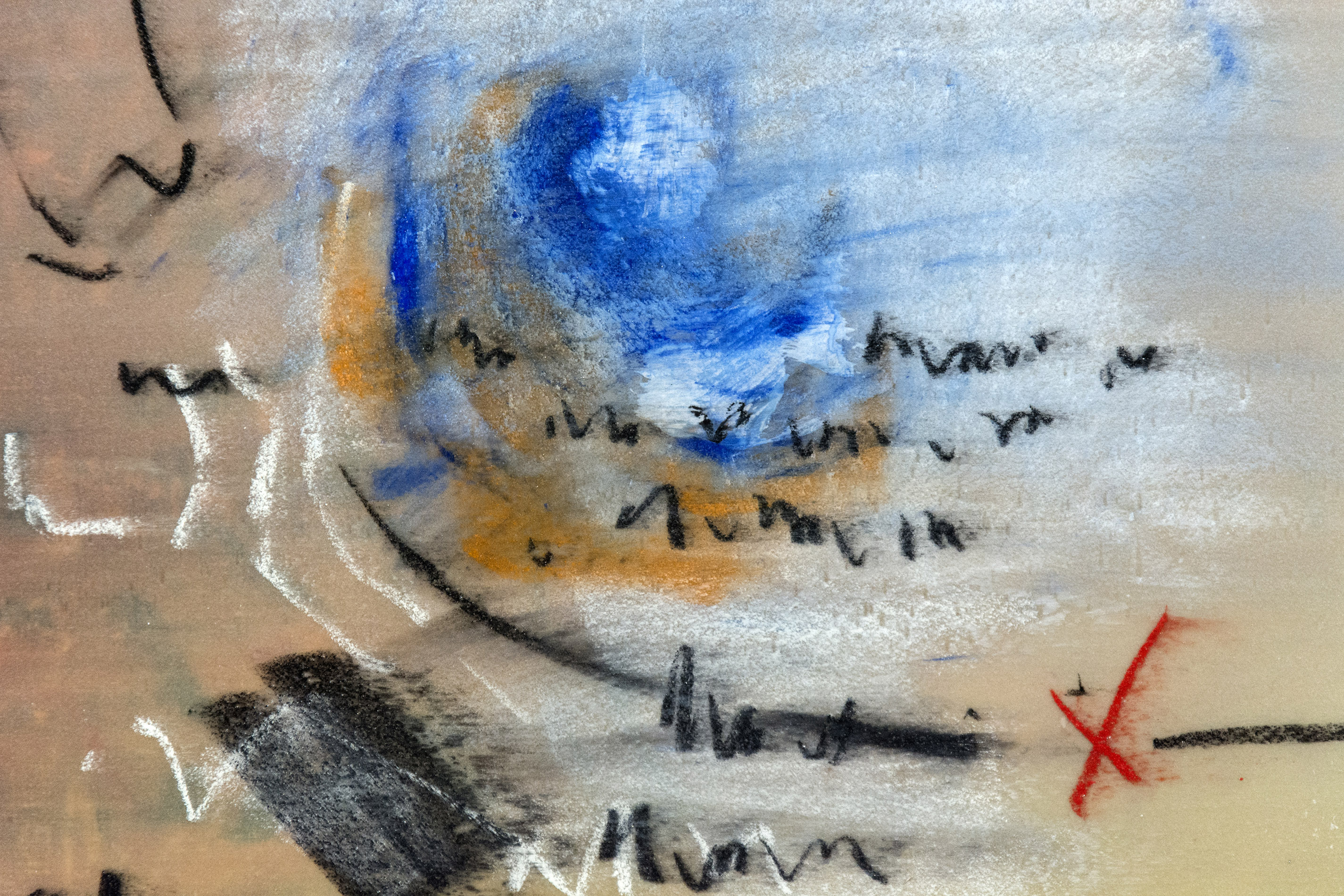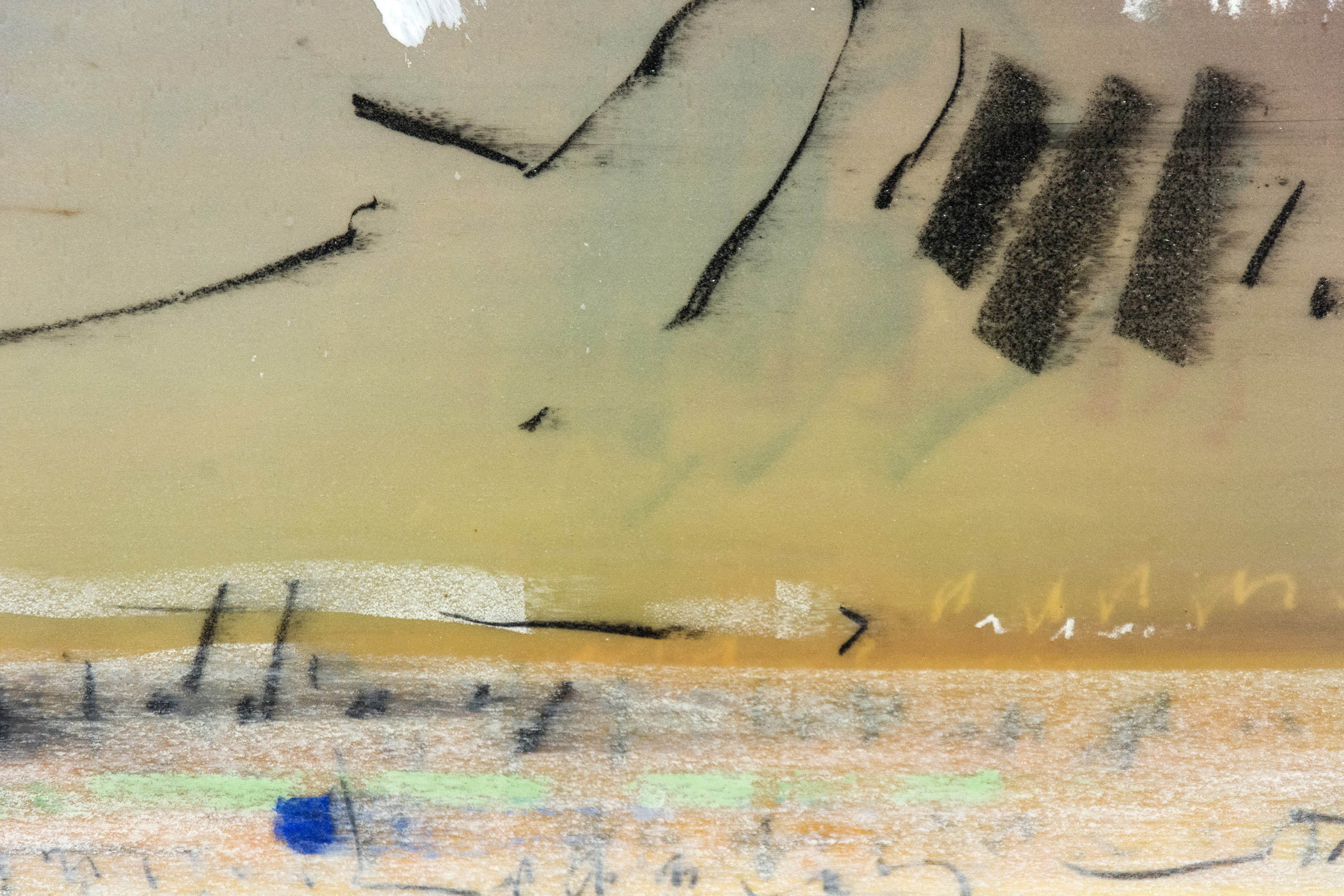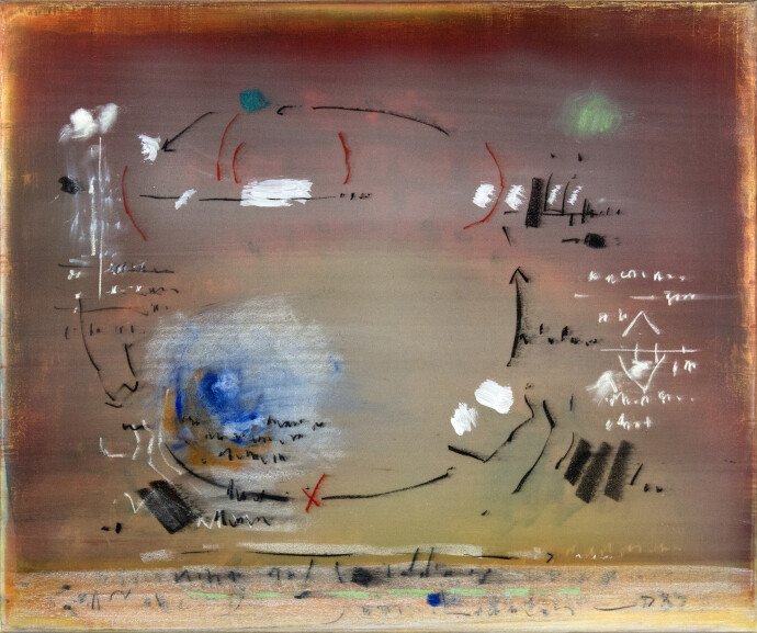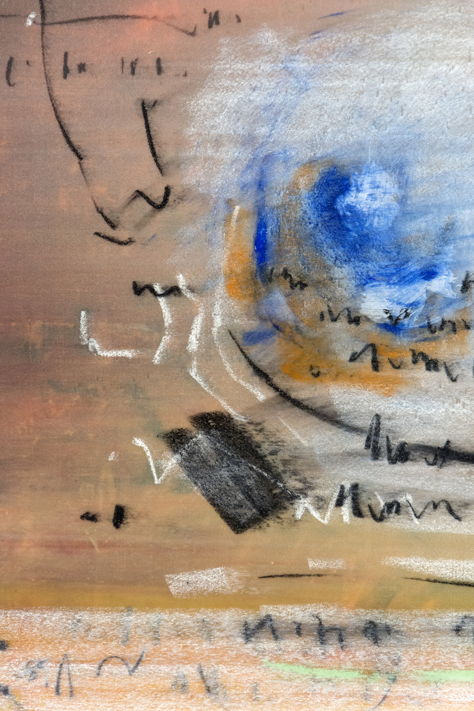 Swirling calligraphic marks and symbols swirl at the centre of a burnished warm ground in this luminous canvas by Alice Teichert. The artist works with thin layers of acrylic gel and pigment to produce a shimmering, jewel-like surface interspersed with gestural and musical notations, which she refers to as visual poetry.Alice Teichert, RCA, was born in Paris, France, in 1959. She studied music, philosophy and visual arts in Belgium and France. Since 1989, she has built an international career with over 40 solo exhibitions in Canada, France, Switzerland, Germany and Australia.