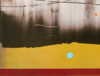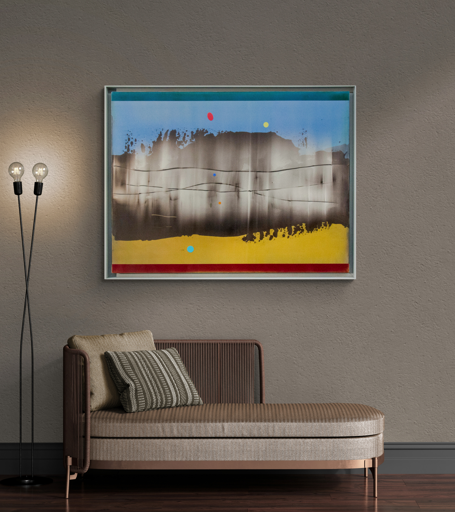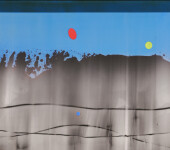 A vivid green shifts into deep blue beneath a dynamic mix of grey and black. Running through the center, a series of flowing lines seems to both connect and divide the space, suggesting a story that continues beyond the edges of the canvas. There’s a sense of movement and direction, inviting the viewer to follow along.In this work, Teichert explores a new medium and colour palette, bringing a quieter, more nuanced approach to her visual language. Her signature line is still bold, but here it acts more like a subtle break between forms—a place where light seeps in. Soft streaks of white pigment draw the eye outward into fields of rich, layered colour.