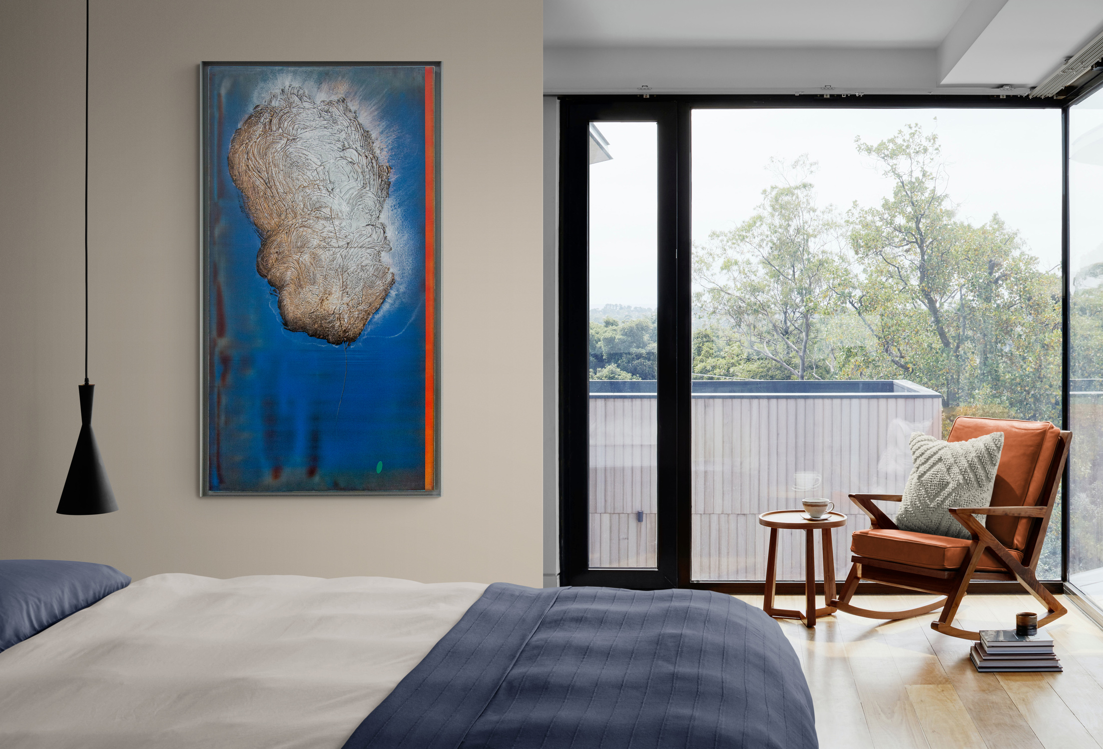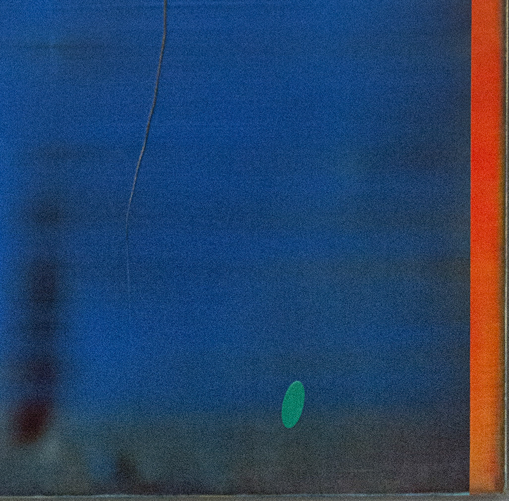 Going Deeper stands out from the rest of Teichert's Connectivity series thanks to its unique orientation, which gives the piece a strong sense of downward movement, like falling or sinking beneath the surface. Unlike some of her other works where the central orb rises and seems ready to burst with energy, here the orb feels heavier and more grounded, gently settling into the deep blue background.A flowing line—one of Teichert’s signature elements—moves through the painting much like a smooth sine wave, creating a sense of rhythm and connection across the series. Sometimes it runs along what feels like a horizon; other times, it forms into a glowing orb that seems to echo something vast and distant, like a planet seen through a telescope.