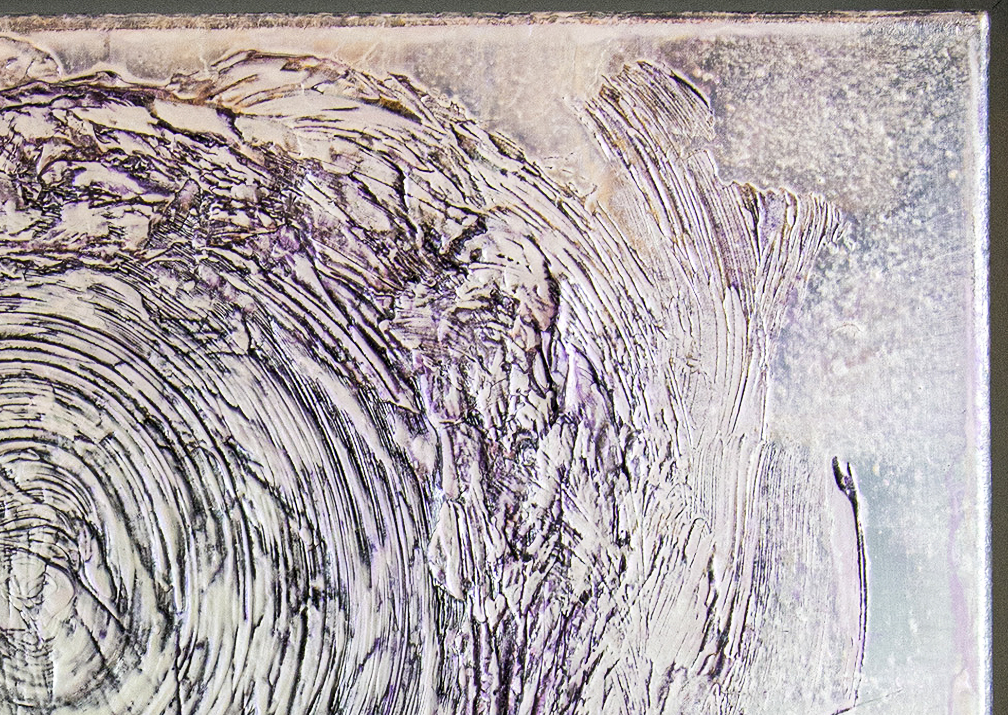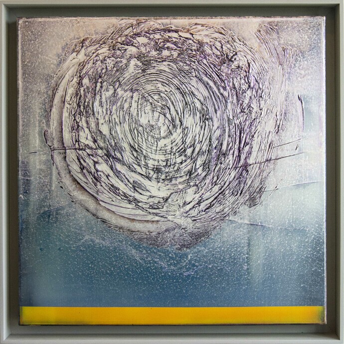 Helio glows with bright white light and a radiant warmth, like the sun on a perfect summer afternoon. There’s a sense of calm and contentment in its energy—simple, steady, and uplifting.As in the rest of the Connectivity series, Teichert uses her signature painterly line to tie the work together. Flowing like a sine wave, the line creates a rhythm that runs through each piece, linking them into a cohesive whole. Sometimes it moves across the canvas like a horizon; other times, it forms into a luminous orb—something distant and cosmic, like a glimpse of the universe through a telescope.