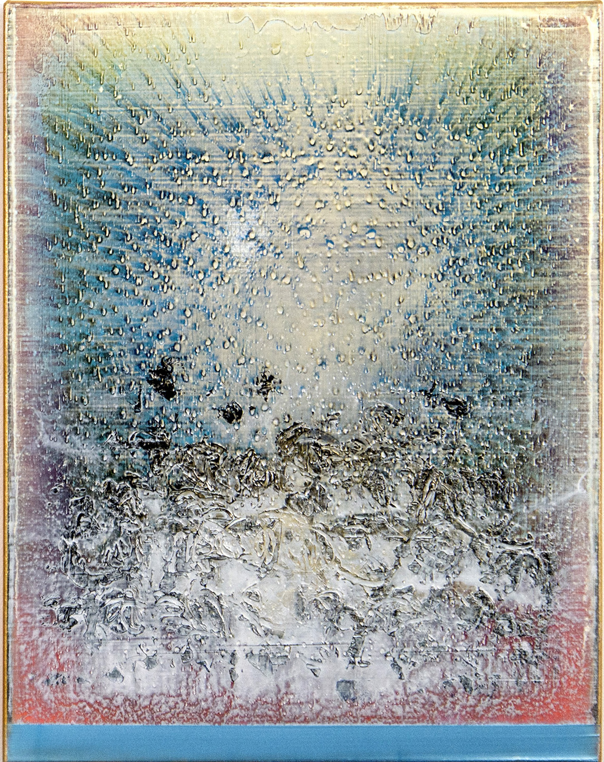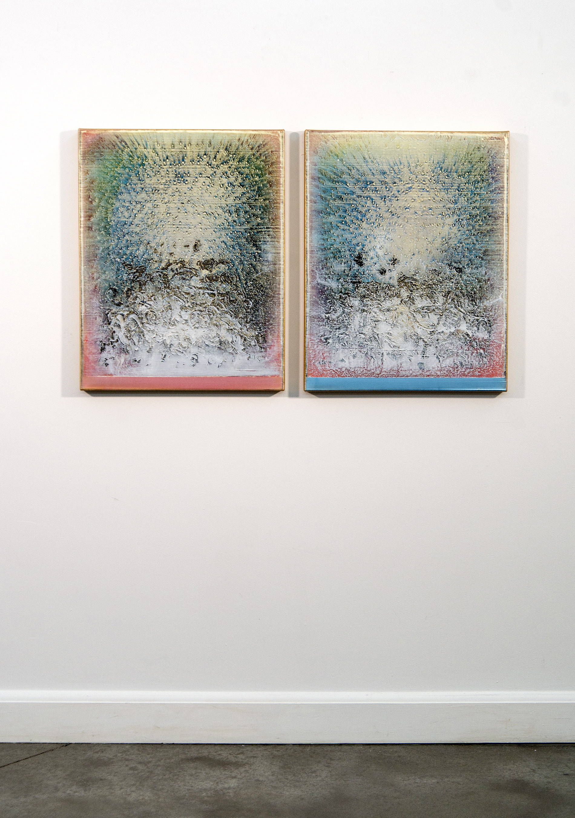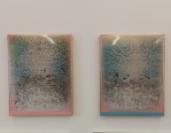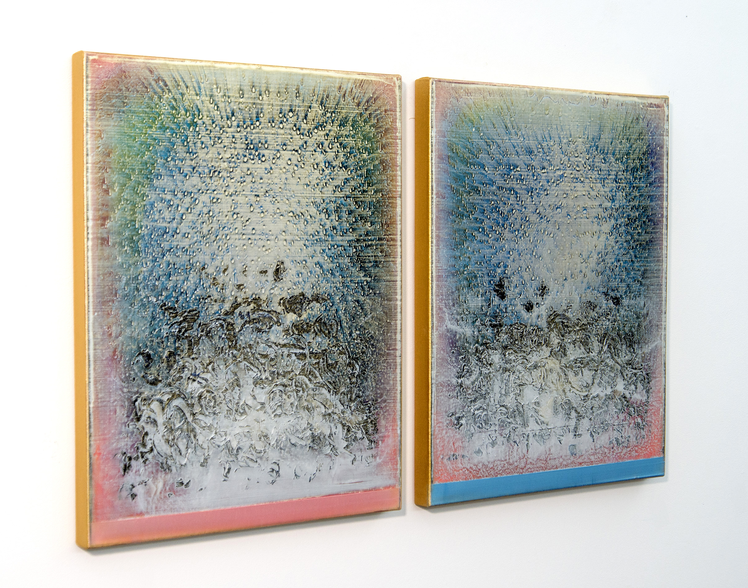 The radiance of a smile seems to be symbolically captured in the silvery, shiny multiple layers of this gorgeous duo by Alice Teichert. In these elegant compositions, Teichert uses translucent acrylic gels in blues, yellows, and salmon that naturally reflect light.“I’m always exploring the double page…the hues, the colour…I use colour as a language.” Alice Teichert