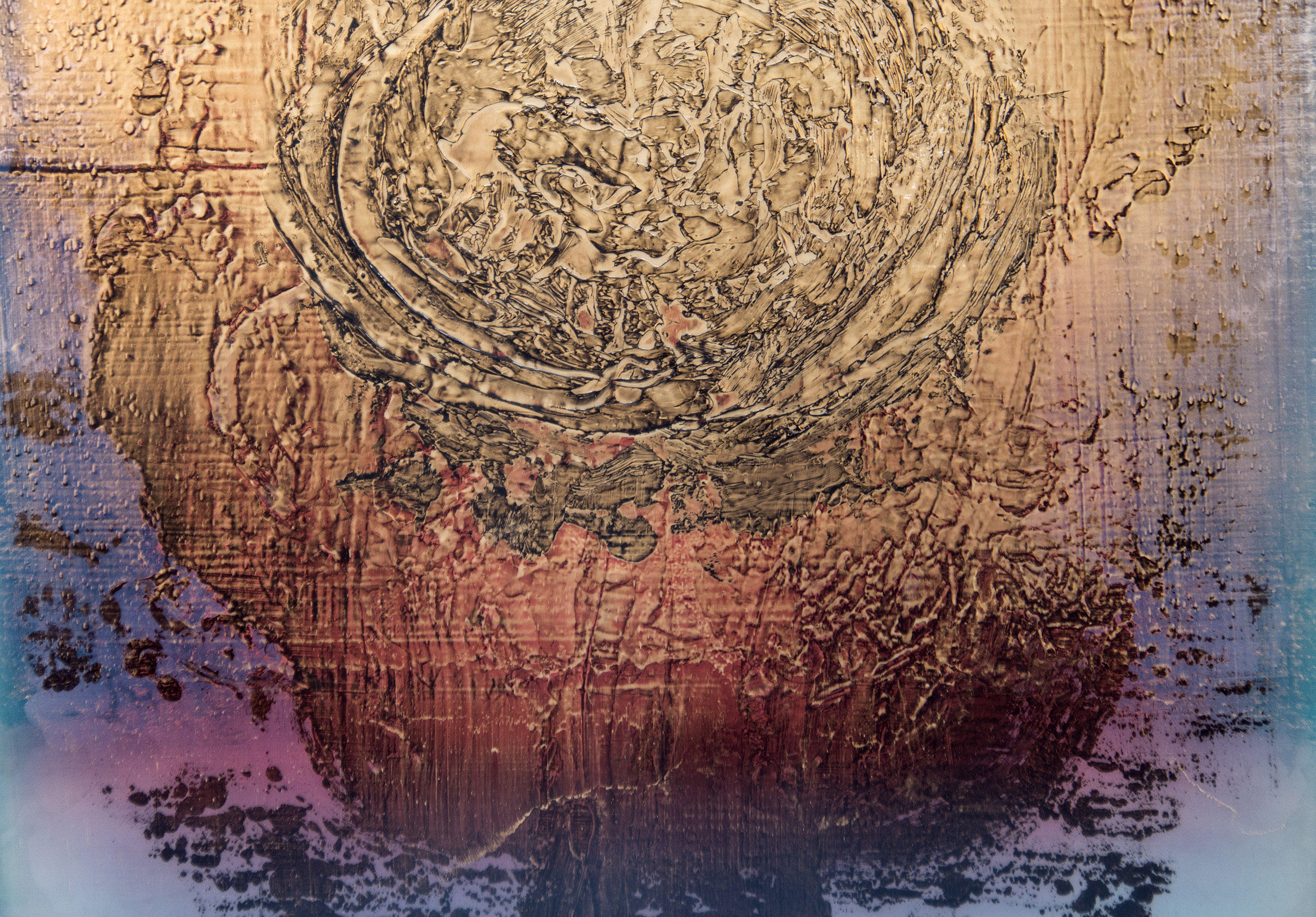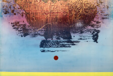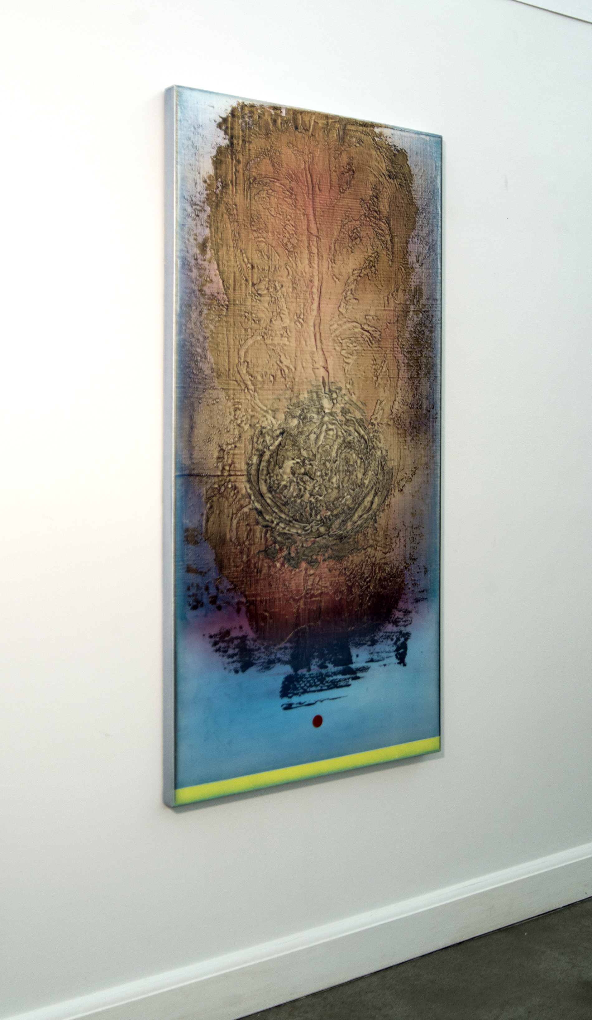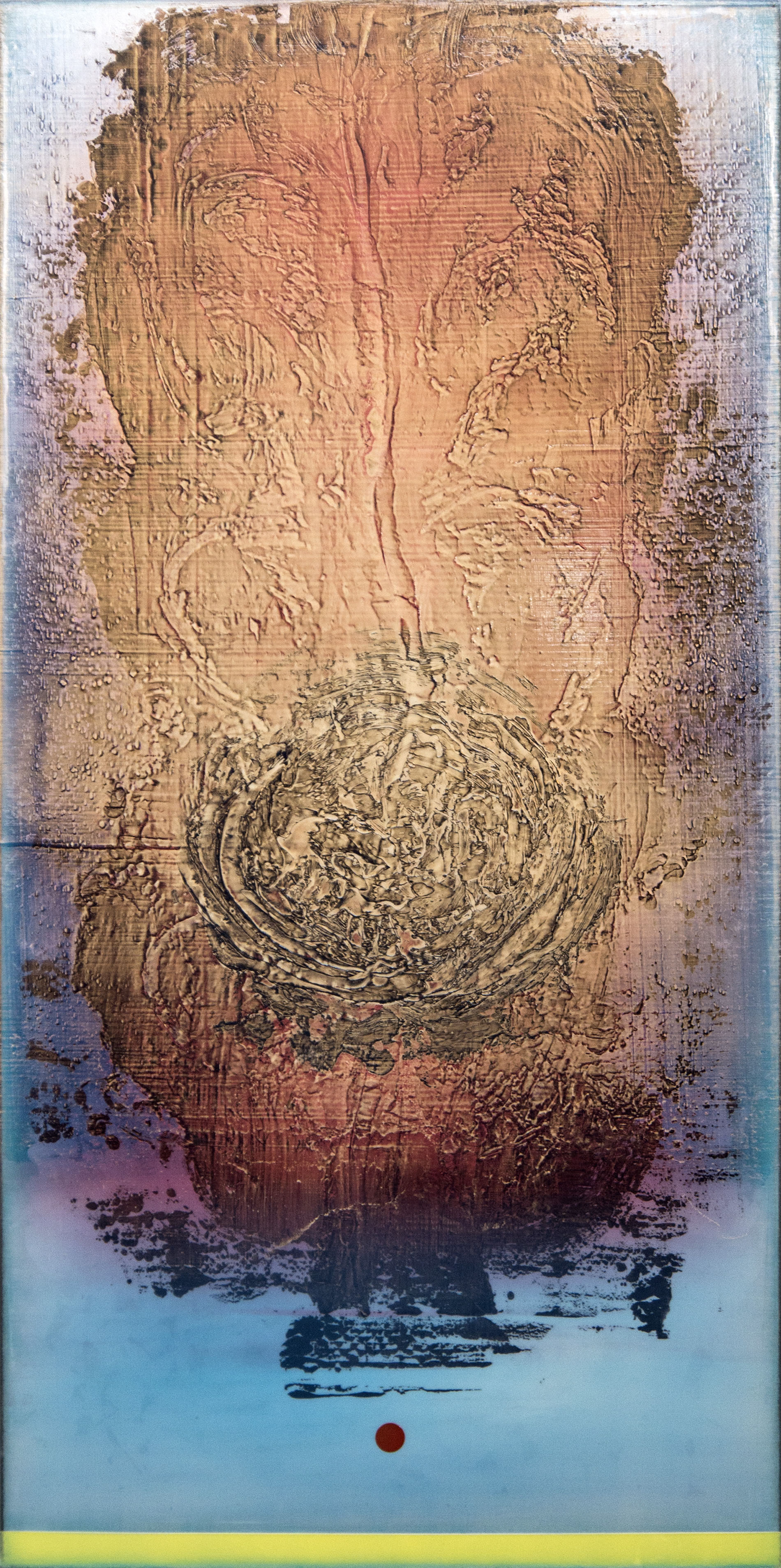 Using a glorious tapestry of rich colours…burnished copper, yellow, red, purple and blue, Alice Teichert’s acrylic painting, “Offering” seems to evoke images of ancient offerings made to appease the gods. Layers of iridescent gels add depth, texture and movement to this beautiful piece. The use of a single, small red dot anchors the work and encourages the viewer to look upward.“Teichert composes her own visual poetry inspired by music, language and colour that seeks to provide a point of entry to transport and transform the viewer.” Elisa Coish, curator