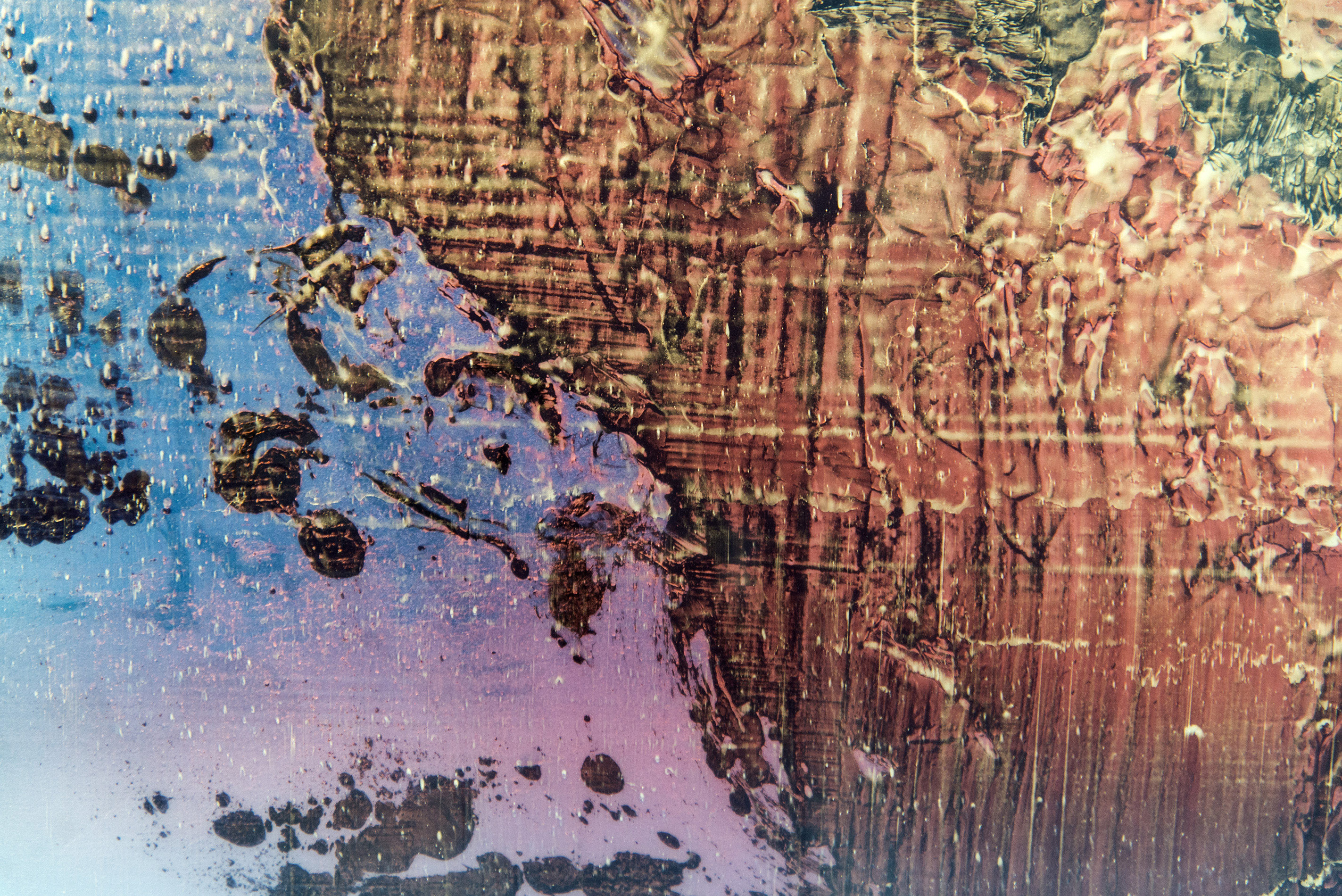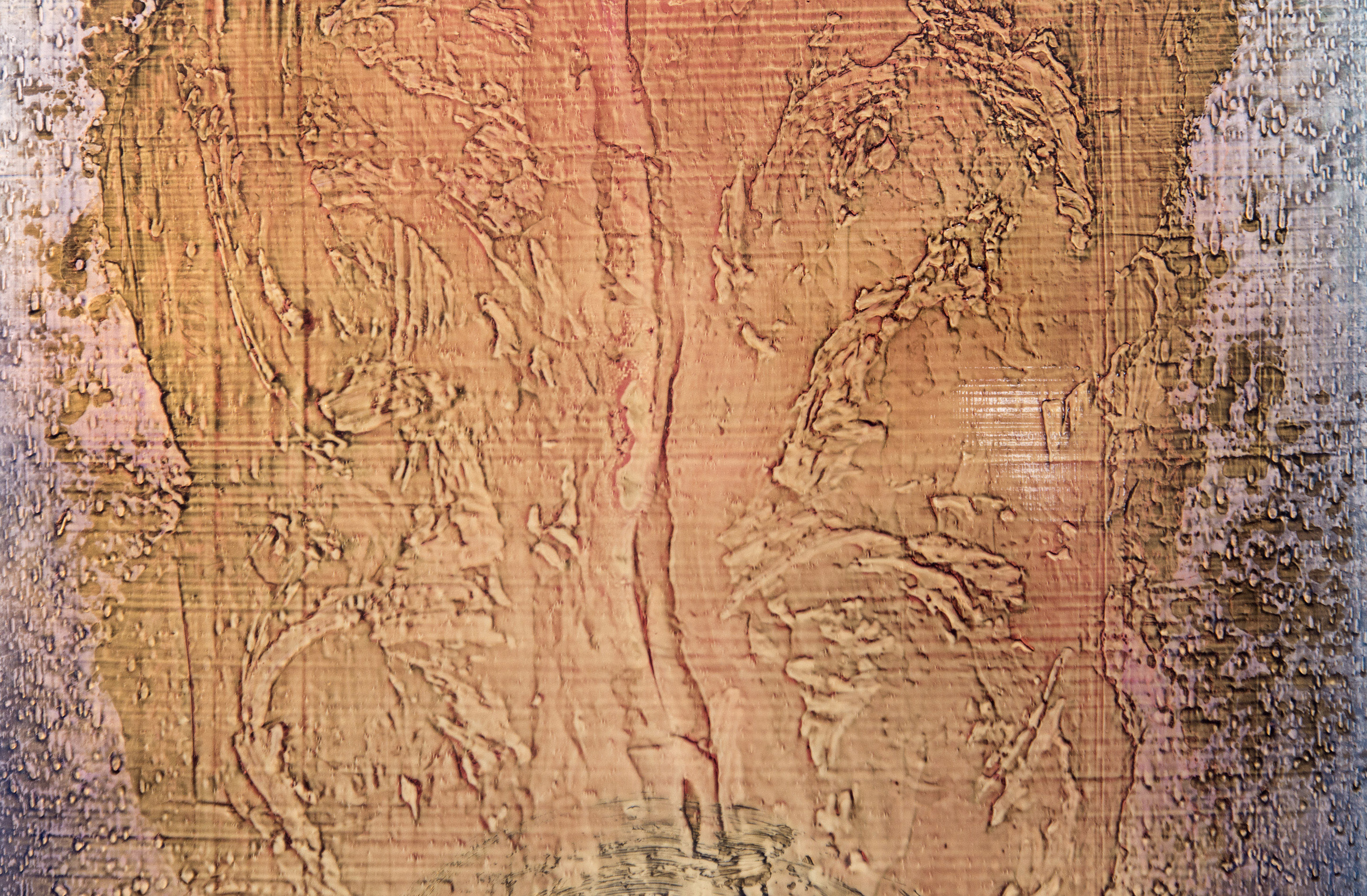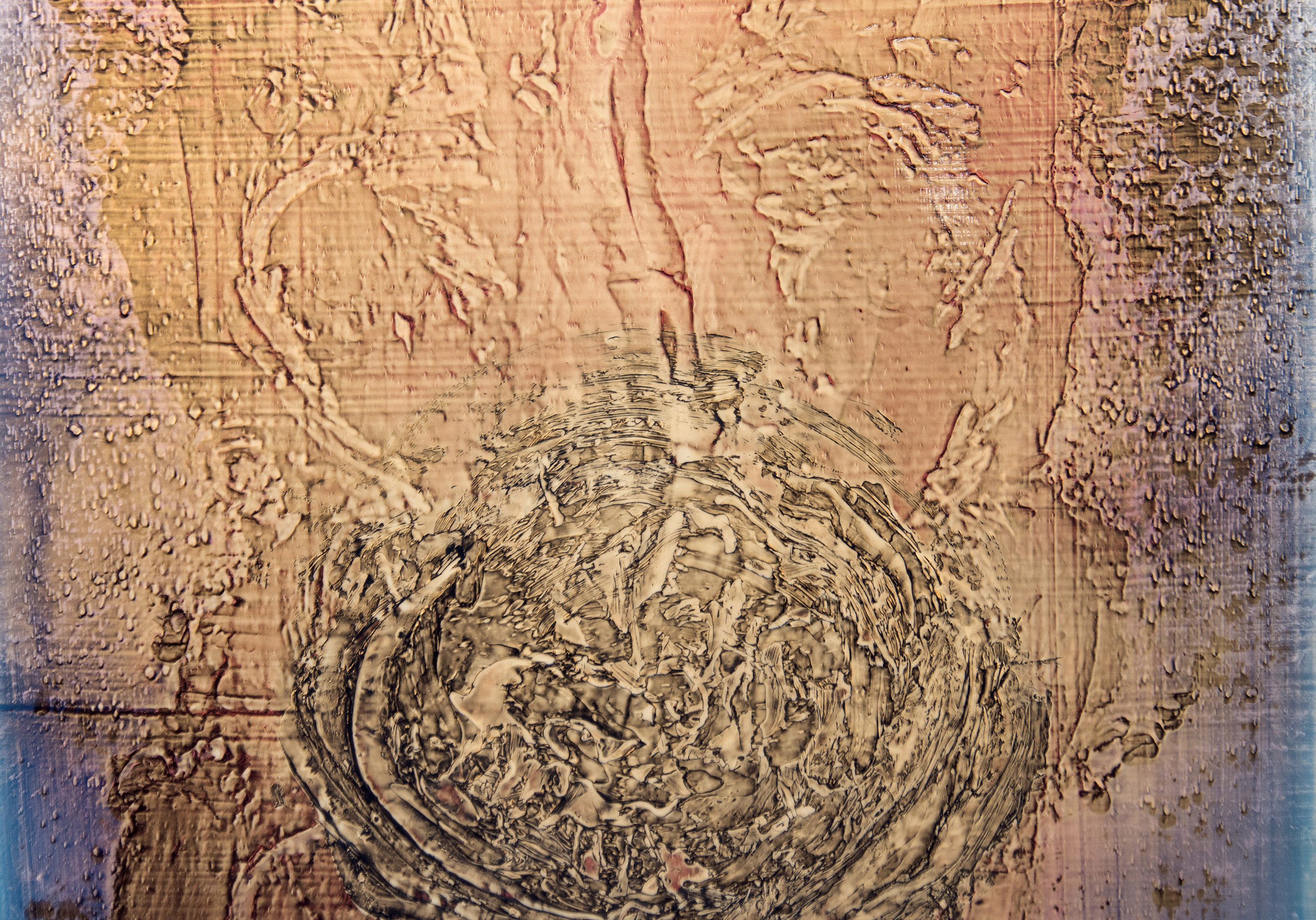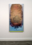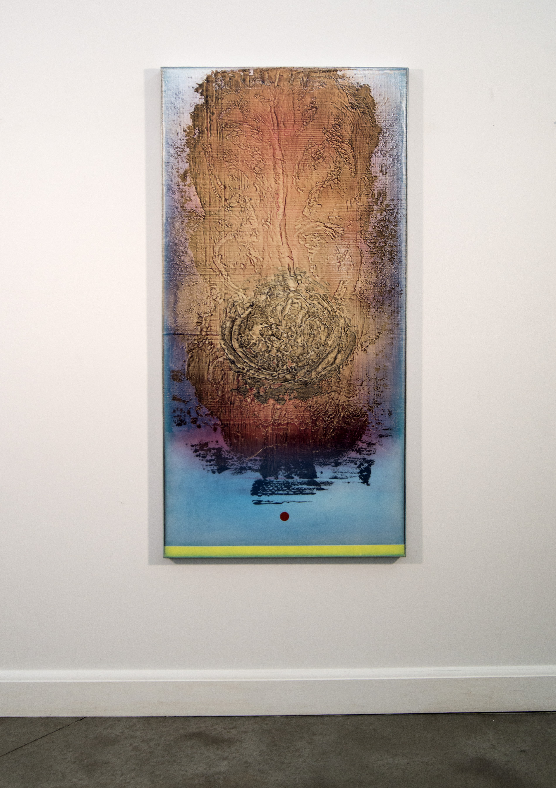 Using a glorious tapestry of rich colours…burnished copper, yellow, red, purple and blue, Alice Teichert’s acrylic painting, “Offering” seems to evoke images of ancient offerings made to appease the gods. Layers of iridescent gels add depth, texture and movement to this beautiful piece. The use of a single, small red dot anchors the work and encourages the viewer to look upward.“Teichert composes her own visual poetry inspired by music, language and colour that seeks to provide a point of entry to transport and transform the viewer.” Elisa Coish, curator