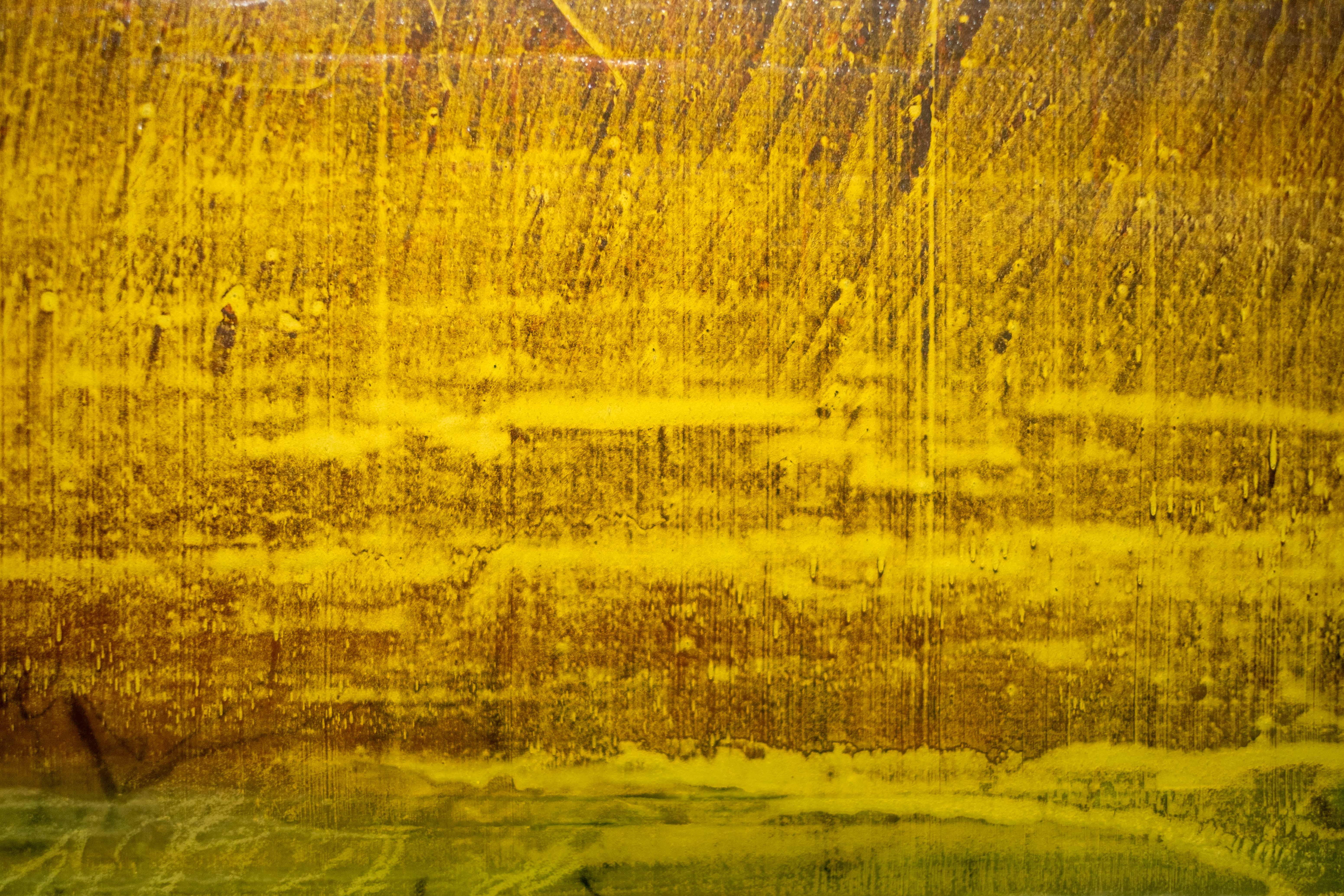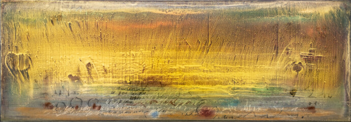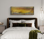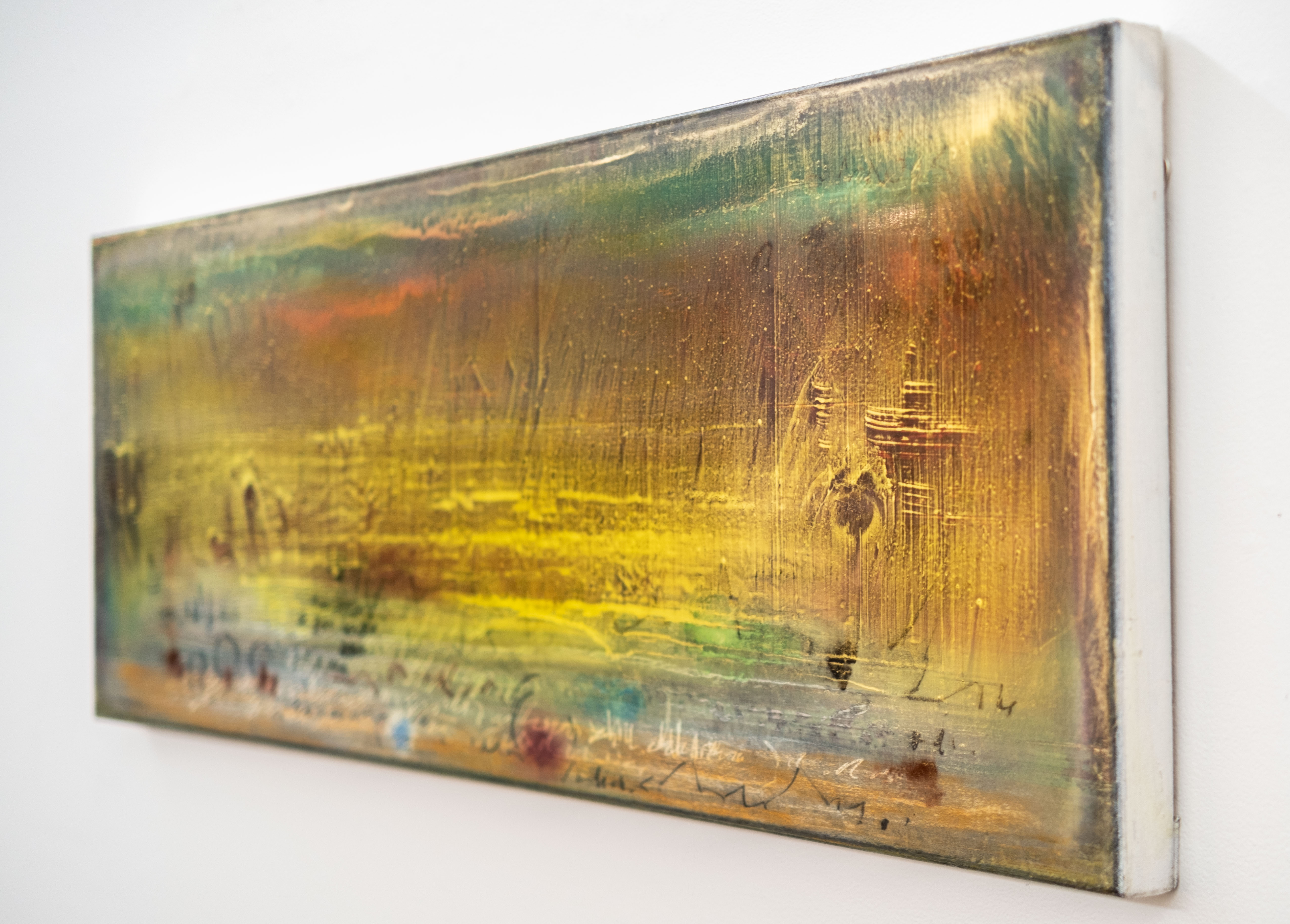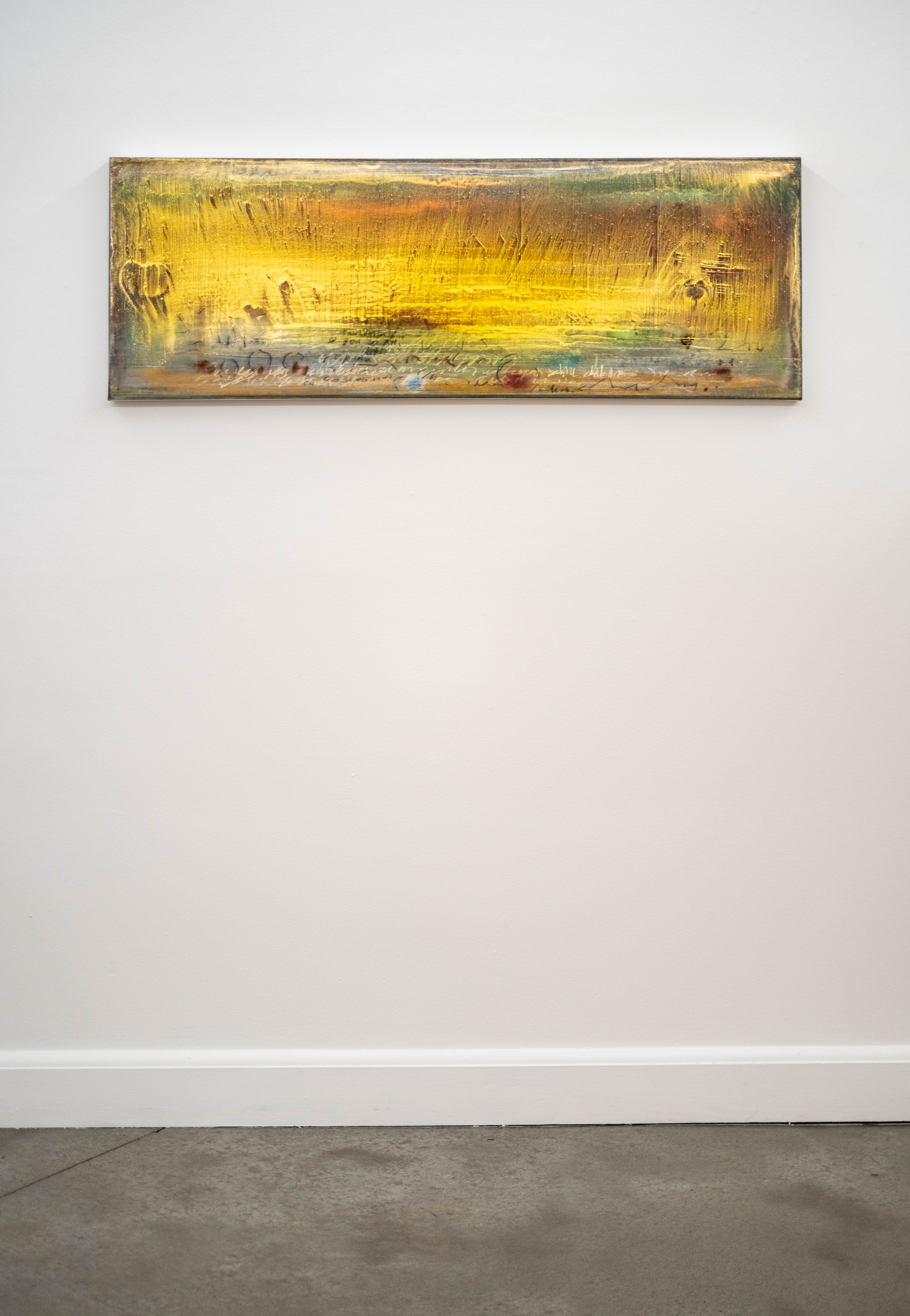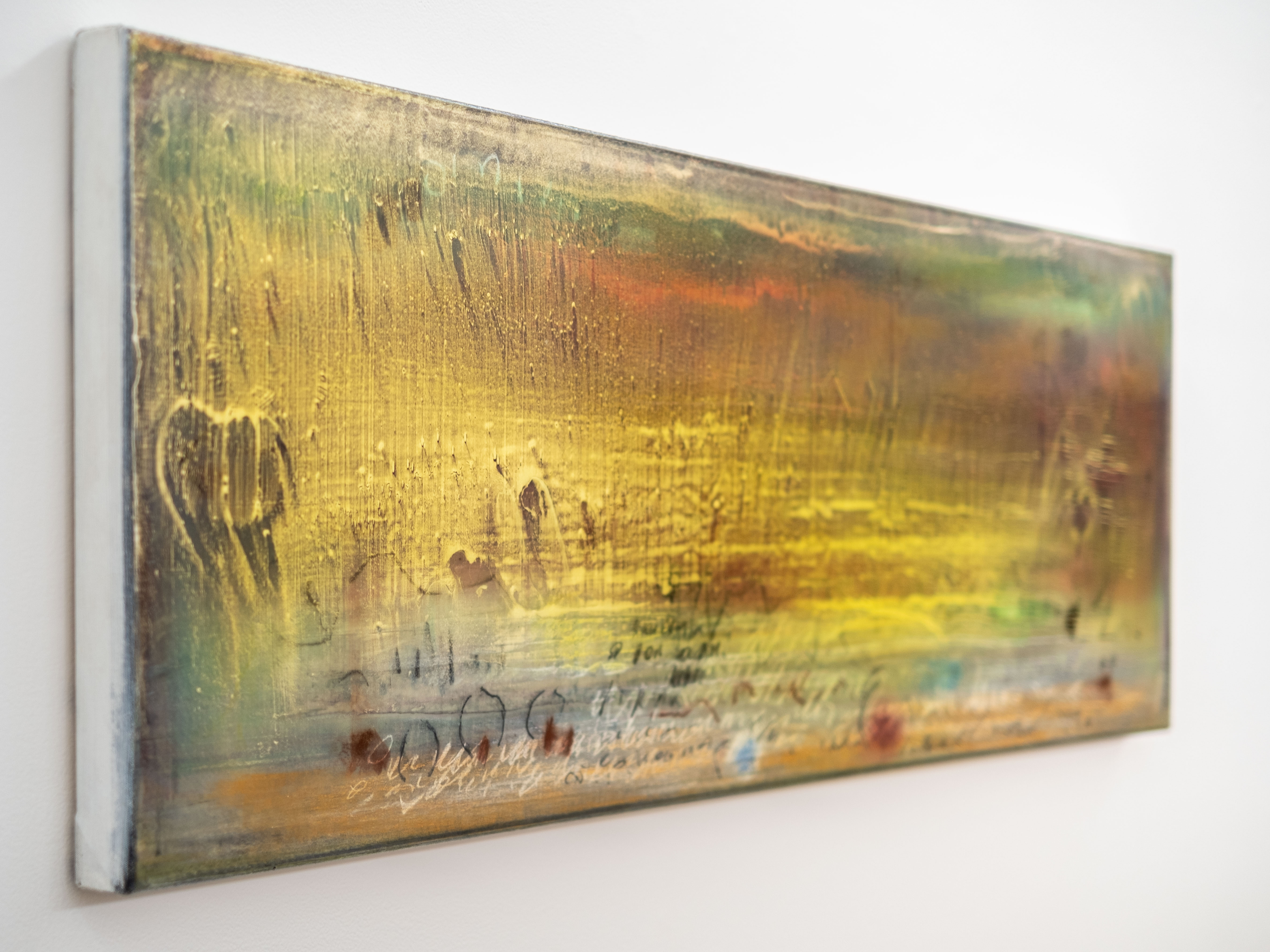 Layers of yellow-gold and sea green acrylic articulated with dynamic calligraphic taches unfold across this 4.5 feet long canvas like an illuminated scroll. The foot of the canvas is defined by black and white glyphic script that hints at a more deliberate communication.