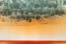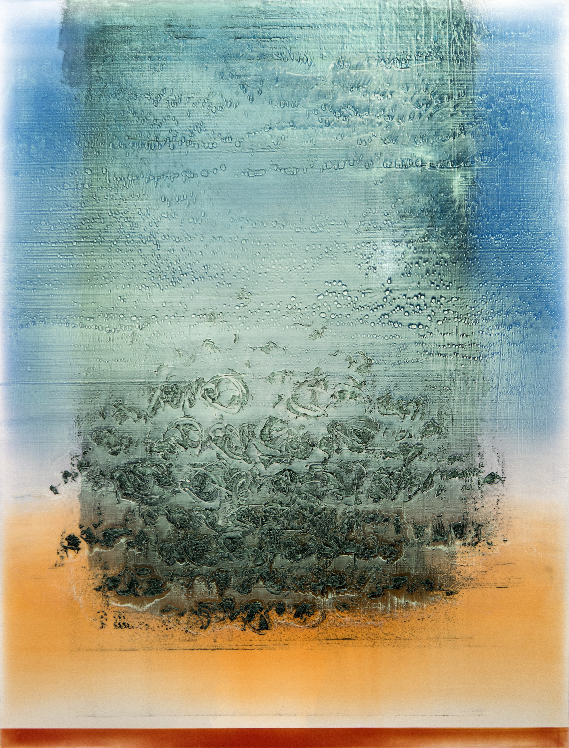 Alice Teichert’s luminous paintings are created using shiny, colourful gels meticulously applied in layers. Her work is influenced by a background in typography, as gestural imagery and naturally occurring air bubbles seem to emulate text. Colour— rich blues, green, and burnt orange enhance the gorgeous visual dialogue.“A painting has 1,000 words.” Alice Teichert
