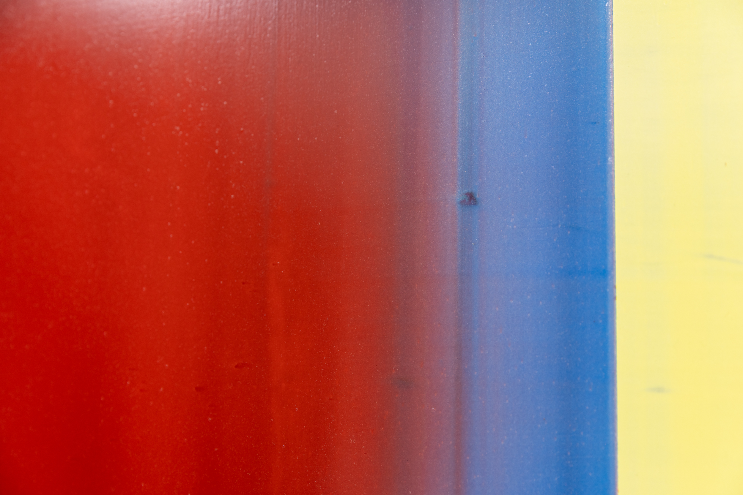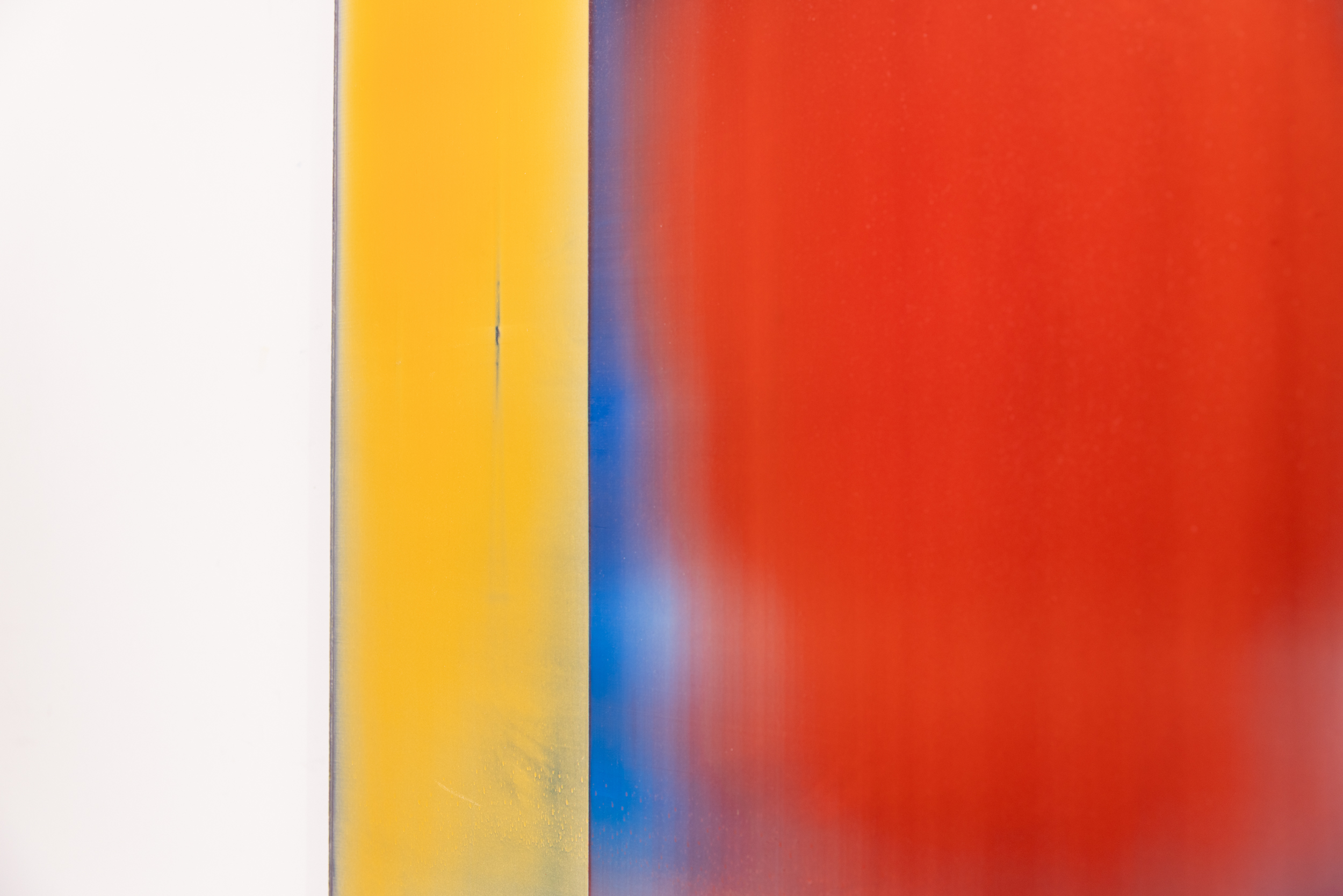 With Rewiring, Teichert is, once again, using colour to create ‘shape’—a central glowing image that appears as a fluid sphere in a rich red against a field of deep blue, framed by panels of melon and yellow. Throughout the canvas, the many layers of pigment give glimpses of other colours, and subtle markings add complexity and palpable energy to the work.