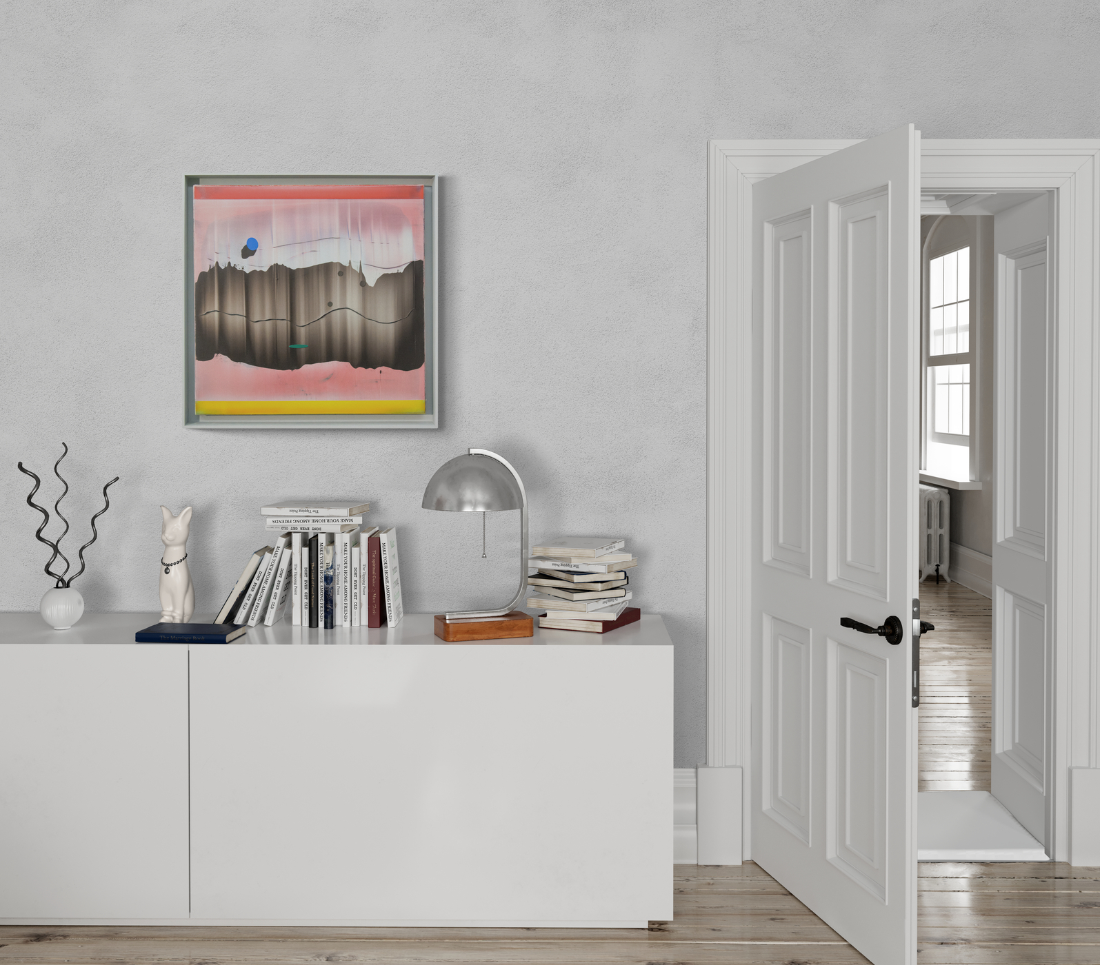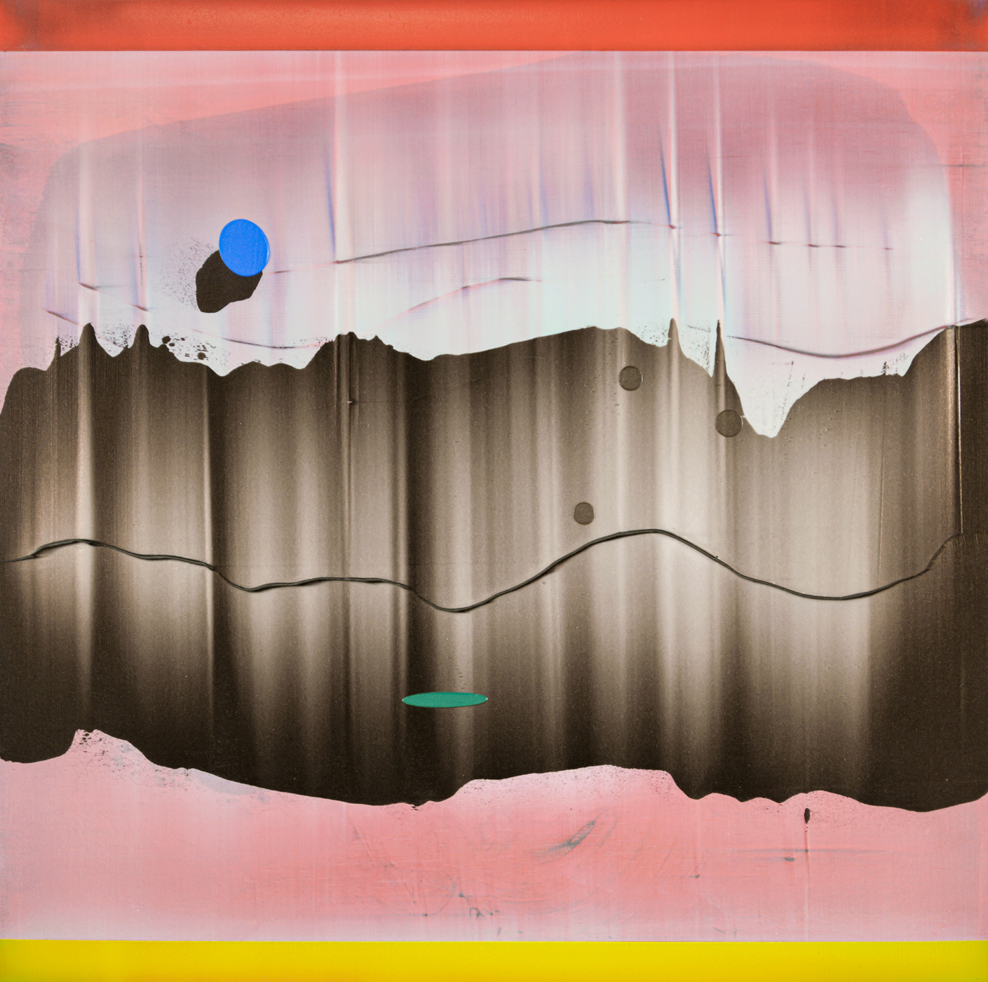 This colourfield, awash with peony pink, suspends a grey wave that appears as though it is passing through. Working with a new medium and a new palette, Teichert is communicating with us more subtly than ever before: her line, while viscerally present, offers itself as an absence-a fissure between forms; a crack where the light breaks through. Soft rays of white pigment filter out from the pulsing line and lead our eyes into fields of colour that are so fresh and so deep that you may have gotten lost in them were it not for the circular and oblong 'pauses' of solid colour points that bop through the paintings strategically like a metronome with its own agenda, leading your eye from place to place, drawing you in and out.Alice Teichert, RCA, was born in Paris, France, in 1959. She studied music, philosophy and visual arts in Belgium and France. Since 1989, she has built an international career with over 40 solo exhibitions in Canada, France, Switzerland, Germany and Australia.