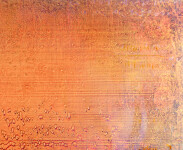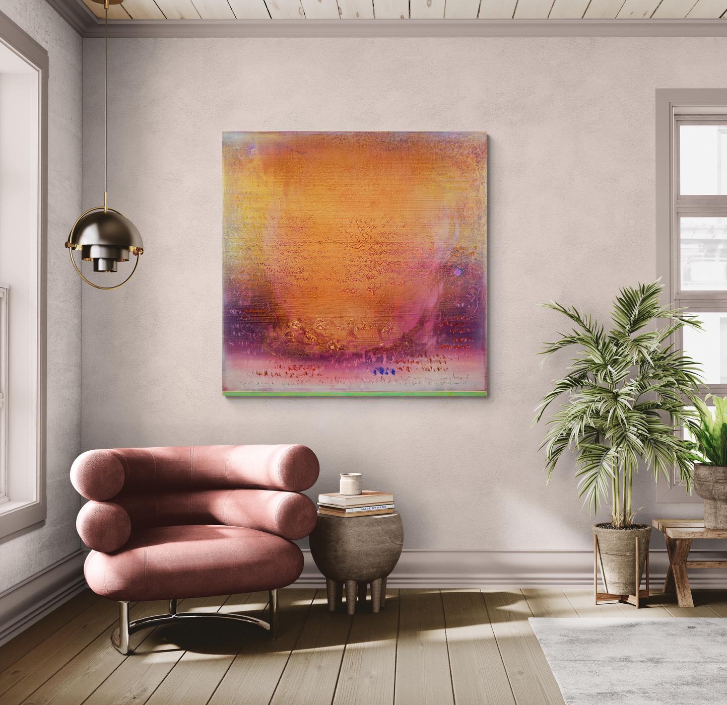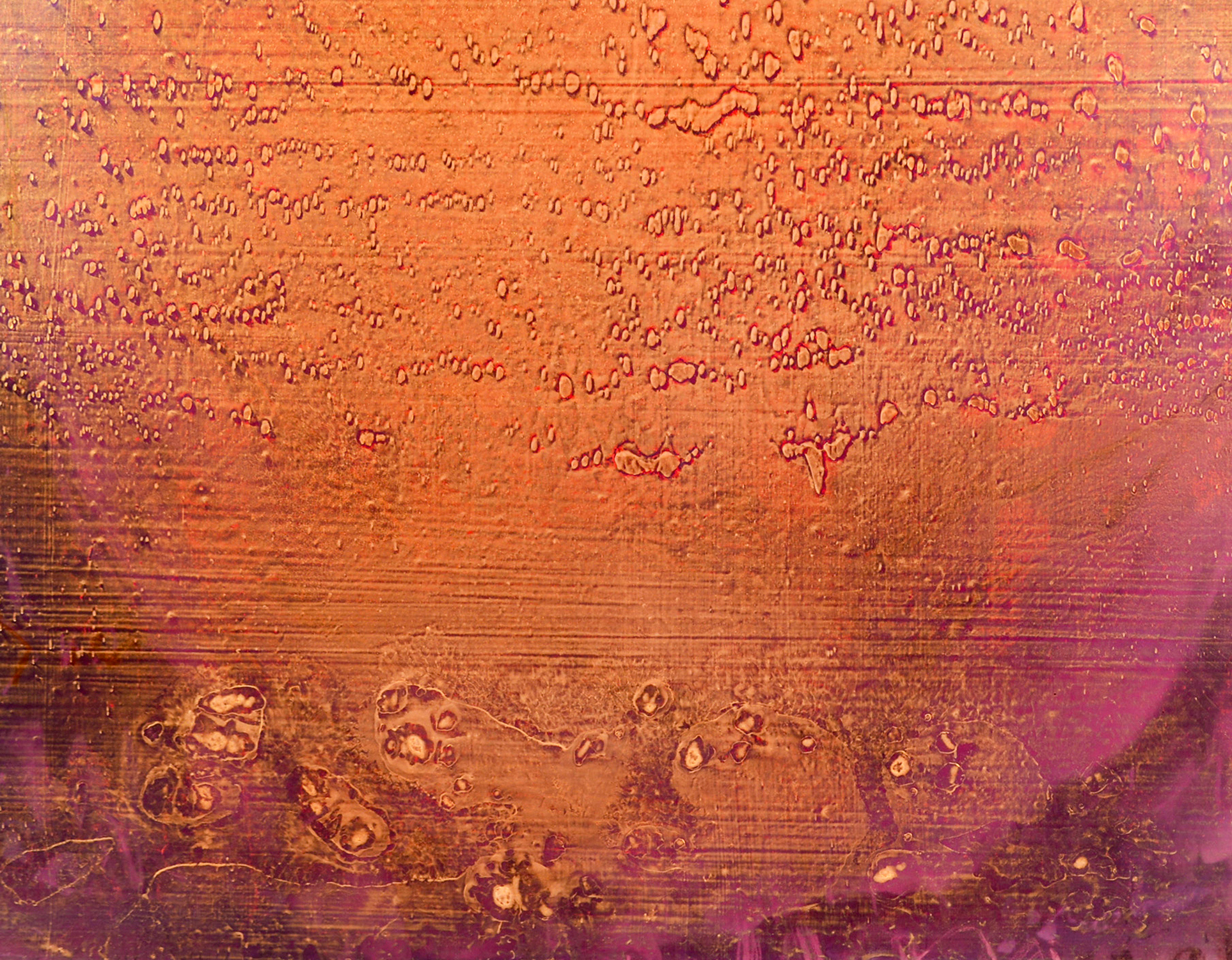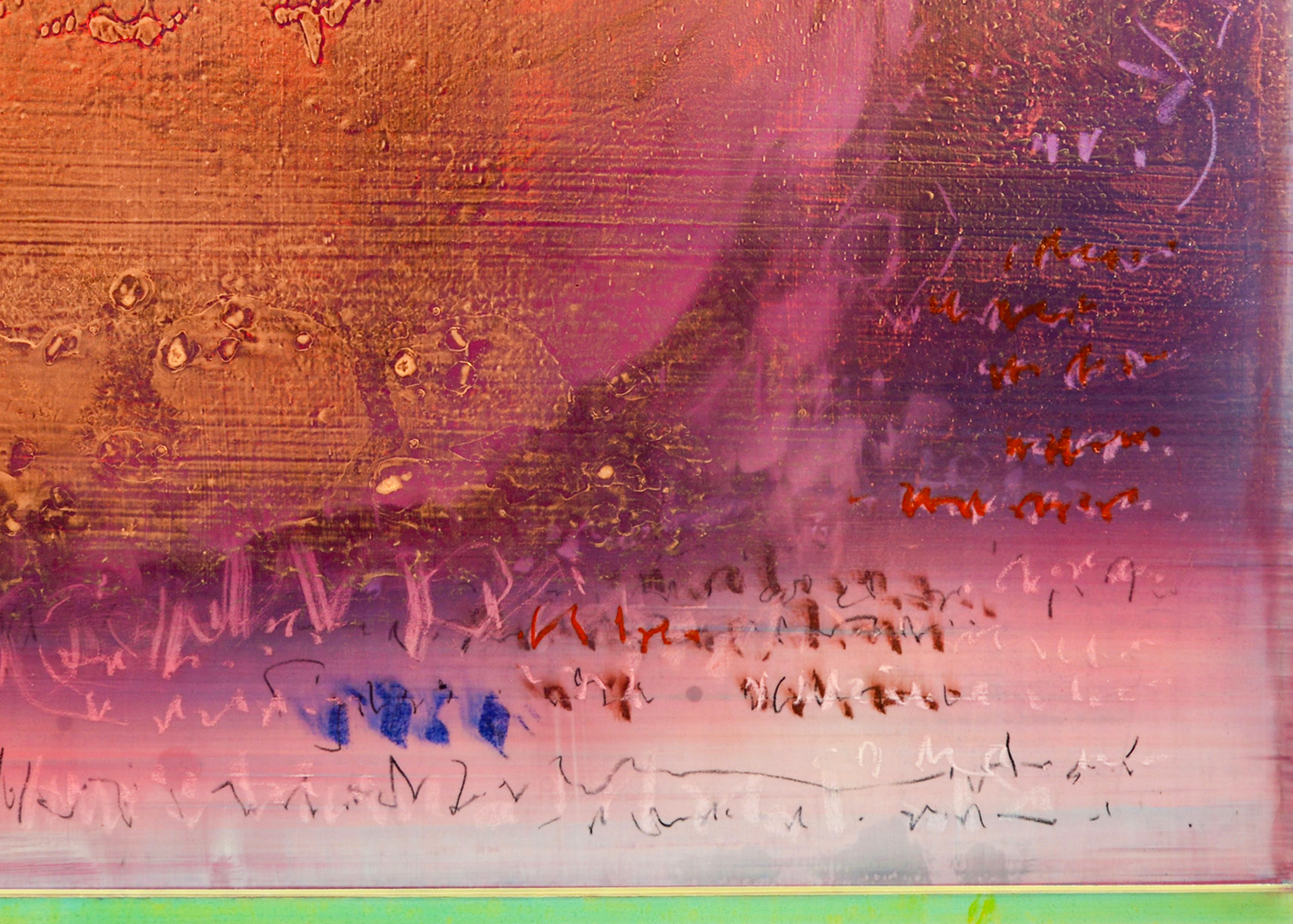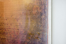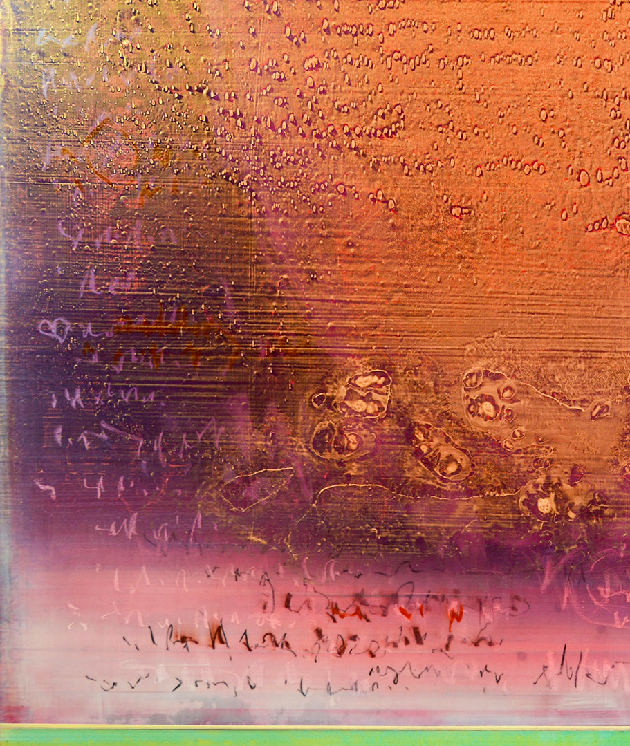 Atomic tangerine, persimmon, persian orange, petal pink and smoky plum hues. The colors in this painting shift as the viewer moves, creating a sense of depth and inner light."Over the course of creating these paintings, a visual notation slowly unfolds into its own form of resonance like ripples of language dancing in space, water and time. I hear these paintings singing. For me, everything has a melody, a music within.”- Alice Teichert
