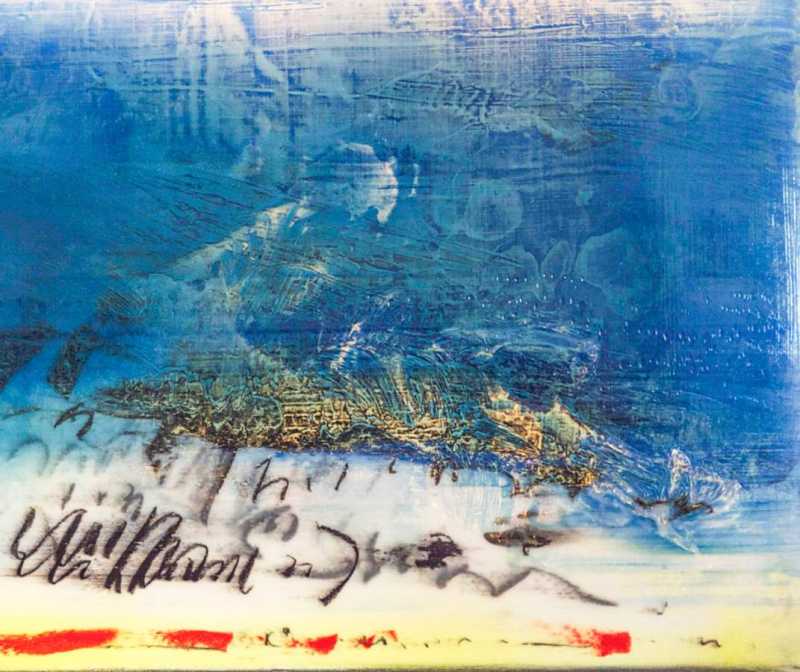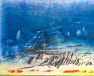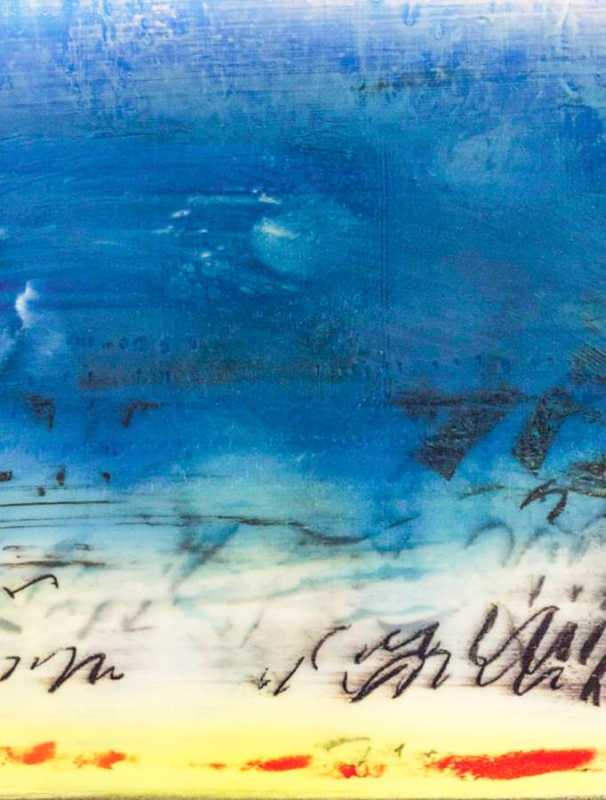 A flood of shimmering cobalt blue rises from strips of brilliant lemon yellow and turquoise, highlighted with dynamic marks and lines in black and red-orange in this horizontal canvas. The artist works with thin layers of acrylic gel and pigment to produce a glossy, jewel-like surface interspersed with calligraphic and musical notations, which she refers to as visual poetry."Over the course of creating these paintings, a visual notation slowly unfolds into its own form of resonance like ripples of language dancing in space, water and time." ~ Alice Teichert