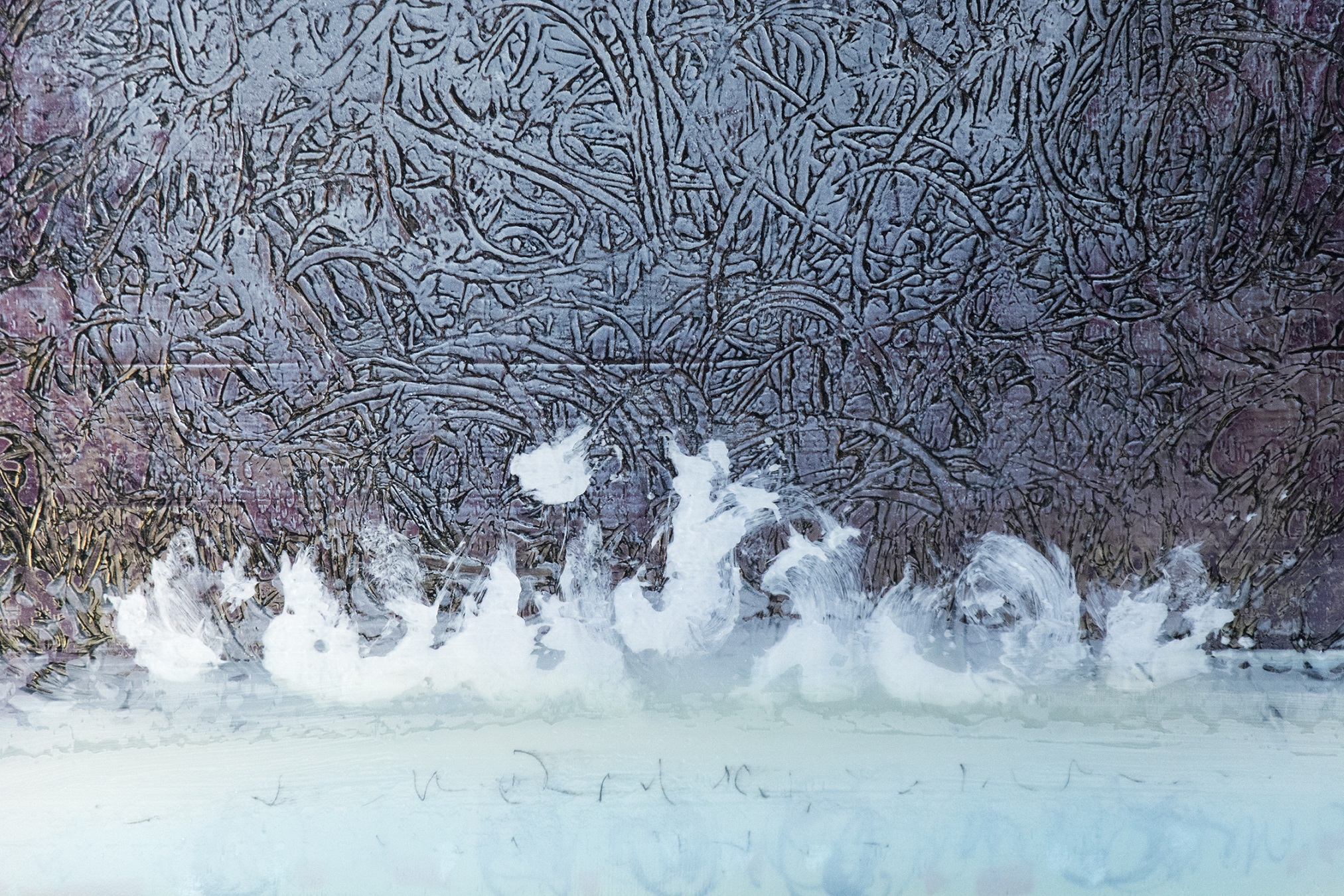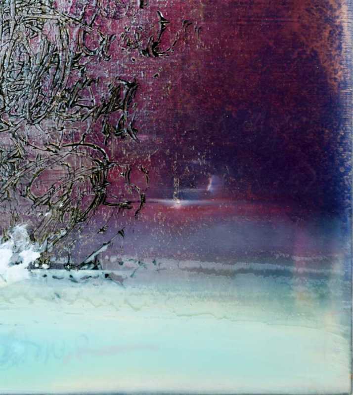 A line of white cloud rises at the foot of swirling silver calligraphy in this luminous canvas by Alice Teichert. Resembling an abstracted tornado against a crimson sky, the dynamic image is aptly named Talking Winds.Alice Teichert, RCA, was born in Paris, France, in 1959. She studied music, philosophy and visual arts in Belgium and France. Since 1989, she has built an international career with over 40 solo exhibitions in Canada, France, Switzerland, Germany and Australia.