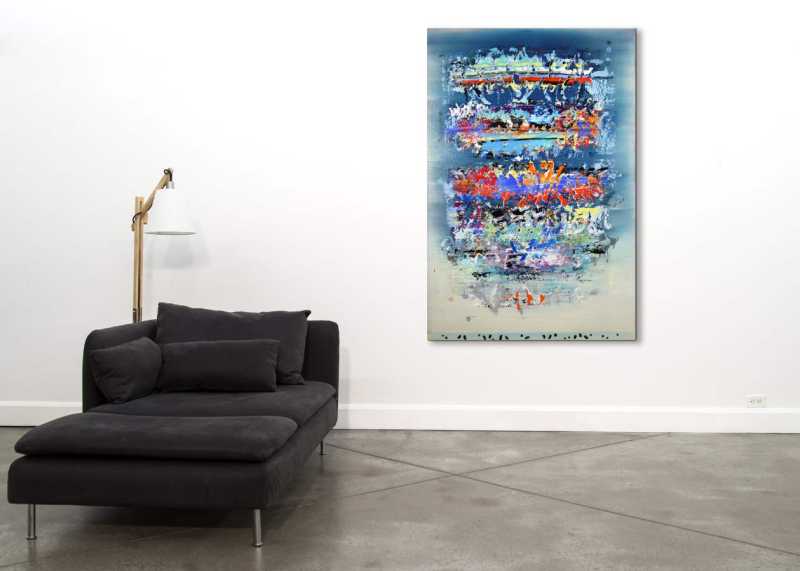 Layered, patterned colours applied in gestural strokes vibrate in horizontal swatches that together float on a luminous blue ground in this mixed media painting. The foot of the six-foot-tall canvas is defined by a strip of light blue superimposed with black calligraphic dashes, an invented, glyphic language that is echoed in the pattern of gestural strokes throughout the painting.Teichert refers to this as visual poetry: "The notation of language has always held more fascination for me than the verbal or auditory expression of it. Reading and absorbing the images of many manuscripts, sheets of music or pages of scripted writing throughout my life has always led me to that curious space between perception and interpretation.' Alice Teichert