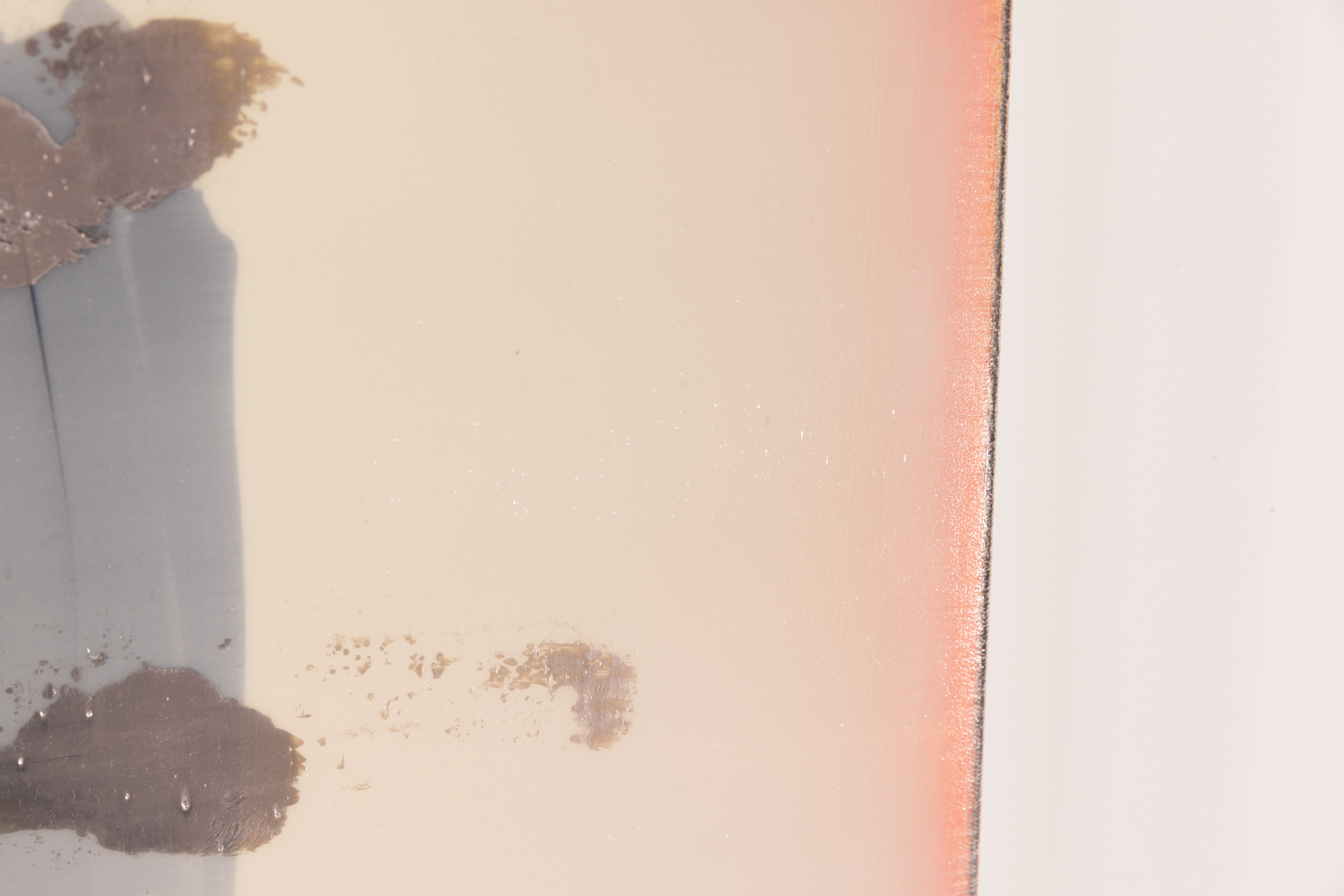 This contemporary abstract painting by Alice Teichert includes a signature motif.Multidisciplinary artist Alice Teichert studied printmaking at University, and that ignited a lifelong fascination with the written word. Her early influences and interests—music and ancient manuscripts, “illuminations” of a spiritual nature can be seen in this ethereal painting. Fluid, spontaneous text-like markings in a frosty silver dance across the canvas and offer a striking contrast to the darker base and pale melon colour of the surrounding field. Her masterful use of layers of pigment adds remarkable, almost holographic depth. A bright orange border grounds the base of the work. Teichert’s poetic visual language is designed to evoke emotion and invite the viewer into another world.