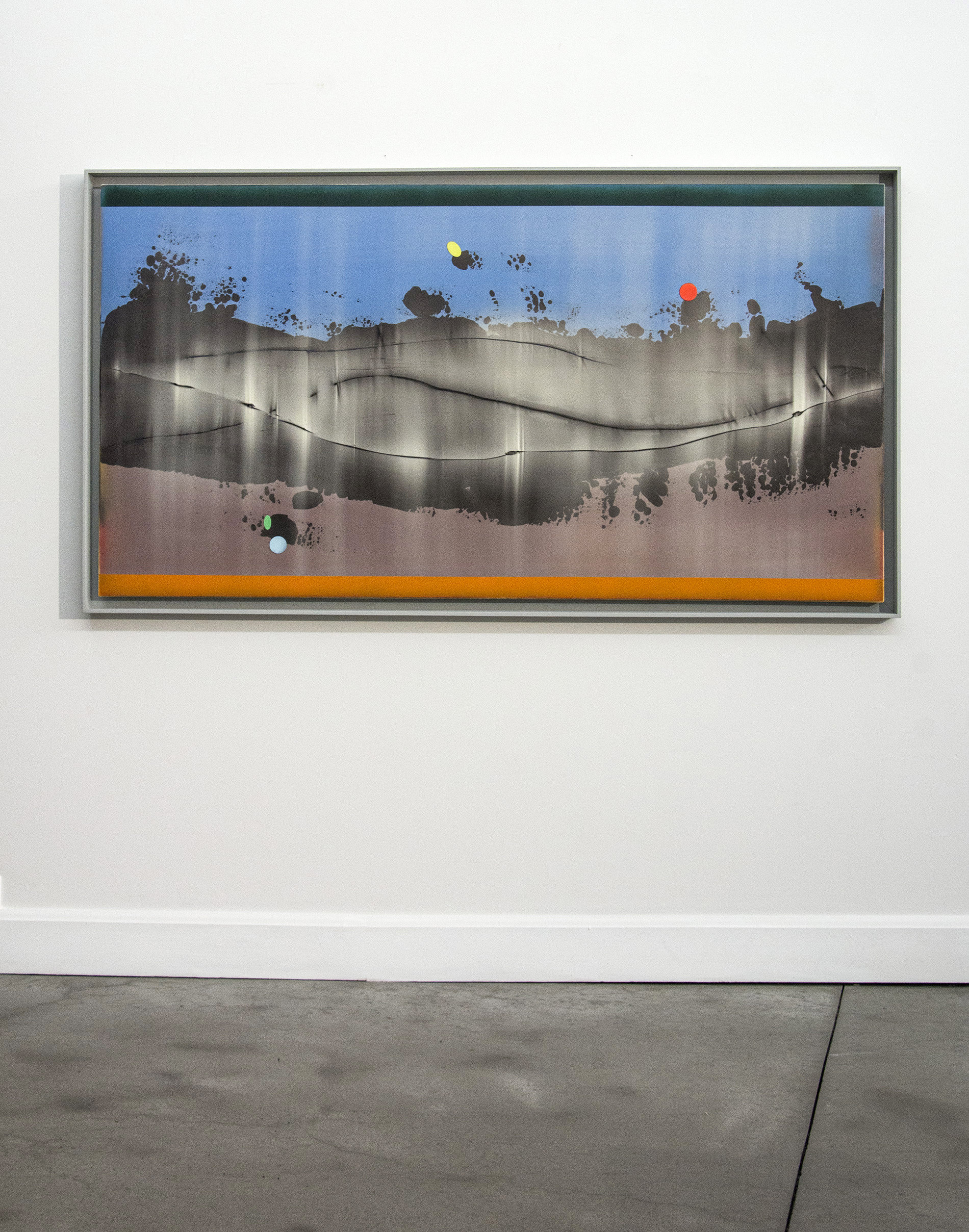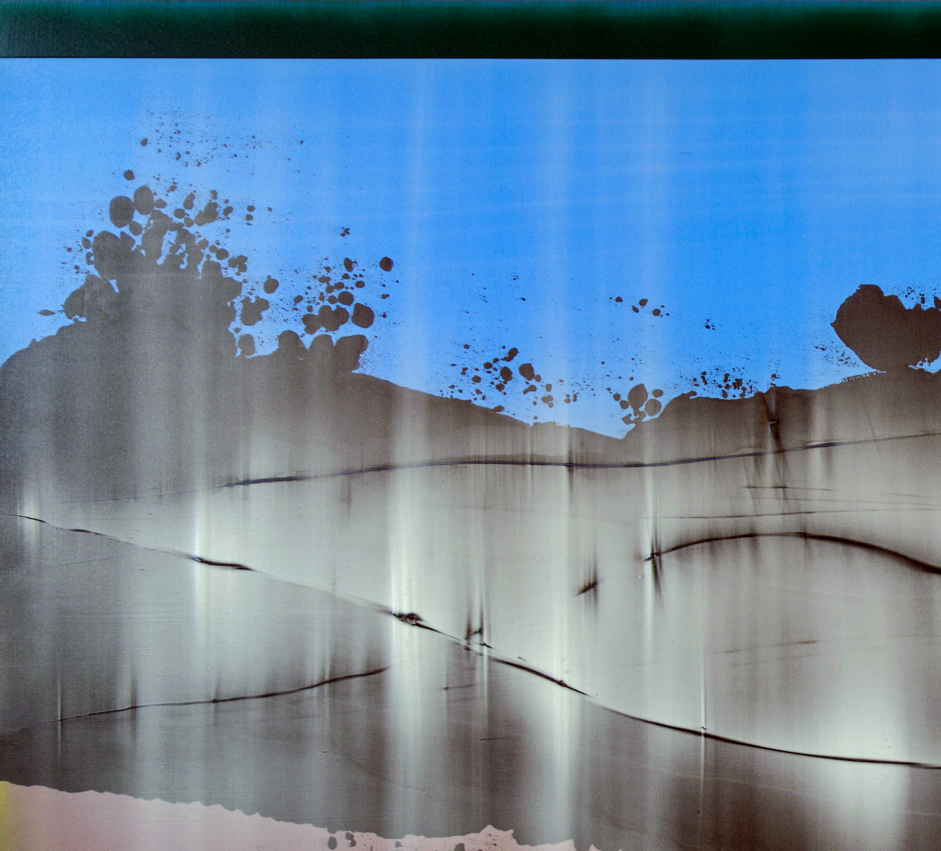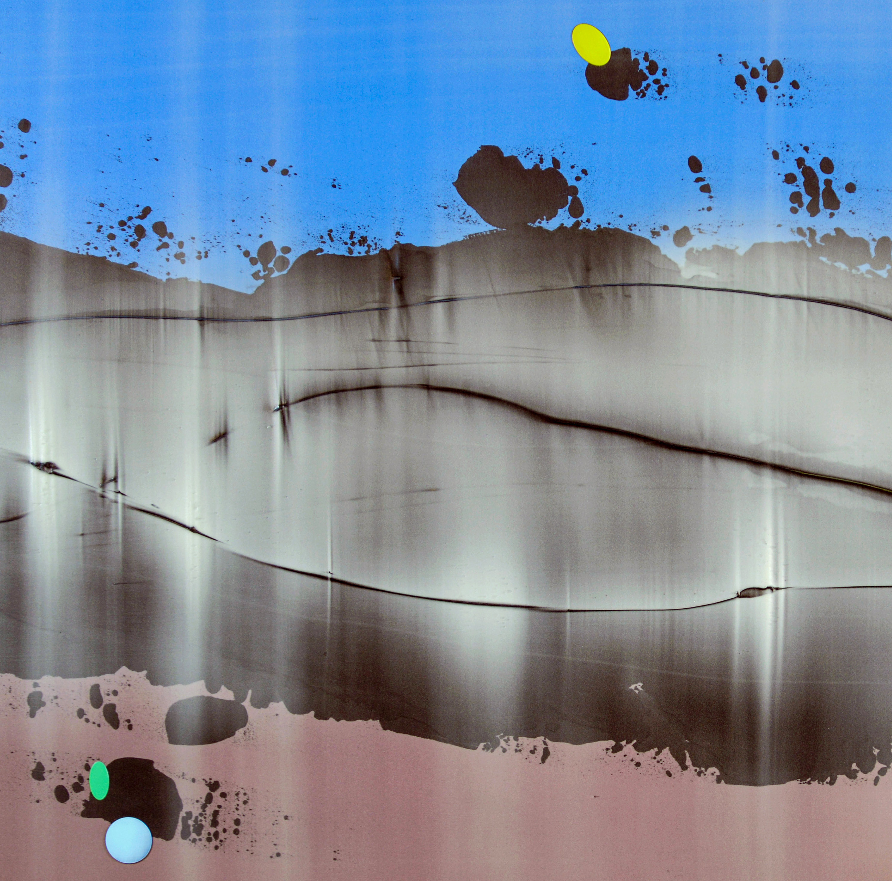 The palette of Wave carries a calm, grounded elegance, earthy and soothing. In this piece, Teichert works with a new medium and color palette, embracing a more subtle form of communication. Her flowing line, while clearly present, feels like a quiet break in the surface—a space between forms where light gently slips through.Soft streaks of white pigment stretch from this central line, pulling the viewer’s eye into rich, layered fields of color. These areas are deep and vibrant, almost immersive—if not for the presence of rounded shapes in solid tones. These circular and oblong forms act like visual pauses, appearing at steady intervals and guiding the eye rhythmically across the canvas, gently drawing attention in and out of the composition.