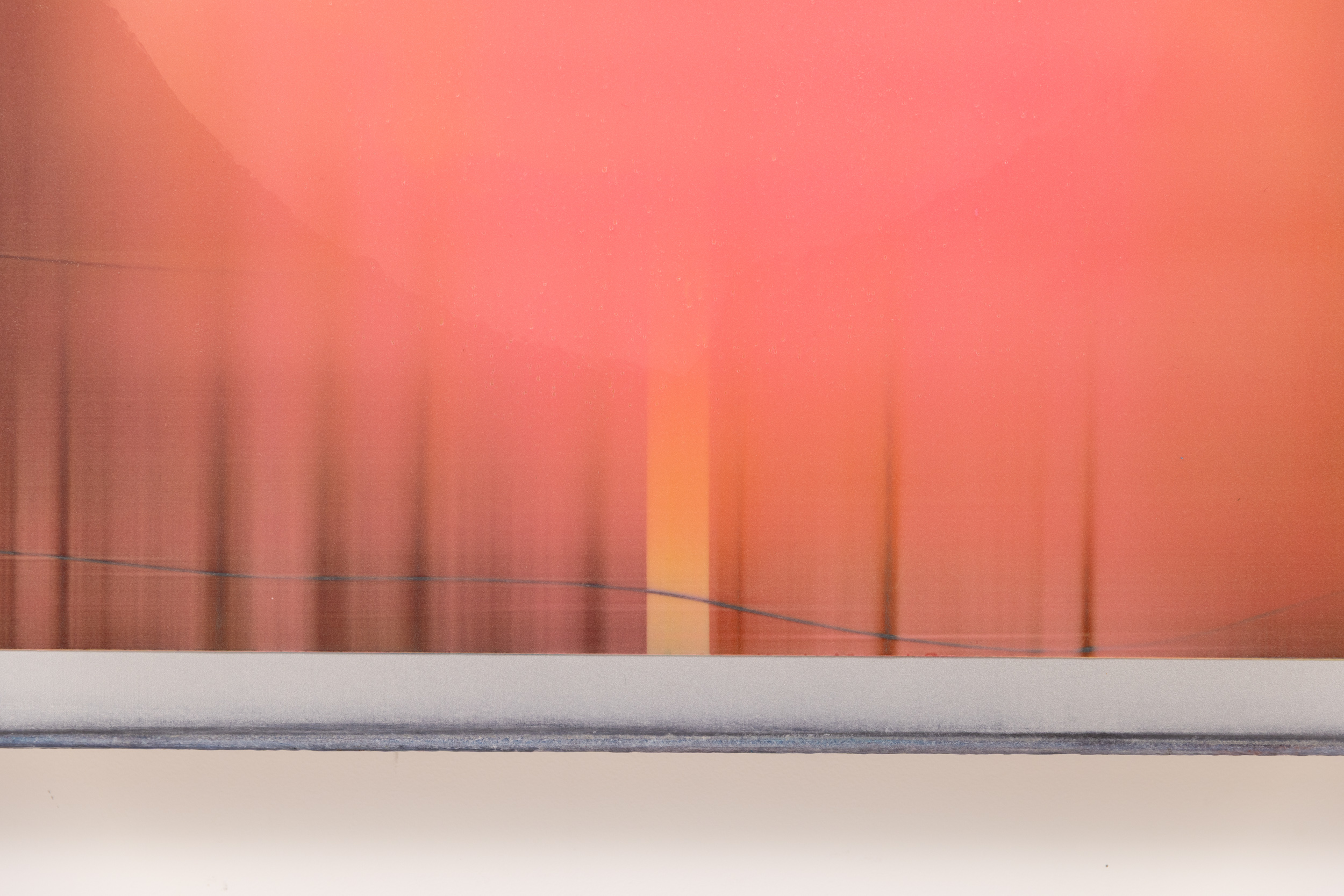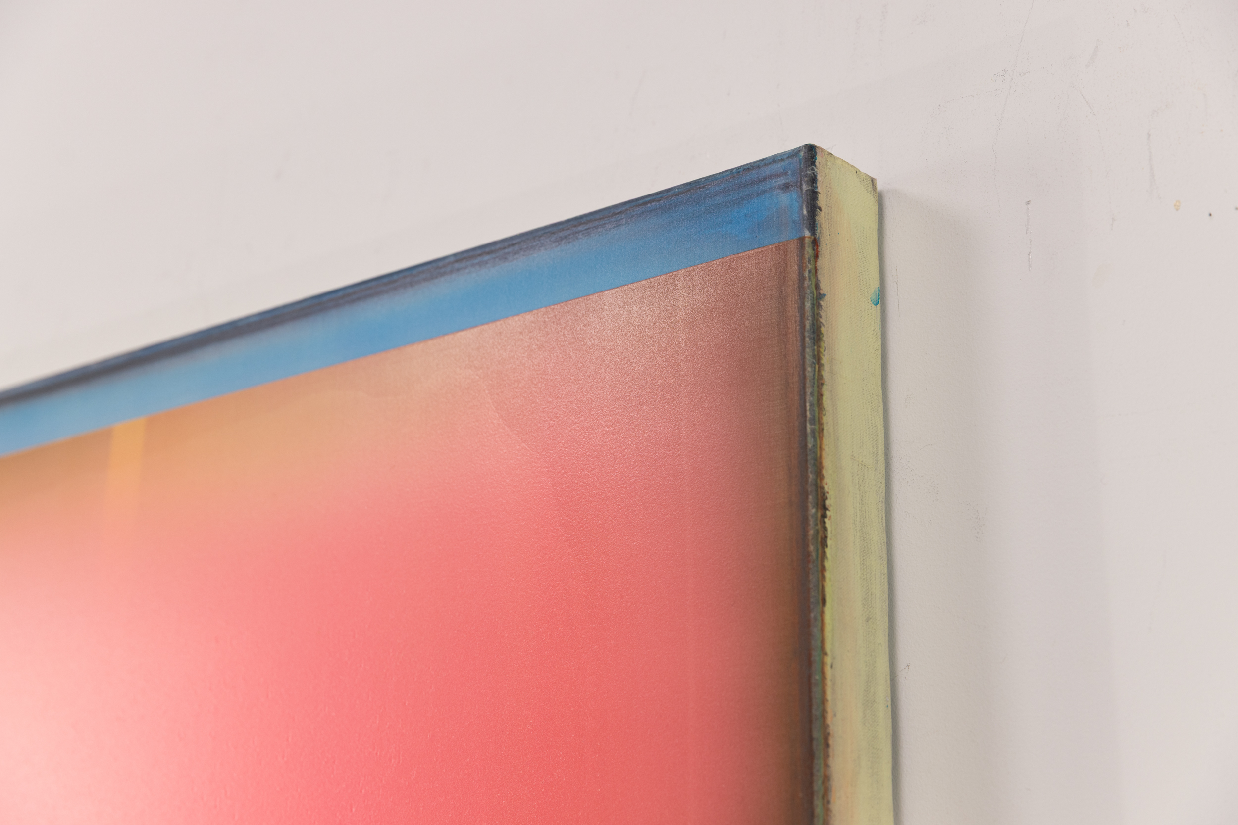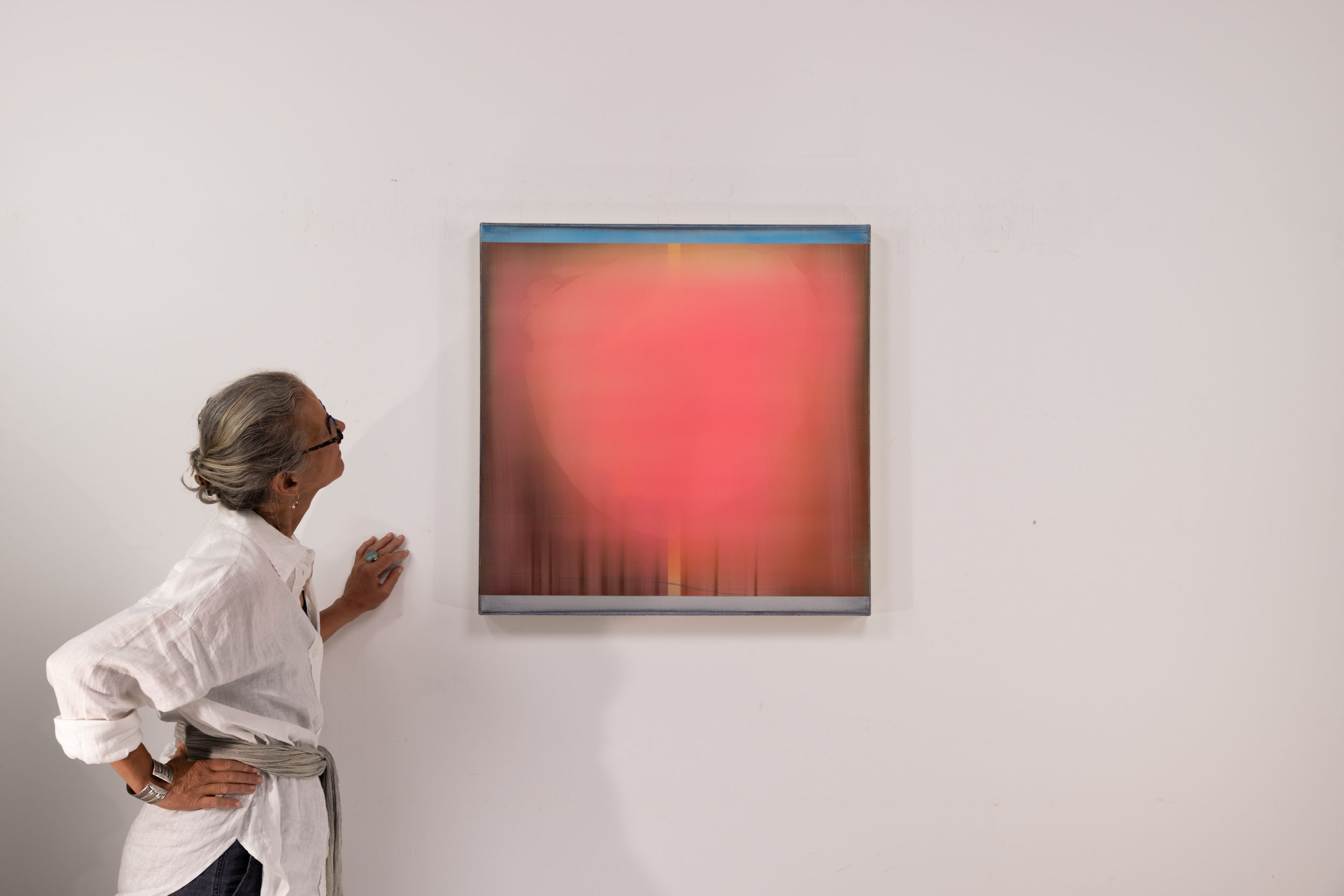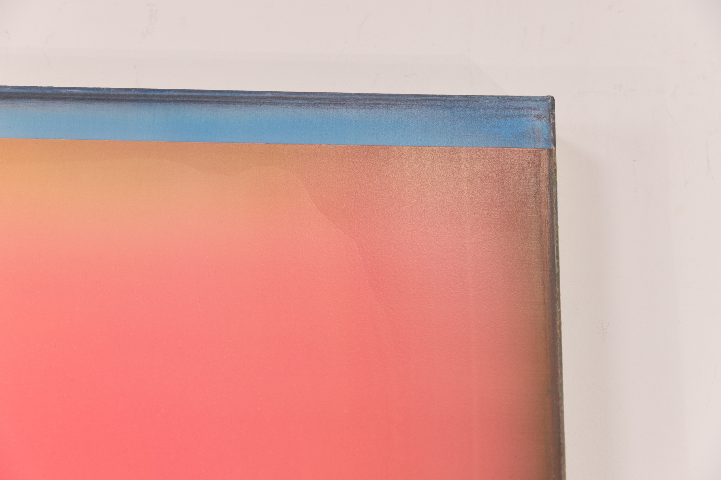 This contemporary abstract painting by Alice Teichert is rendered in shades of pink.As one of Canada’s leading contemporary artists, Alice Teichert has spent decades exploring the potential of colour to convey thoughts and feelings. She often refers to her own work as ‘visual poetry.’ This painting displays her expertise in using washes of colour—luminous layers of glazes that create a work of remarkable depth. The seductive, glowing pink hues of this piece radiate with energy. Closer examination of the work reveals other colours that appear like rays of light—lines and markings in blues, lavender, black and a touch of orange. Borders in blue and bright orange frame the work. The complex lacework of soulful elements in Alice Teichert’s art is rooted in a life spent embracing the arts—playing music, writing and drawing. Alice’s mother was an accomplished pianist, and once, while she was playing, an artist and family friend encouraged a 12-year-old Alice to draw the sound of her mother’s music. Teichert’s own poetic visual language is designed to evoke emotion and invite the viewer into another world.