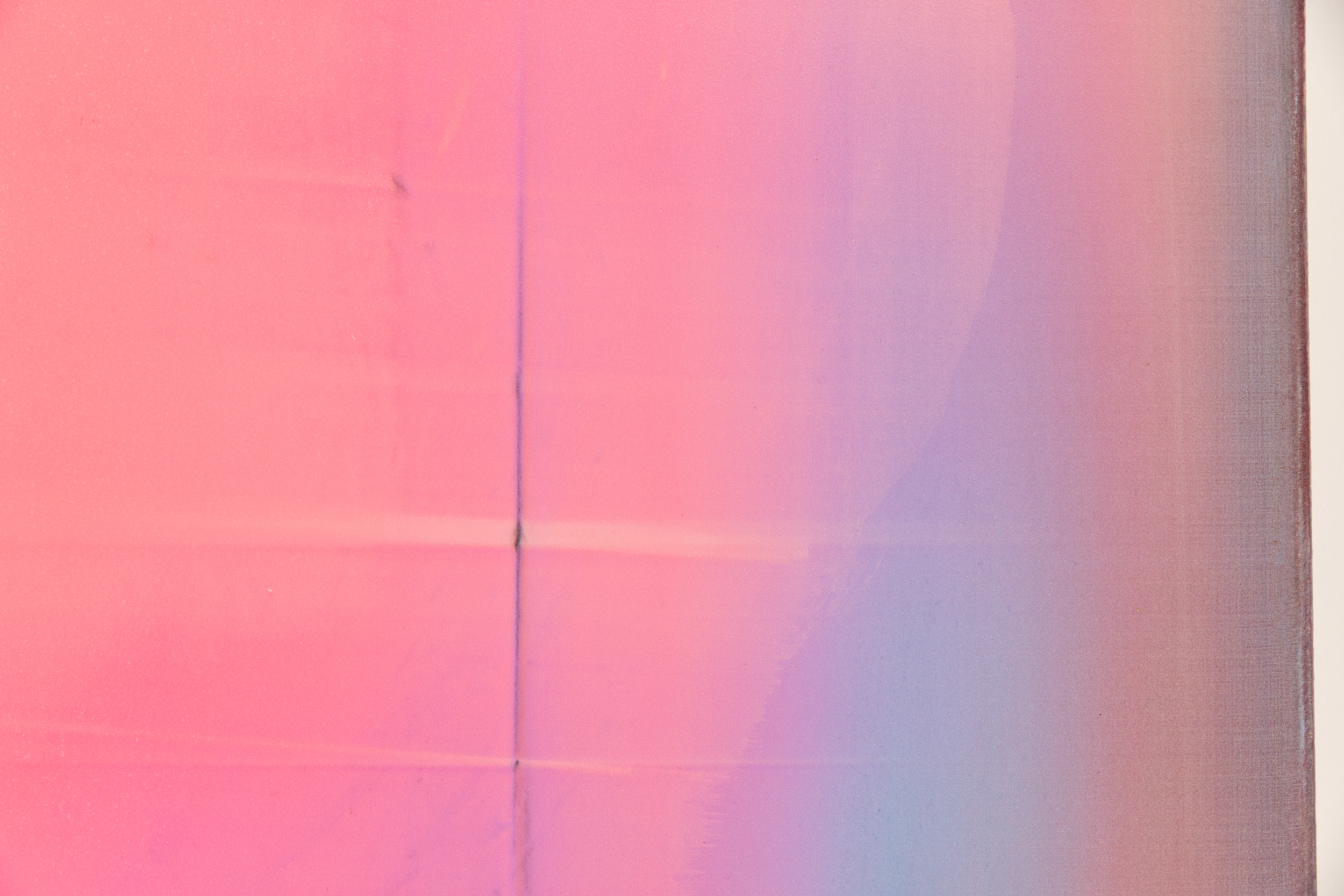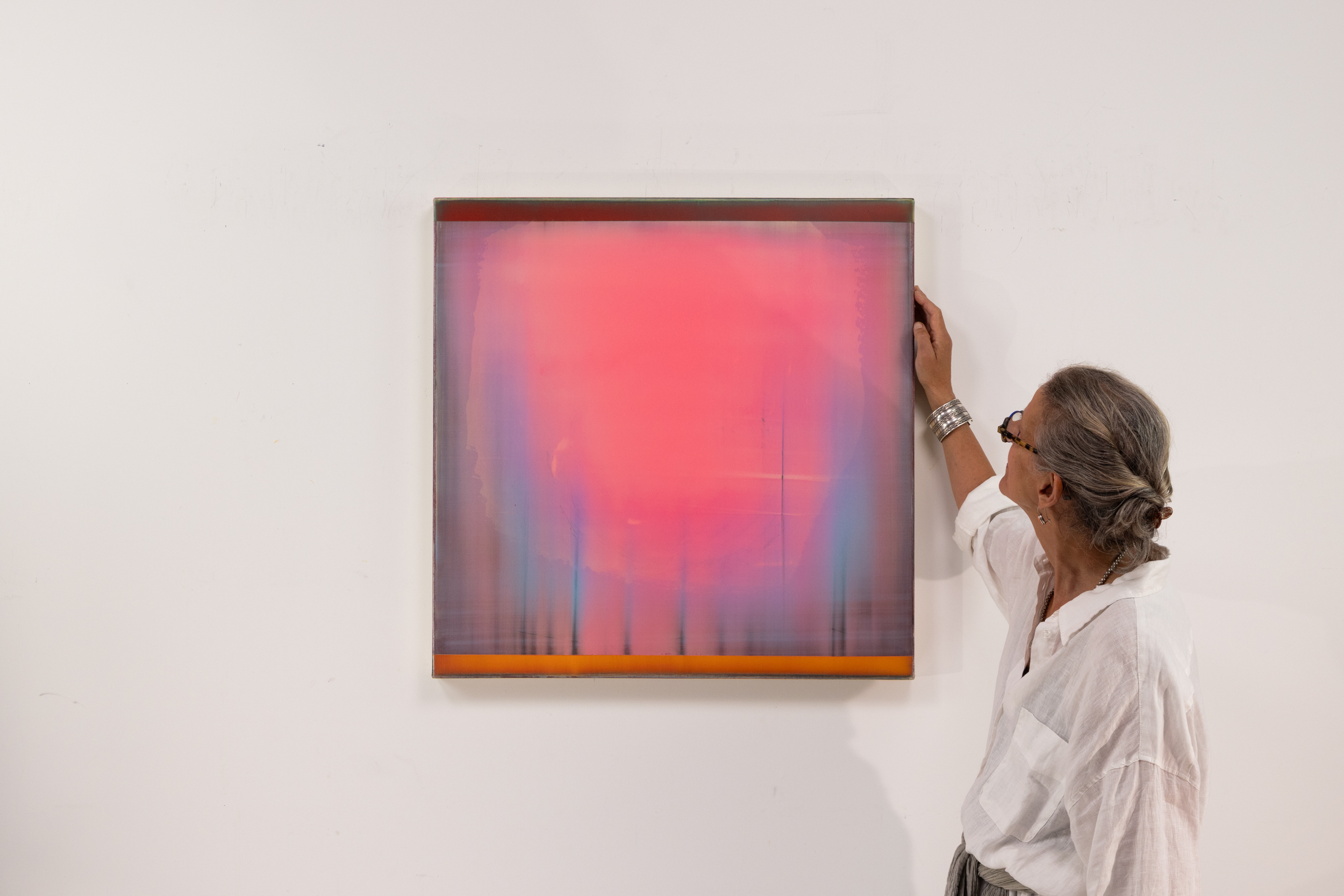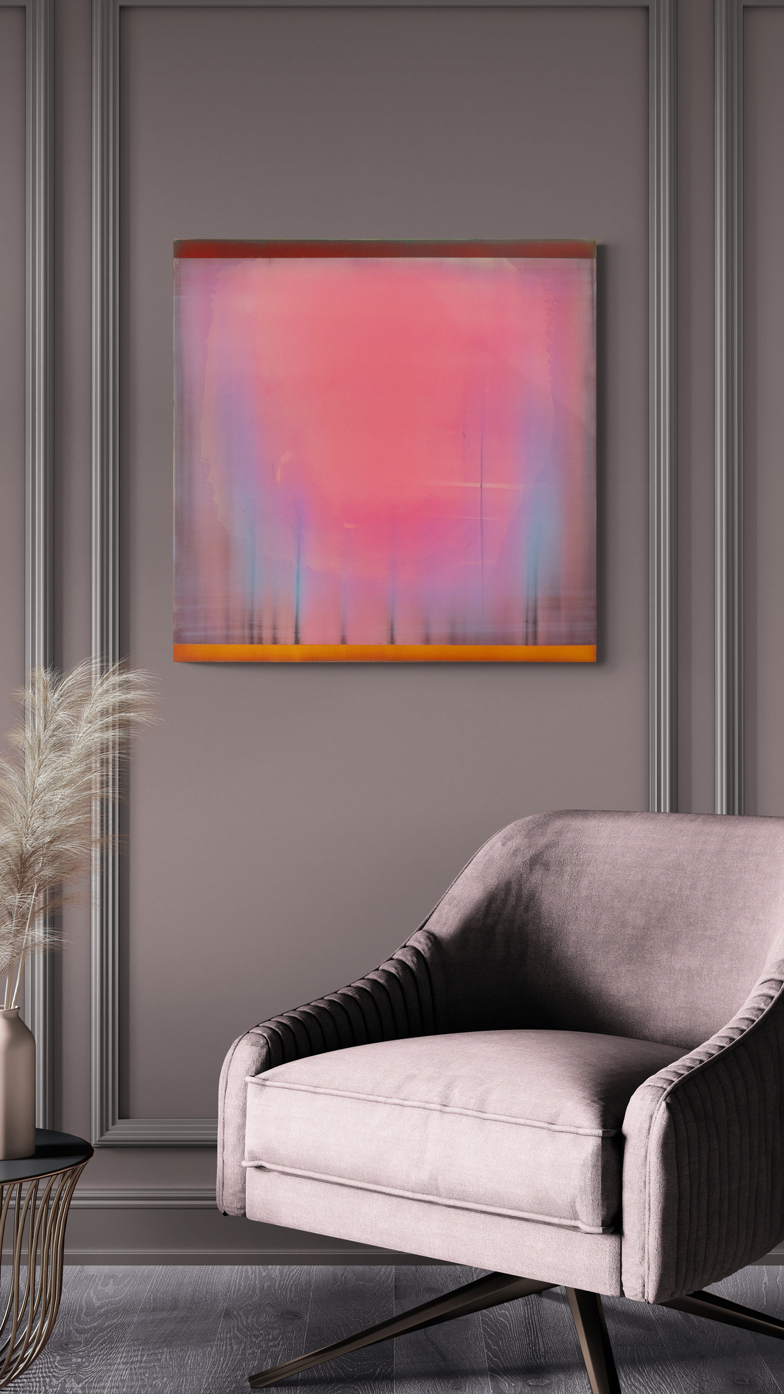 This contemporary abstract painting by Alice Teichert is rendered in shades of pink.As one of Canada’s leading contemporary artists, Alice Teichert has spent decades exploring the potential of colour to convey thoughts and feelings. She often refers to her own work as ‘visual poetry.’ This painting displays her expertise in using washes of colour— layers of glazes that create a work of remarkable depth. The seductive, glowing coral pink hues of this piece radiate with energy. Closer examination of the work reveals other colours that appear like rays of light—lines and markings in blues, lavender, black and a touch of orange. Borders in burgundy and bright orange frame the work. The complex lacework of soulful elements in Alice Teichert’s art is rooted in a life spent embracing the arts—playing music, writing and drawing.