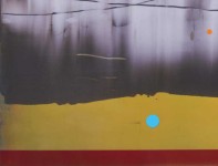 Throughout the painting, solid circles and ovals of colour act as visual anchors. They pop up at intervals, almost rhythmically, guiding your gaze across the surface and giving you moments to pause before moving on.
