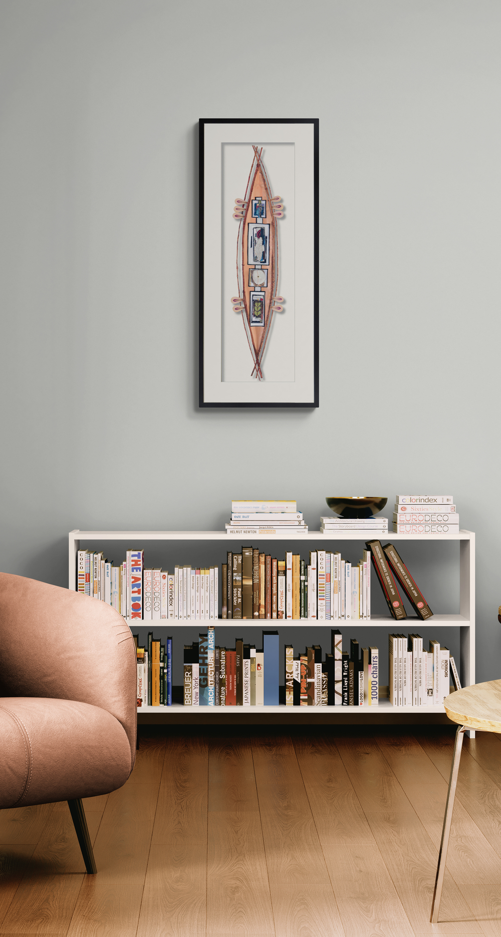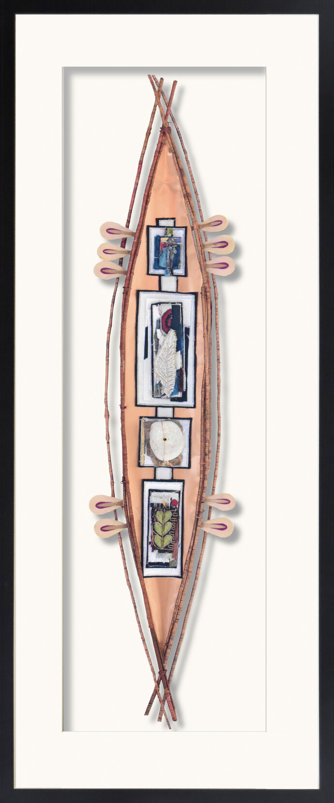 This mixed-media contemporary assemblage resembles a vessel and is designed to be hung on a wall.This striking composition by Alice Vander Vennen revisits a favourite form—the vessel depicted as a ‘canoe-like’ object. Vander Vennen’s artwork is made from carefully curated pieces of assembled ‘found’ objects—each one ‘tells’ a story.