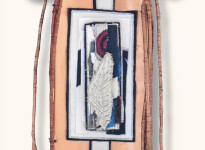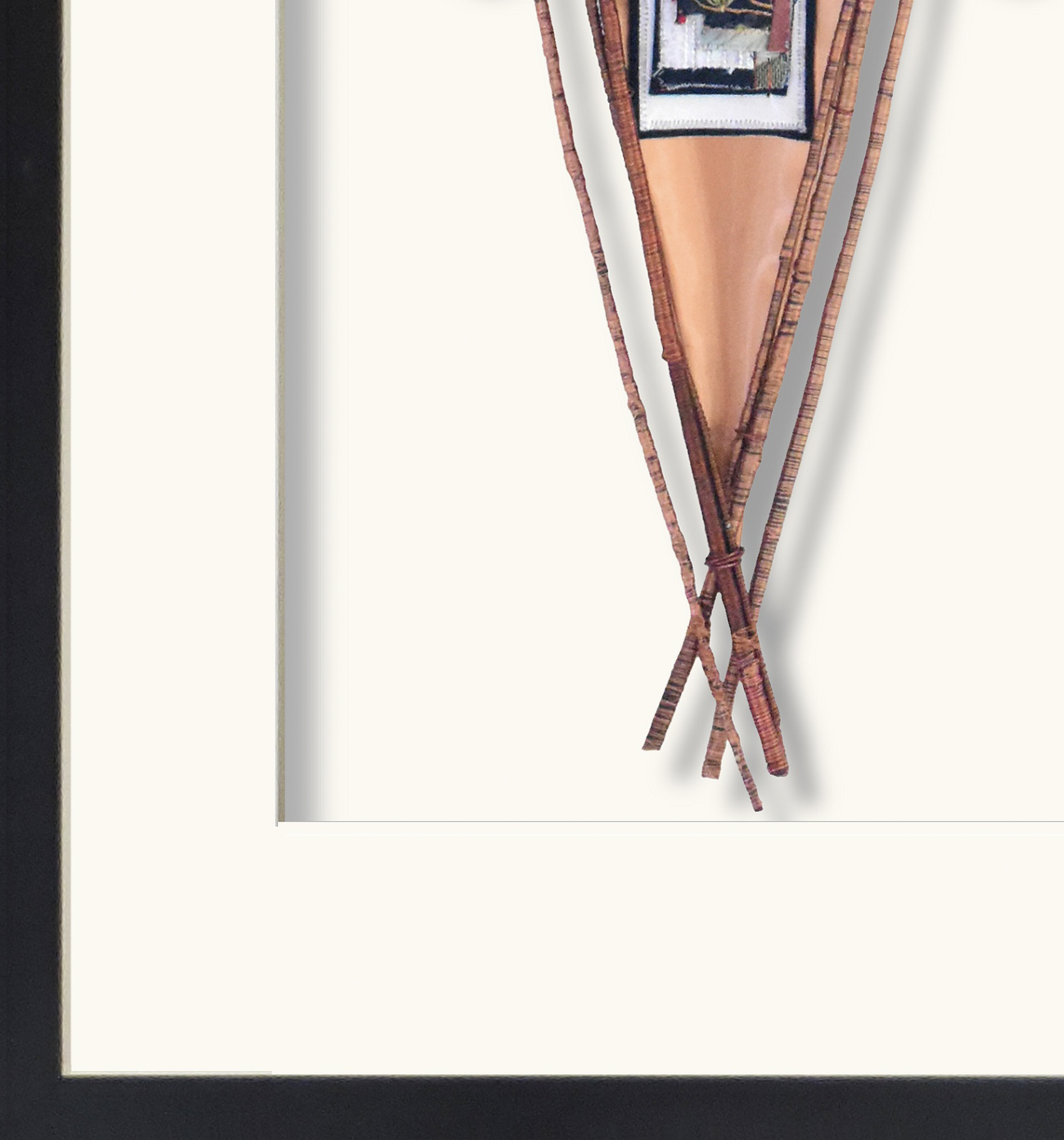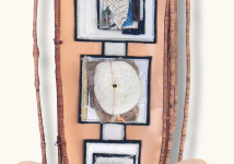She begins each sculptural composition with textiles, both new and archival, selected for their colour and design. Layer upon layer of textiles cut into squares are assembled along with found objects—copper, copper wire, piano hammers and stones. The colour palette is fresh and modern—bright copper, turquoise, navy, moss green, earth tones, white, black and pops of red. These framed pieces can be hung horizontally or vertically. The pieces are shaped into a vessel that resembles a canoe. Vessels are associated with the idea of taking a journey. This imagery speaks to our collective histories and the artist’s personal history as the daughter of Dutch parents who immigrated to Canada.