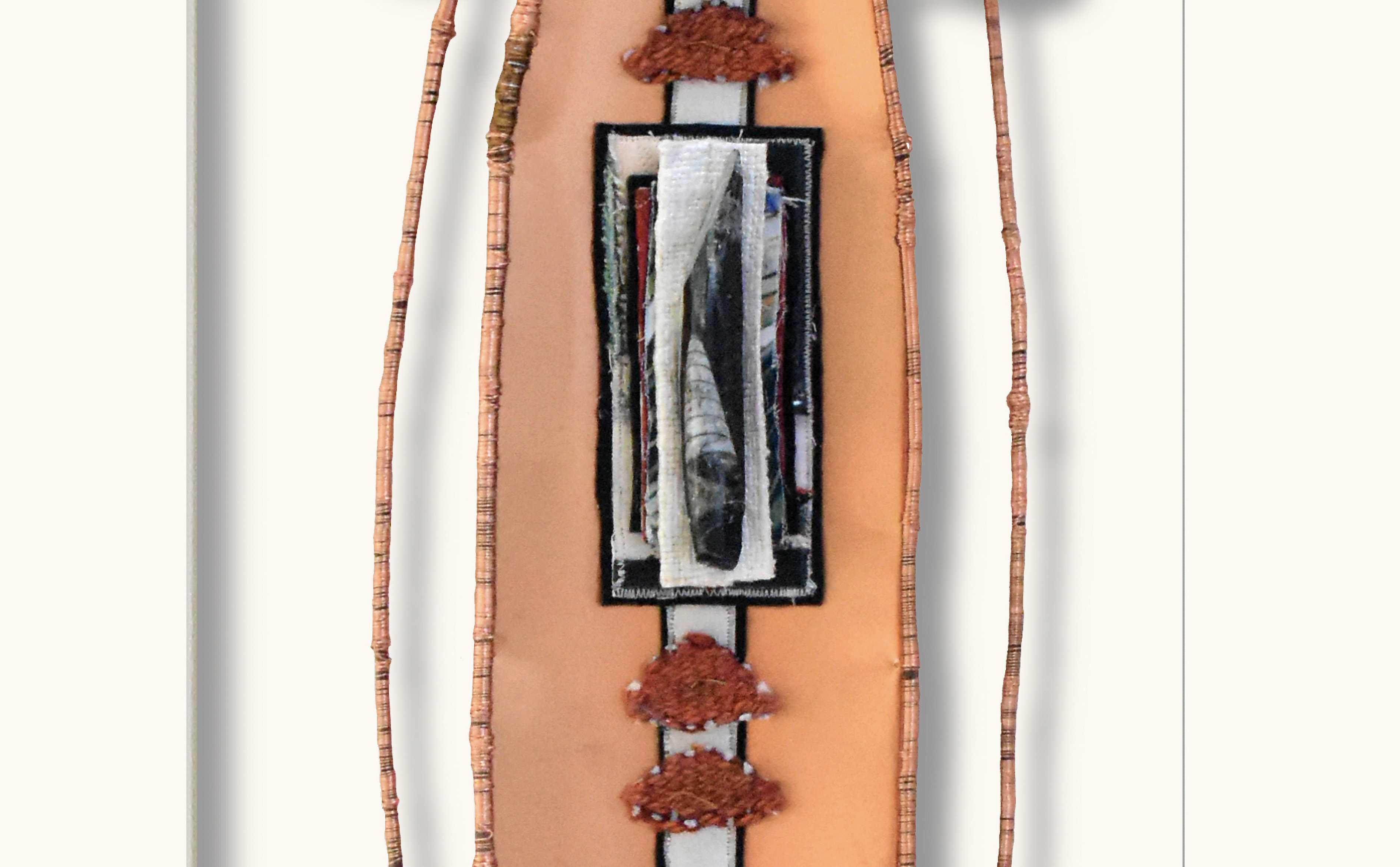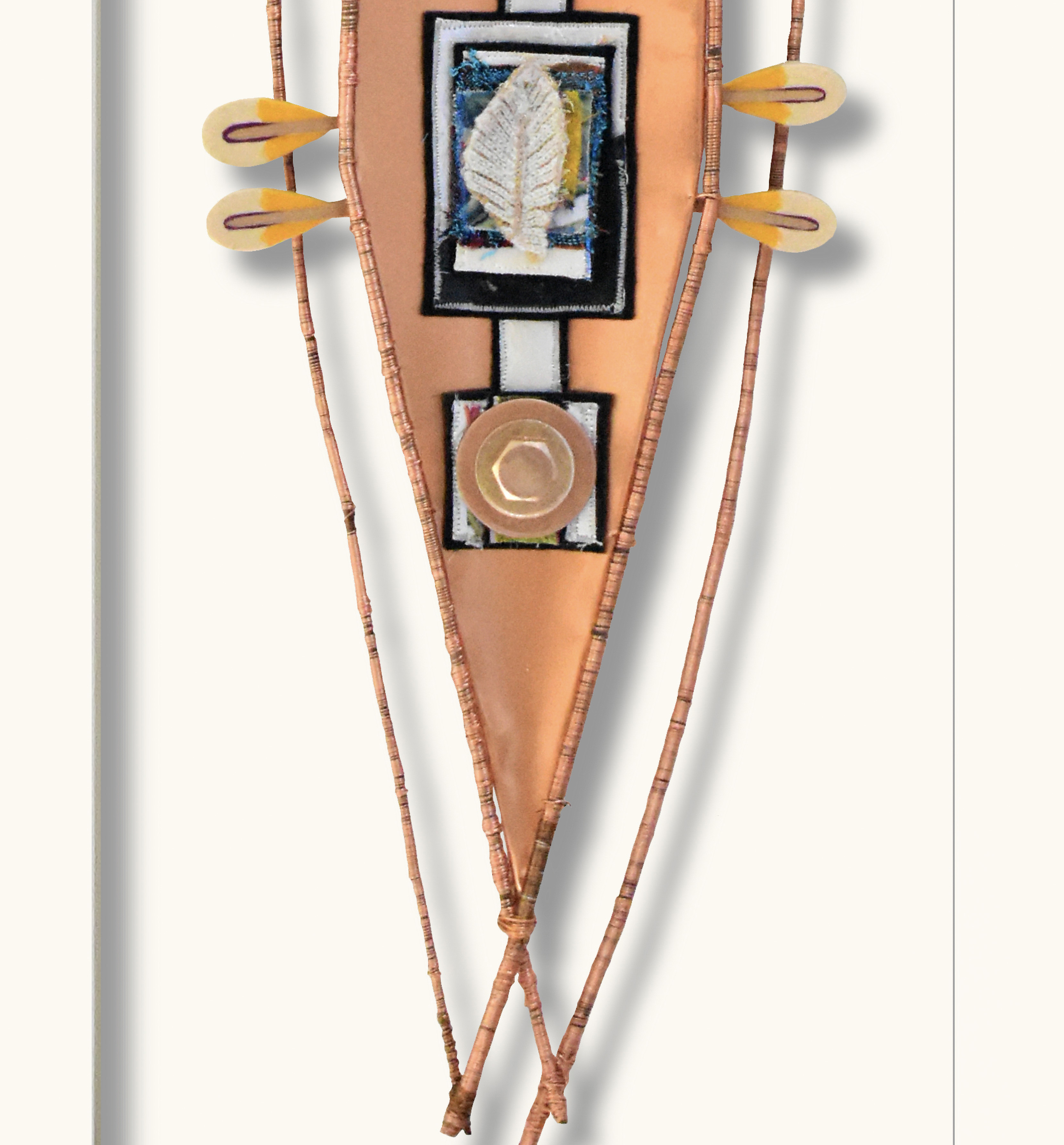 The Canadian artist’s beautiful, intricately detailed work is created using ‘found’ objects—stones from the shores of Lake Ontario, shells, pieces of textiles, and burnished copper assembled to form and adorn a canoe-like shape. Two sets of ‘paddles’ are attached to both sides, the bow and stern of the vessel.