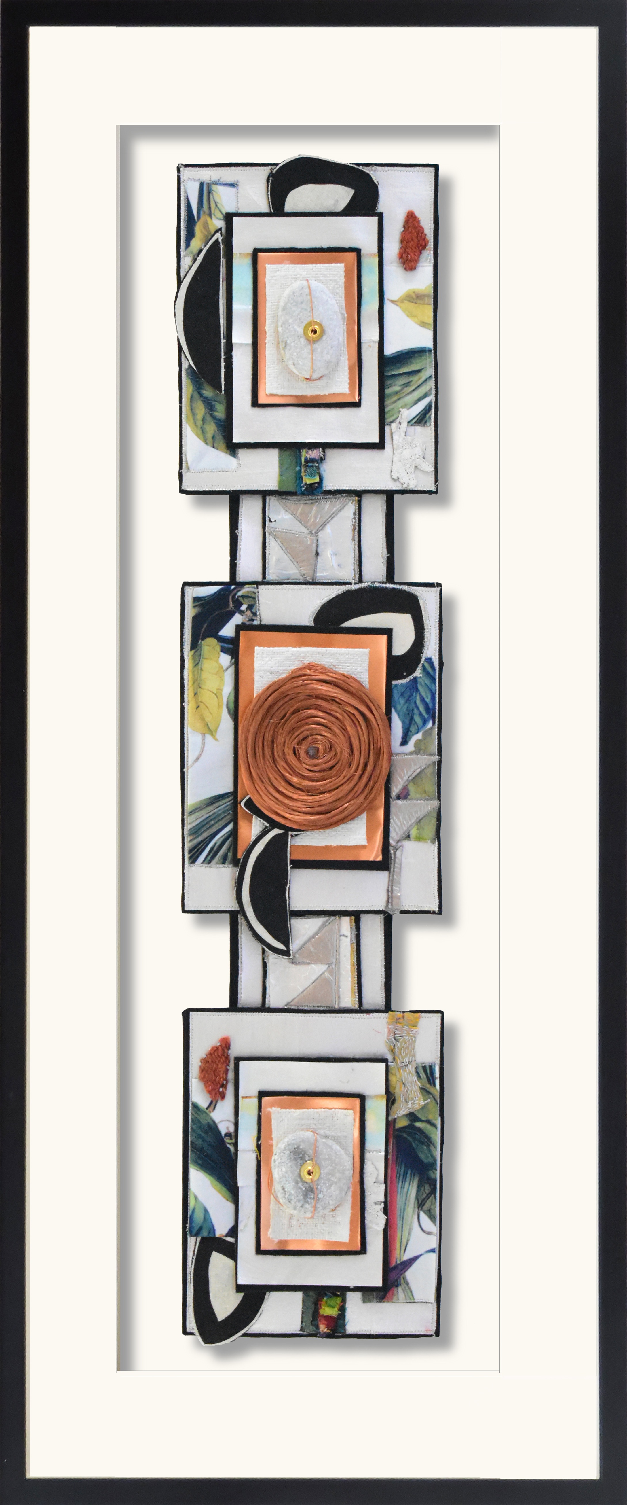 This contemporary mixed media assemblage features a botanical motif.Alice Vander Vennen’s stunning, intricately detailed work is created using ‘found’ objects. Growing up, her immigrant parents taught her the value of collecting and re-purposing objects as they’d lived through the rationing of the Second World War. Vander Vennen’s work is deeply personal, but the story behind it also resonates with our collective memory. The base of each composition is formed using squares of beautifully detailed textiles –new and archival that are layered along with stones from the shores of Lake Ontario and coiled, burnished copper. The three linked squares are stacked one on top of the other to create the assemblage. The colour palette is fresh and modern—the addition of black and white graphic shapes offers bold contrast to the red, yellow, blue and green colours of the textiles. These framed pieces can be hung horizontally or vertically.