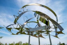 This contemporary outdoor sculpture is forged from stainless steel to resemble clouds.In this elegant sculpture by Ania Biczysko, fine ribbons of stainless steel overlap in circles forming a cloud-like structure mounted on a tripod stand. When viewed from all sides, the sky is reflected in the luminescent quality of the highly polished steel.