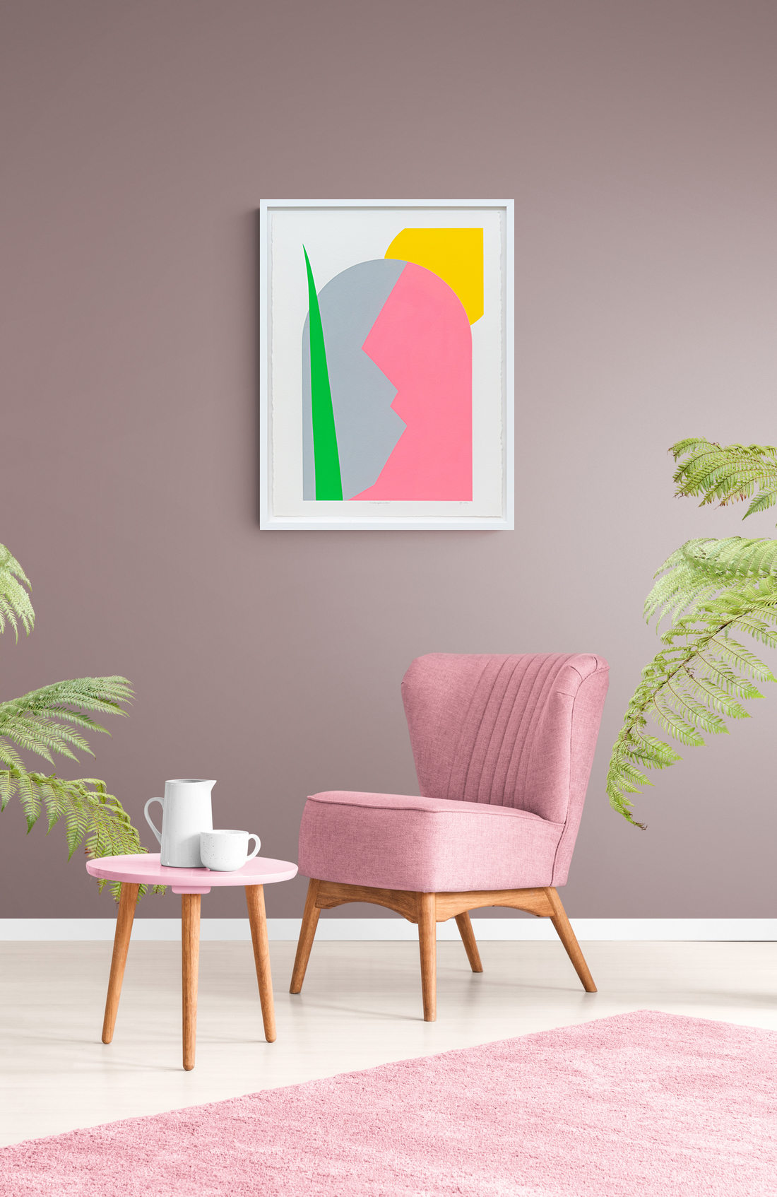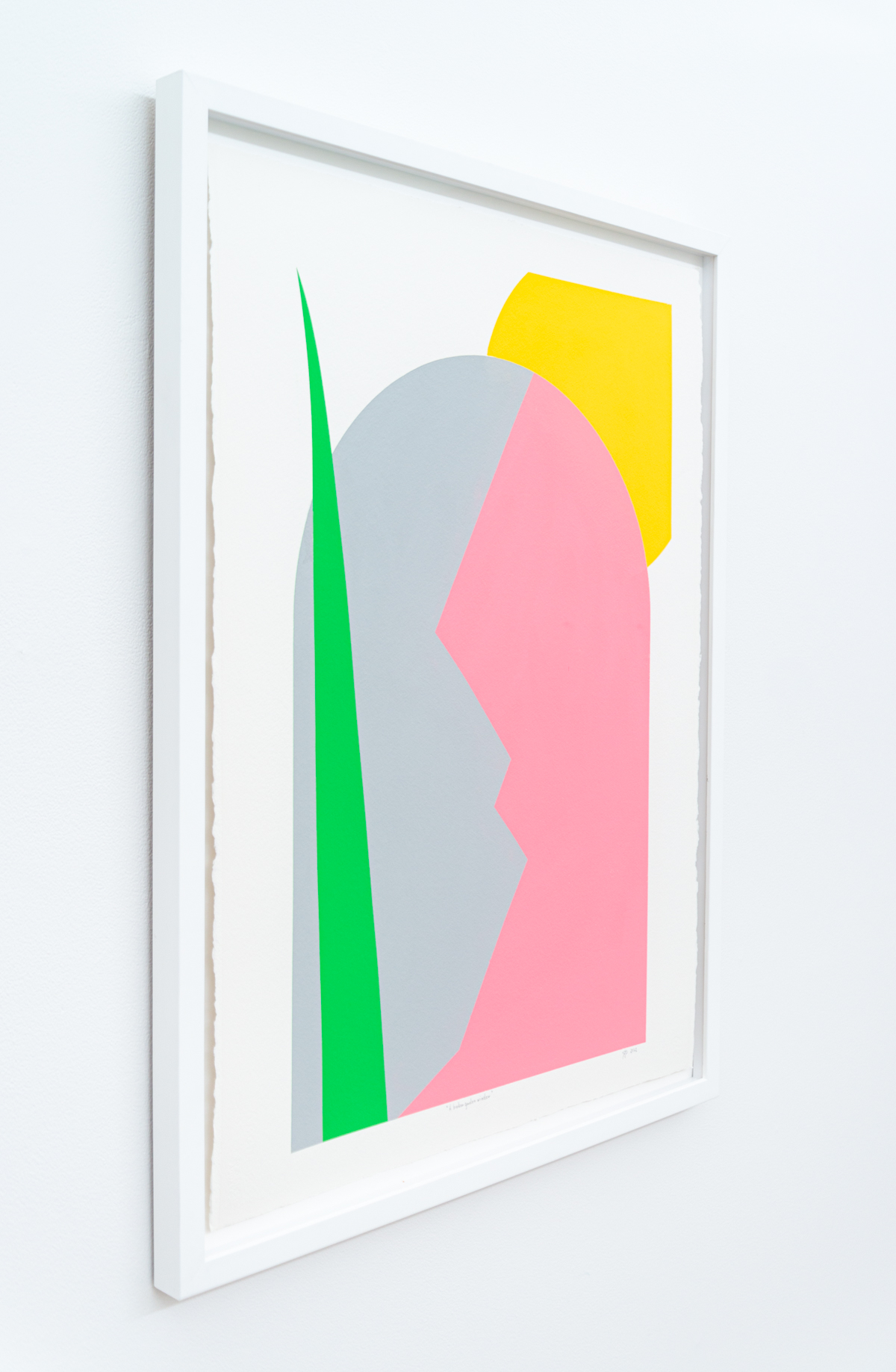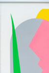 Aron Hill’s fresh, modern ‘take’ on landscapes continues with a new series of works on paper. Known for their bold form and bright colour palette, this piece also incorporates an architectural element—an arched window. Hill often uses the sun as a feature and this acrylic on paper is no exception. A neutral canvas allows the bright green, pink and yellow colours to ‘pop.’“The sun is a central element of my work. It serves as the guiding light to the layers of experience translated onto canvas.” Aron Hill