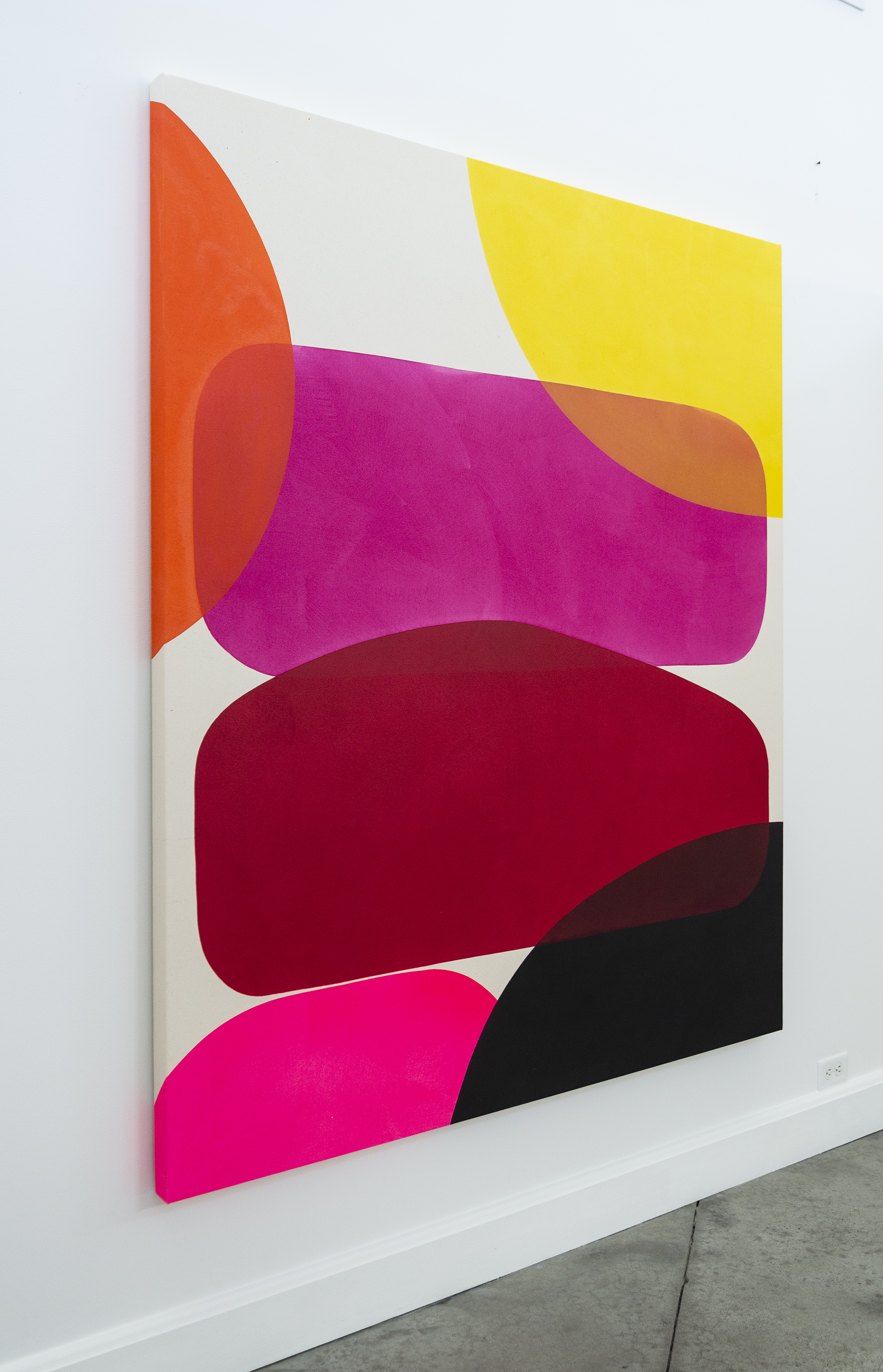 Aron Hill’s dynamic graphic compositions were inspired by the work of the late Canadian modernists like Jack Bush. Minimalist shapes and bold colours continue to characterize their new work. With this piece, one of two in a series, bold graphic shapes are layered, mixing the colours—orange into yellow, pink into blue, and red.“The paintings are primarily demonstrative of light and transparency, a stage for the painted object.” Aron Hill