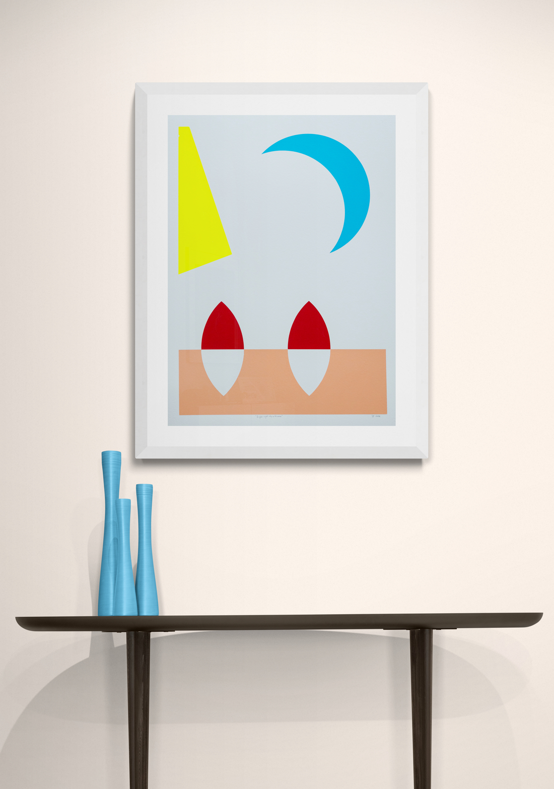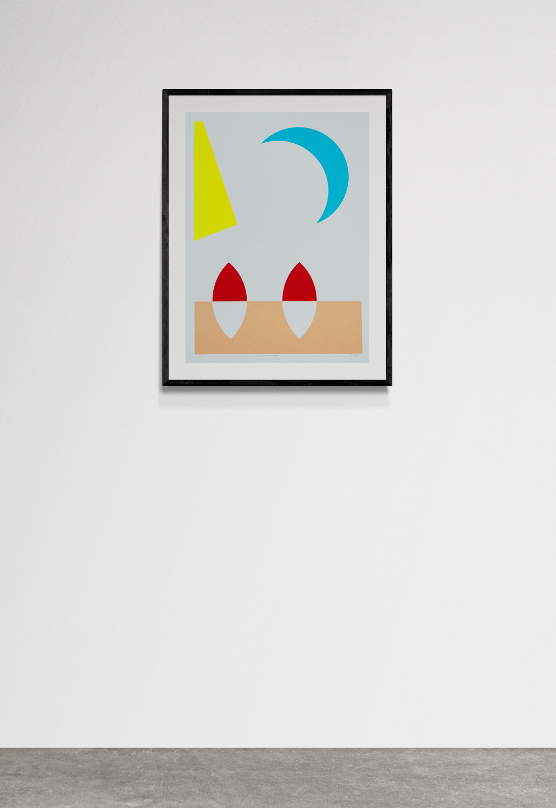 Aron Hill’s work is reminiscent of the bold, dynamic form and colour palette of Canadian modernists like Jack Bush. A new series of works on paper features the Calgary born artist’s characteristic graphic shapes inspired by nature. Two leaf-like shapes on the ground in red and white, a crescent moon in turquoise hangs in the sky across from a bright yellow sun—the backdrop a neutral soft gray.“The paintings are primarily demonstrative of light and transparency, a stage for the painted object.” Aron Hill