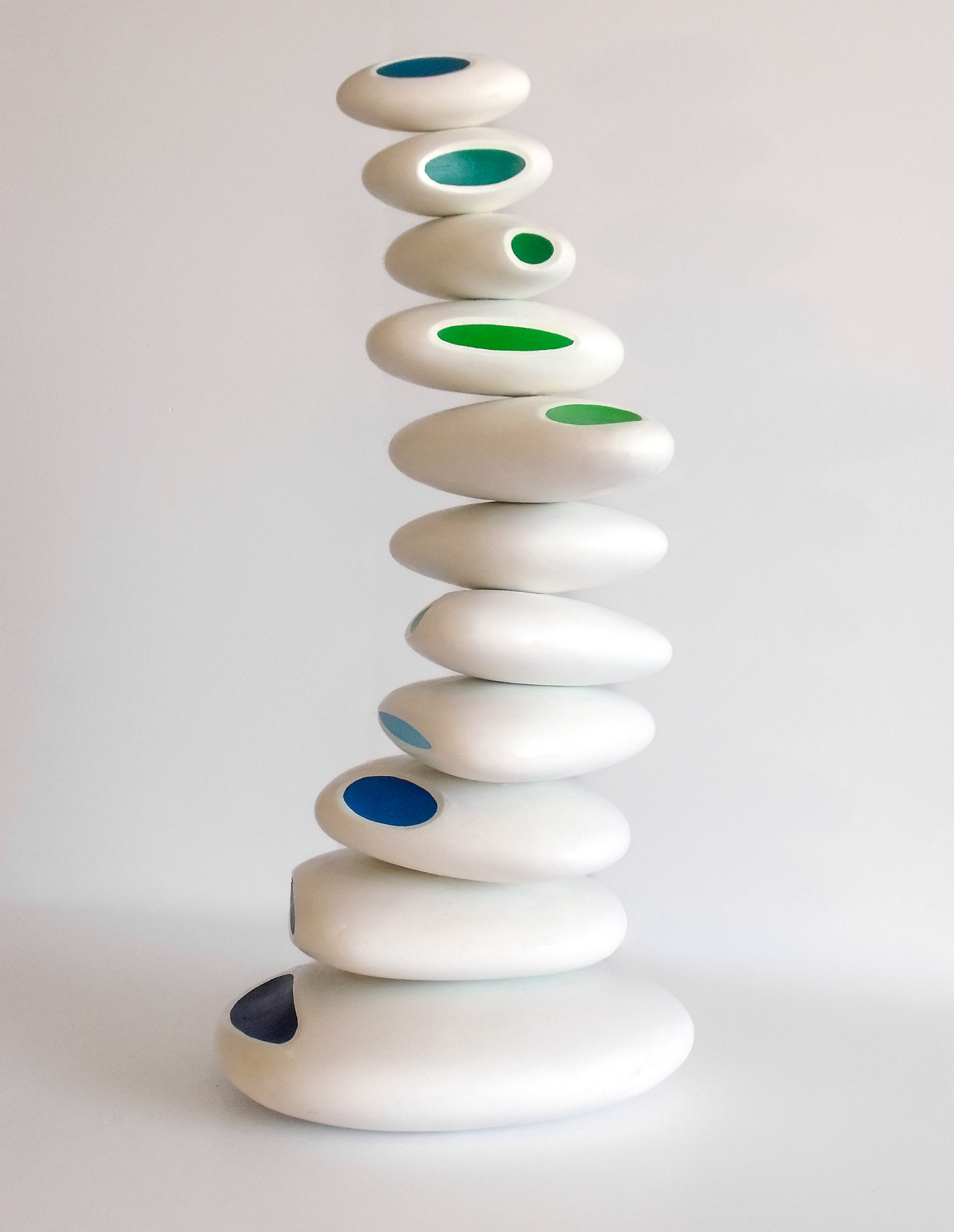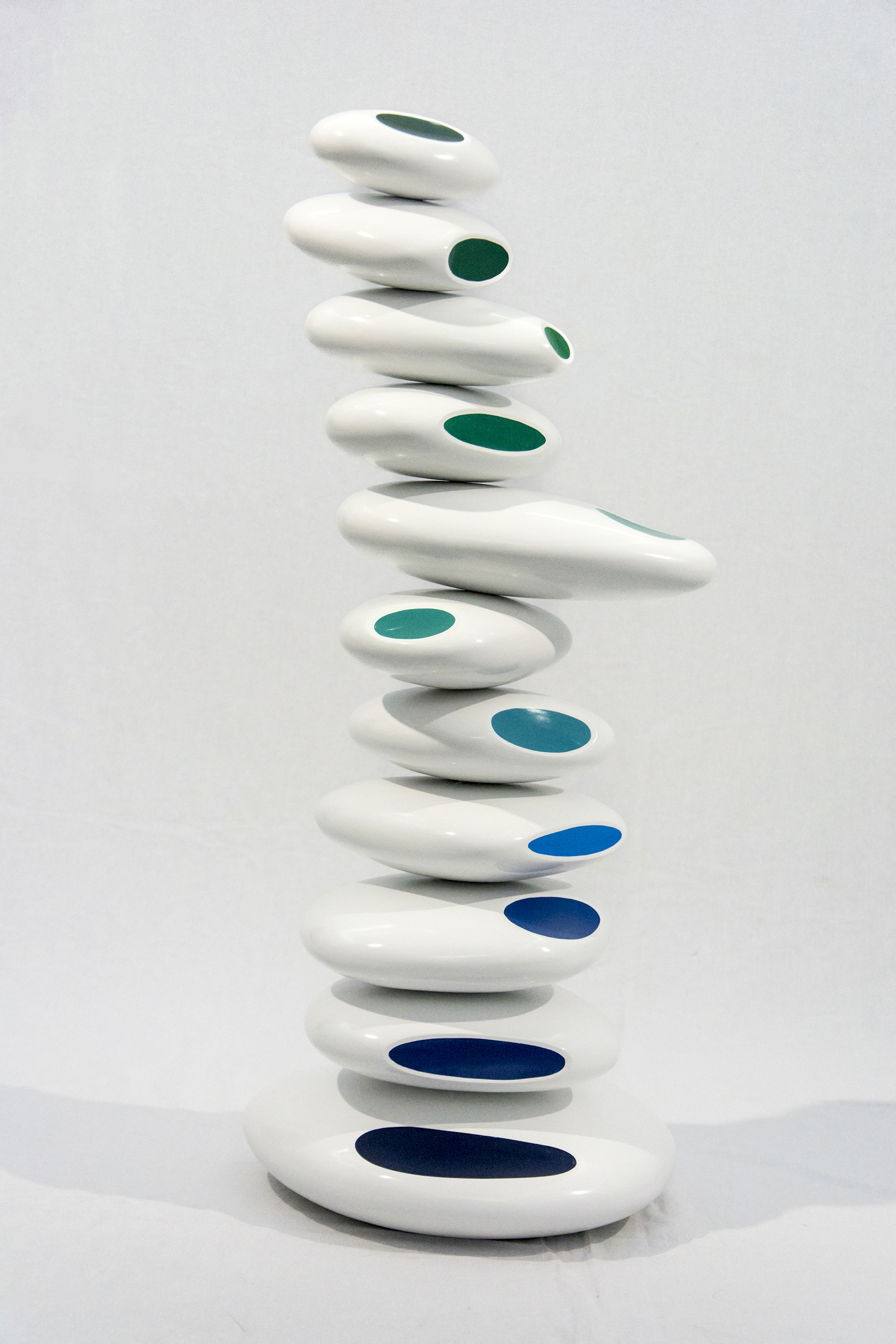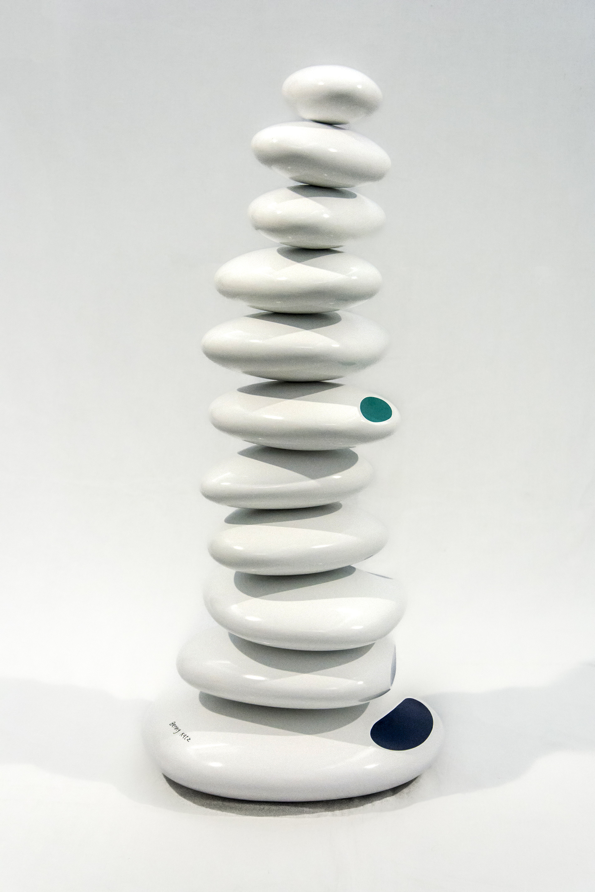 Brazilian born Benny Katz loved to draw as a child. He became a commercial graphic designer before he devoted himself to creating artwork. This dynamic sculpture—stacked glossy white ovals adorned with blue, green and black dots symbolizes ocean waves. The ideas for his playful, colourful modern pieces still begin with a sketch. This work is number 2 in an edition of 9."It's (the sketch) the way to get closest to or uncover the vague impressions in my head." Benny Katz
