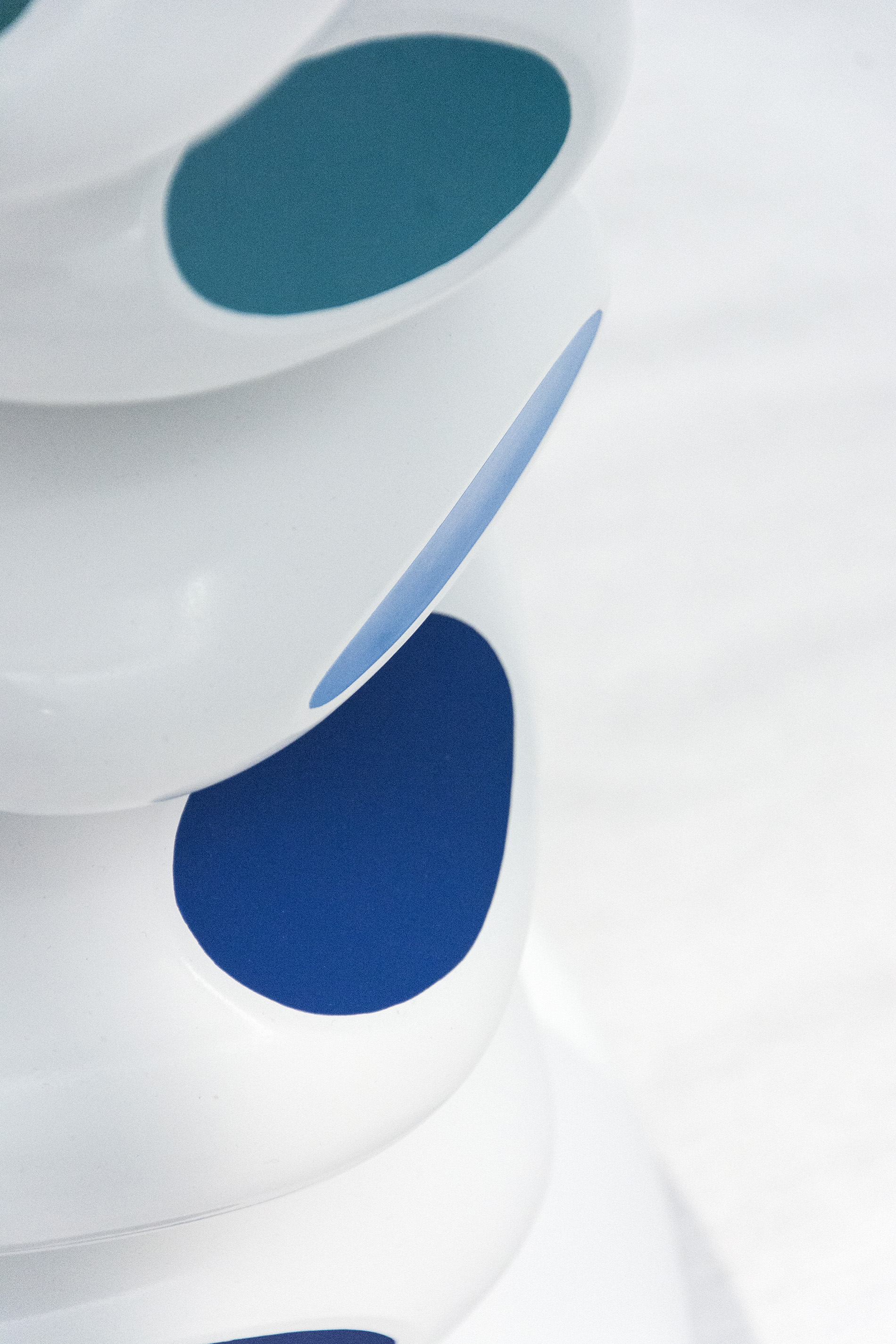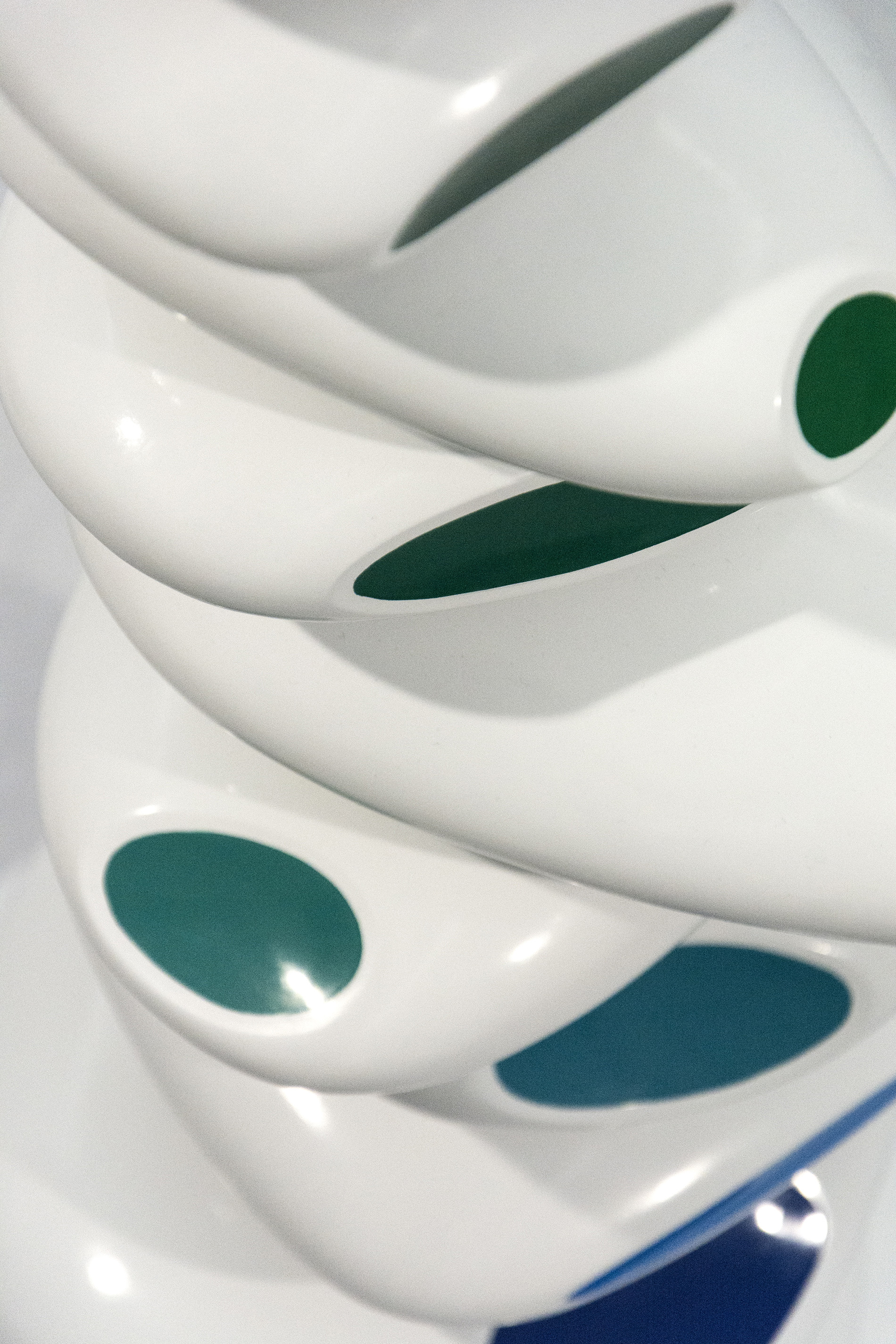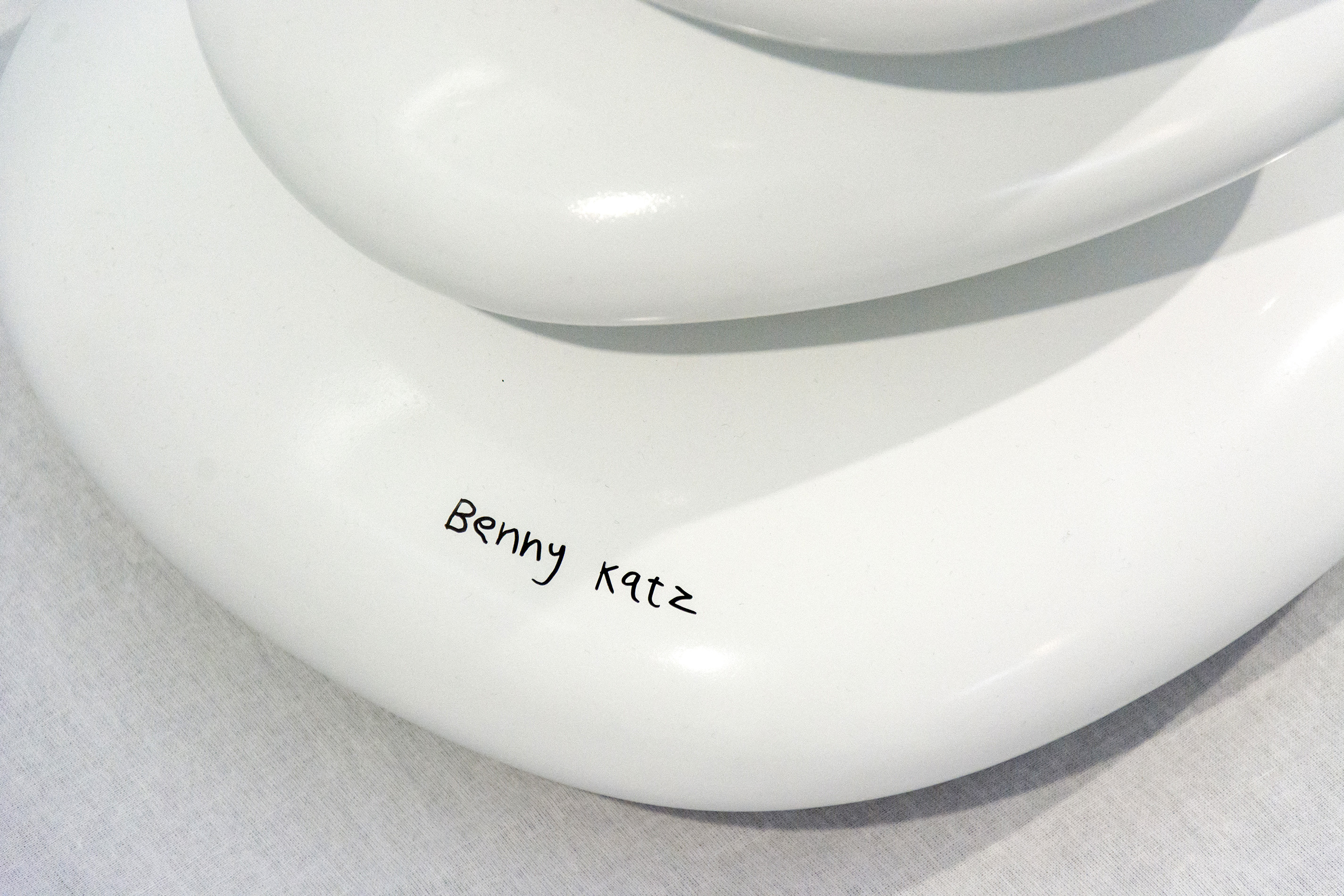 Brazilian born Benny Katz loved to draw as a child. He became a commercial graphic designer before he devoted himself to creating artwork. This dynamic sculpture—stacked glossy white ovals adorned with blue, green and black dots symbolizes ocean waves. The ideas for his playful, colourful modern pieces still begin with a sketch. This work is number 2 in an edition of 9."It's (the sketch) the way to get closest to or uncover the vague impressions in my head." Benny Katz