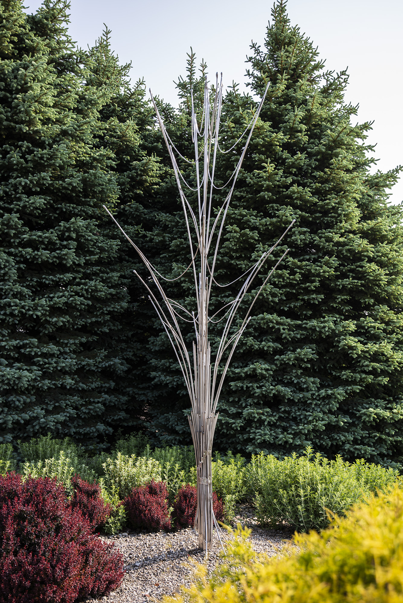 Quebec sculptor Bernard Hamel often looks to nature as a source of inspiration for his contemporary sculptures. Geyser emulates the fluid form of a spout of water erupting from the ground and shooting skyward. Forged from fine individual rods of stainless steel, this elegant and dynamic shape suggests turbulent motion. Geysers are a rare natural phenomenon. Hamel prefers to work in a variety of materials including wood and metals, often incorporating the sculpture into a natural environment.“My sculptural approach is essentially based on a direct relationship with the material….The material directs my gestures, determines my choices and the tools allow me, with their singularity, to model these shapes. Memories meet material to transform into a sculptural form with organic lines.” Bernard Hamel