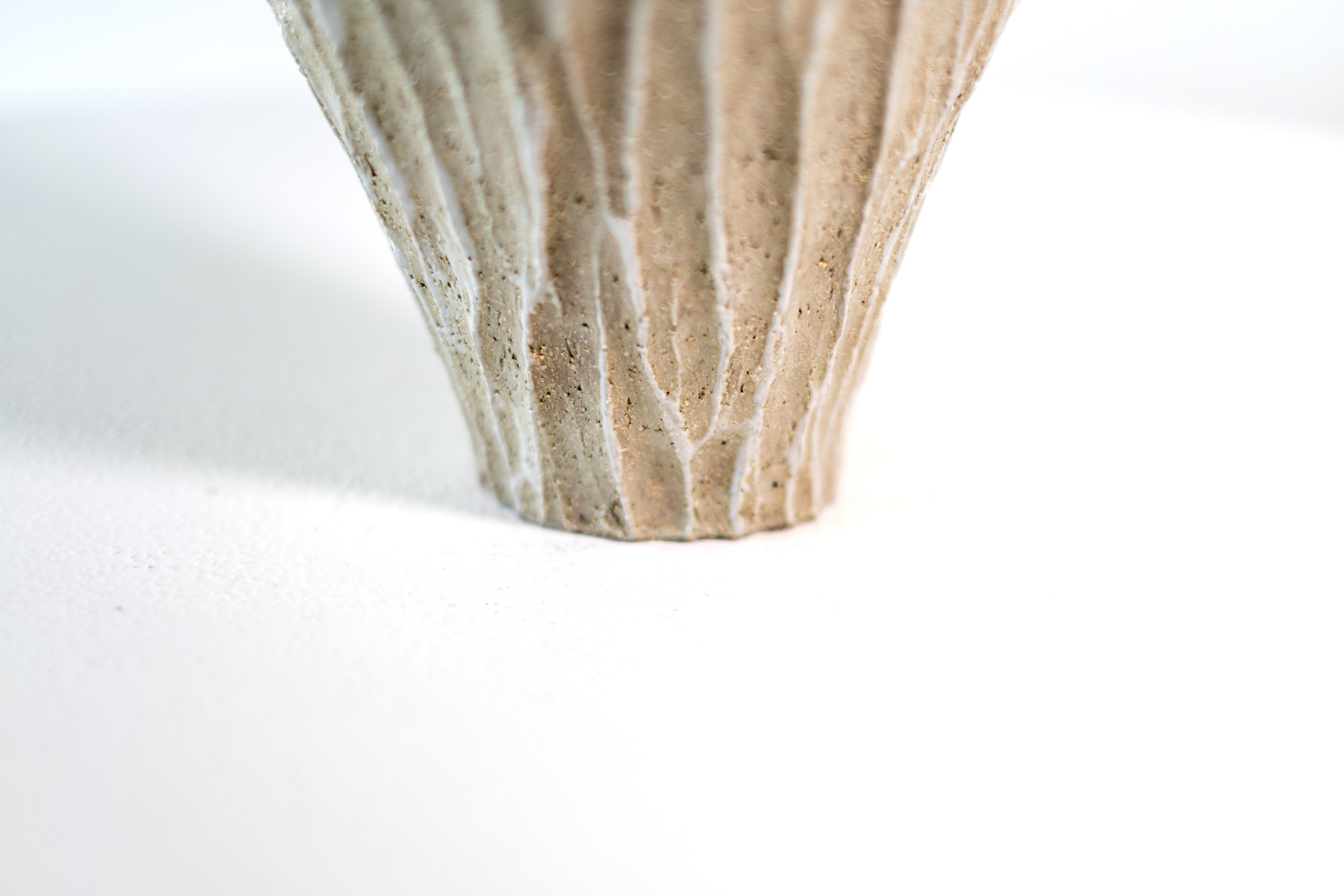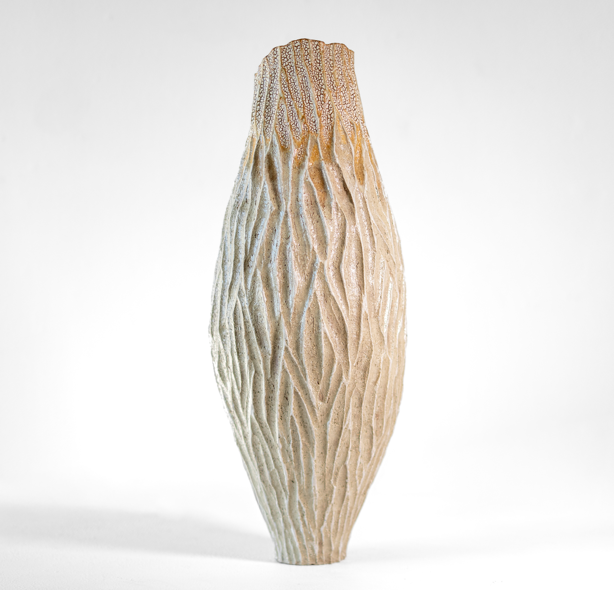 This unique tall ceramic vessel is handmade.Bill Greaves creates handsome contemporary ceramics inspired by the colours, forms and textures found in nature. The Canadian ceramicist hand coils his eclectic vessels to build the form. The remarkable visible texture of this elegant piece is created by carving the surface. The palette is a neutral off white. The interior is an earthy dark clay colour. The former architect loves the tactile quality of clay and the almost endless possibilities that working with this ancient material possesses. One of a series.