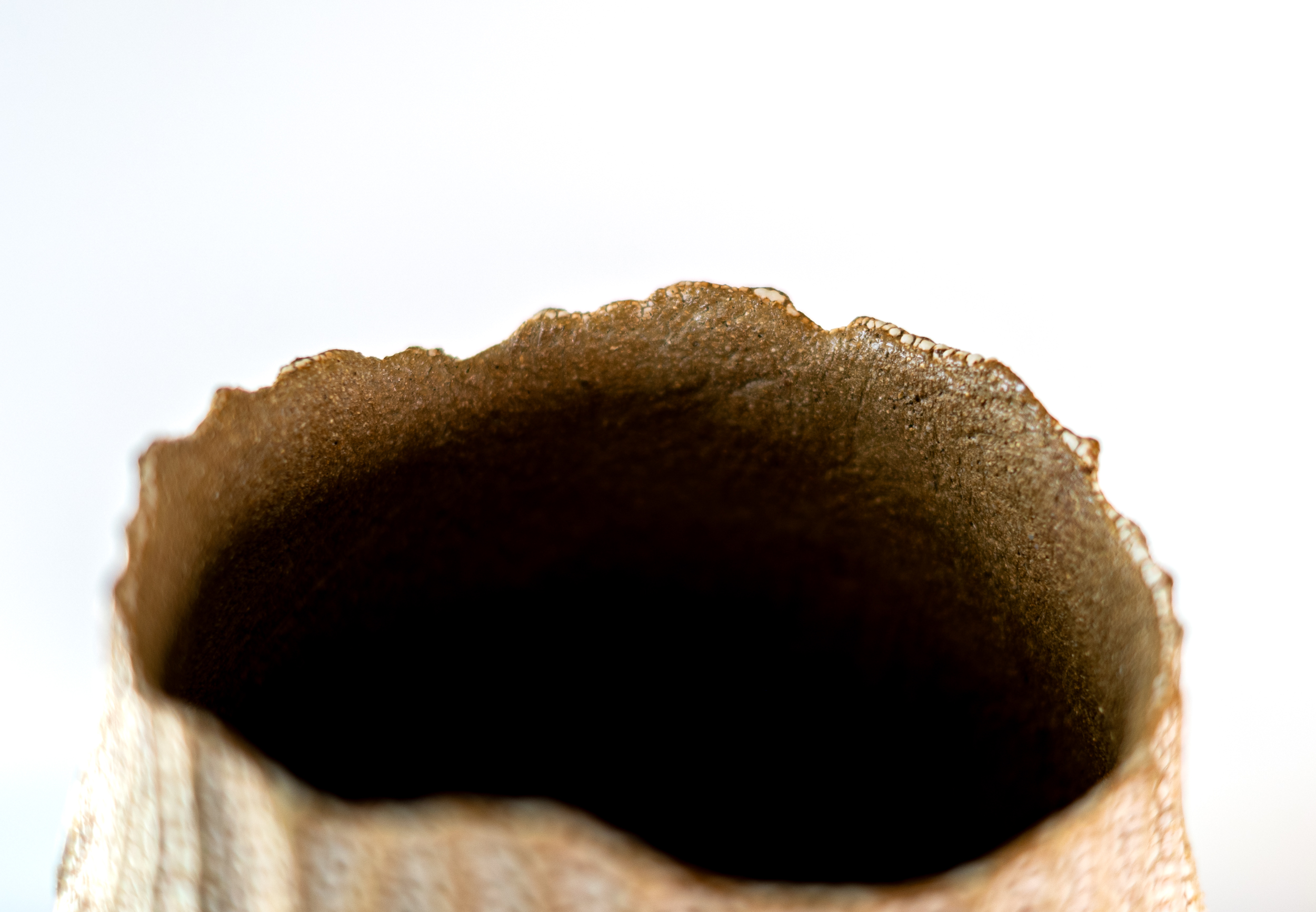This unique tall ceramic vessel is handmade.Bill Greaves creates handsome contemporary ceramics inspired by the colours, forms and textures found in nature. The Canadian ceramicist hand coils his eclectic vessels, building the forms. The remarkable visible texture of this elegant piece is created by carving the surface. The palette is a neutral off white. The interior is an earthy dark clay colour. The former architect loves the tactile quality of clay and the almost endless possibilities that working with this ancient material possesses. One of a series.