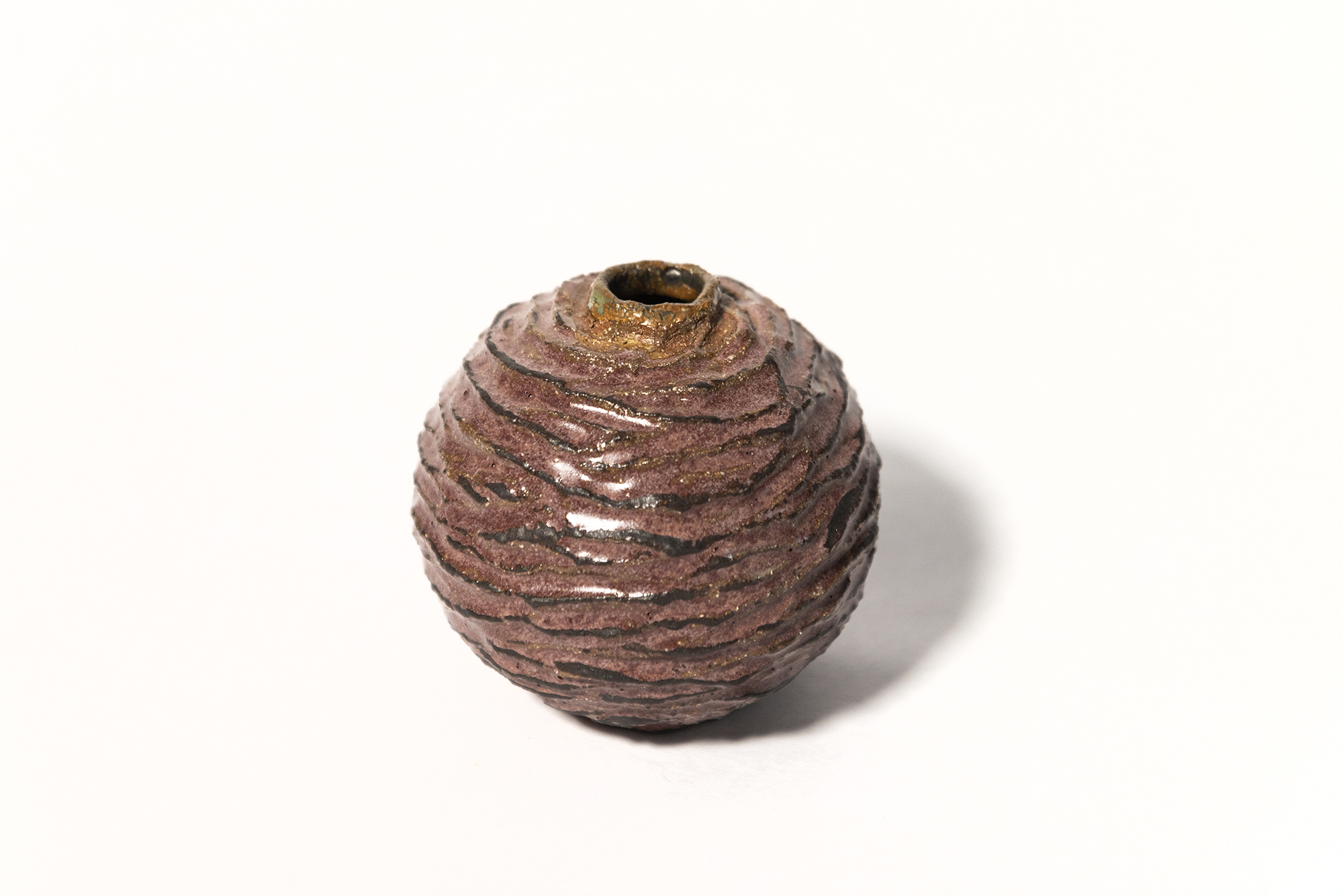This contemporary ceramic vessel is hand-built.The eclectic work of Bill Greaves is distinguished by organic shapes, rich saturated colour and visible texture. This series of small vessels are oval in form. Hand coiled, the clay is scraped, glazes are washed and then dry-brushed to build detail and texture. The sienna colour of the opening in each clay pod contrasts with the overall colour of black detail on a rhubarb coloured background. The remarkable visible texture of each piece is created by scraping and carving the surface. Layers of glaze add an attractive sheen.