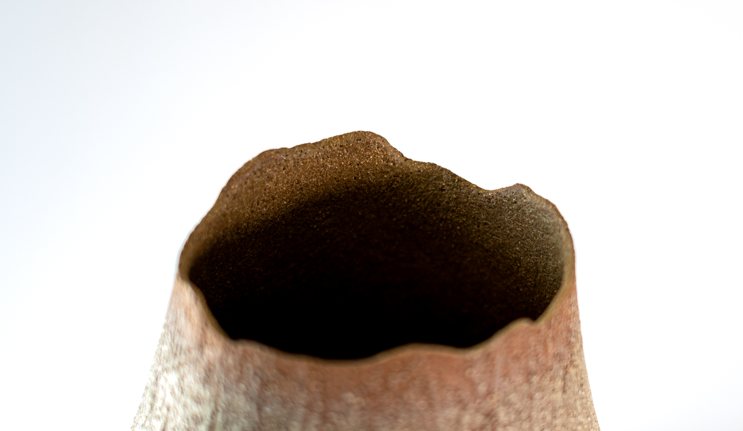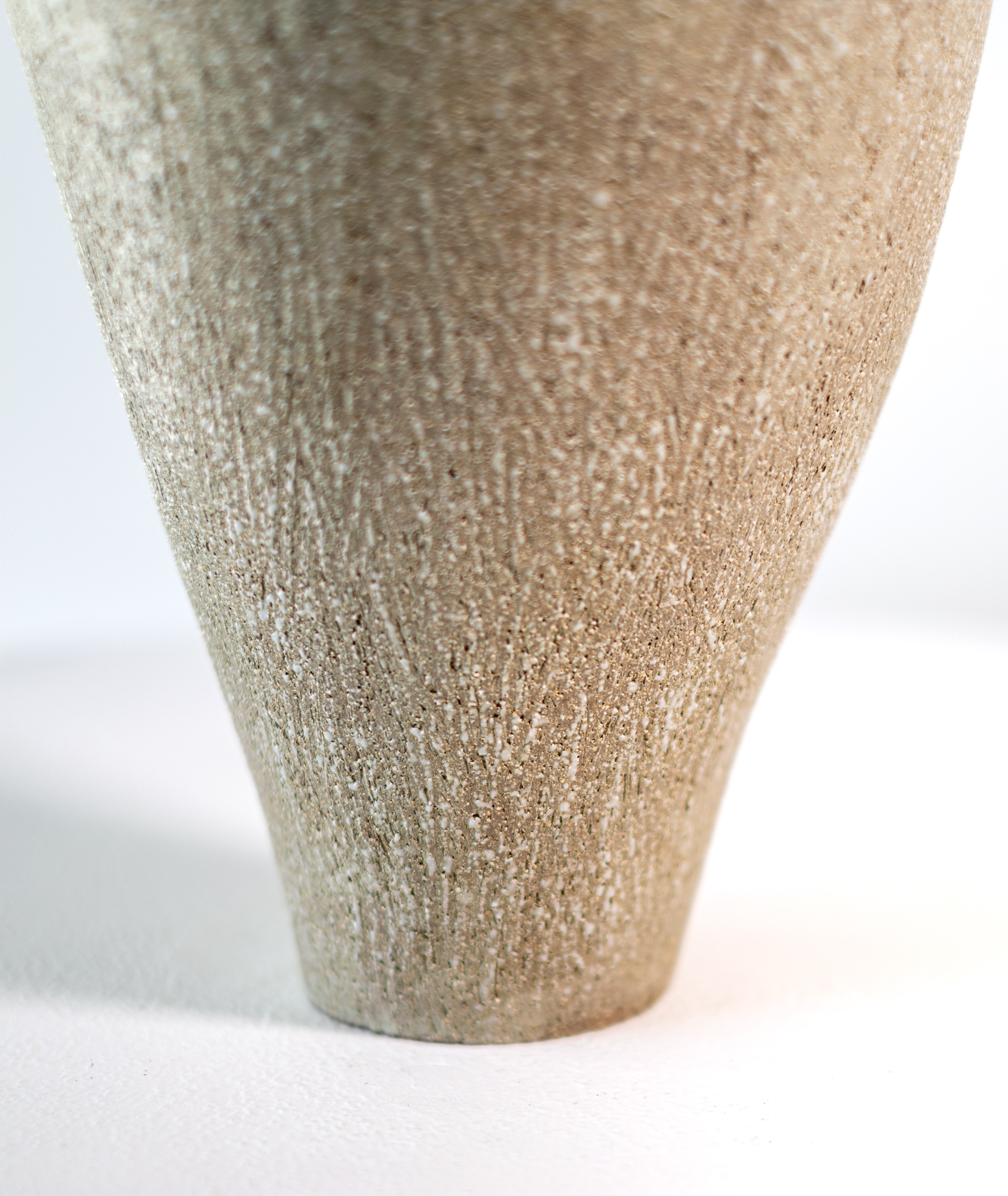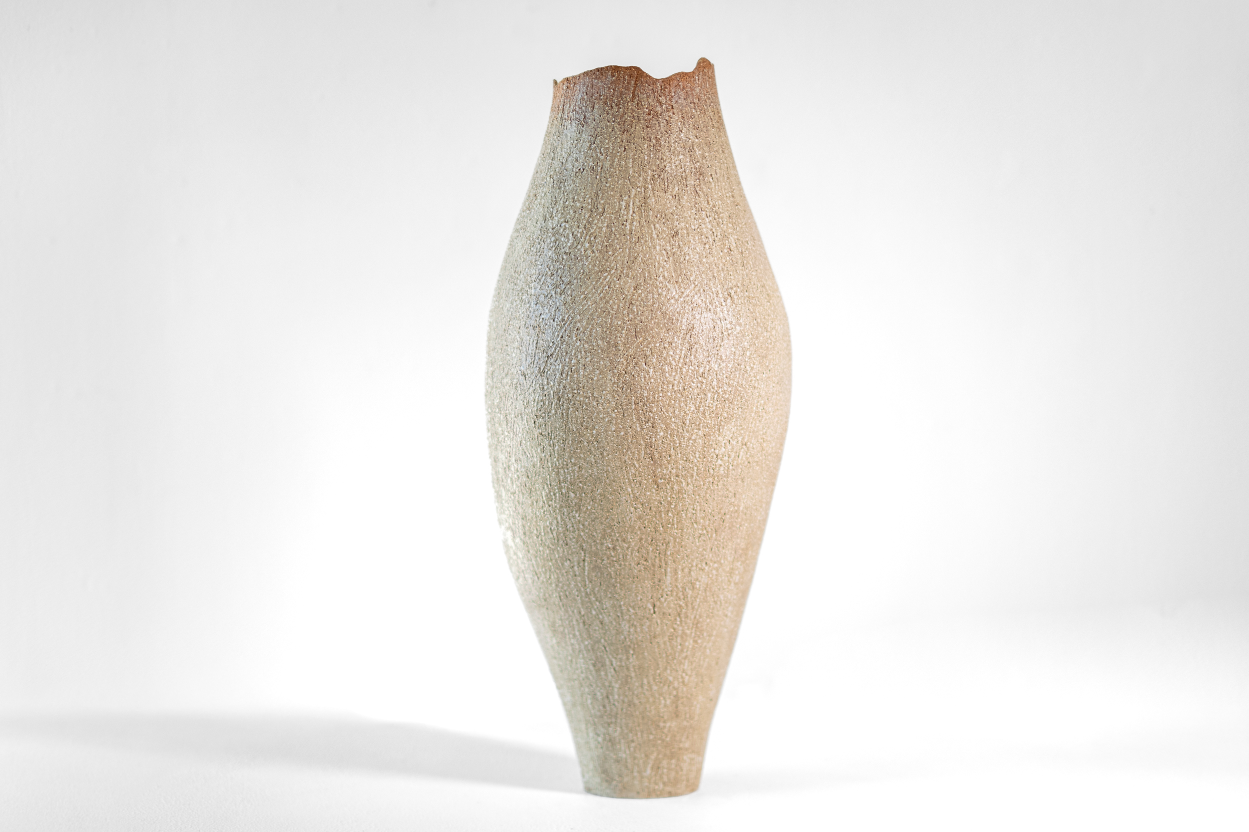 This unique tall ceramic vessel is handmade.Bill Greaves creates handsome contemporary ceramics inspired by the colours, forms and textures found in nature. The Canadian ceramicist hand coils his eclectic vessels, building the forms. The remarkable visible texture of this piece is created by scraping the surface. The palette of this elegant vase is a neutral off white. The interior is an earthy dark clay colour. The former architect loves the tactile quality of clay and the almost endless possibilities that working with this ancient material possesses.