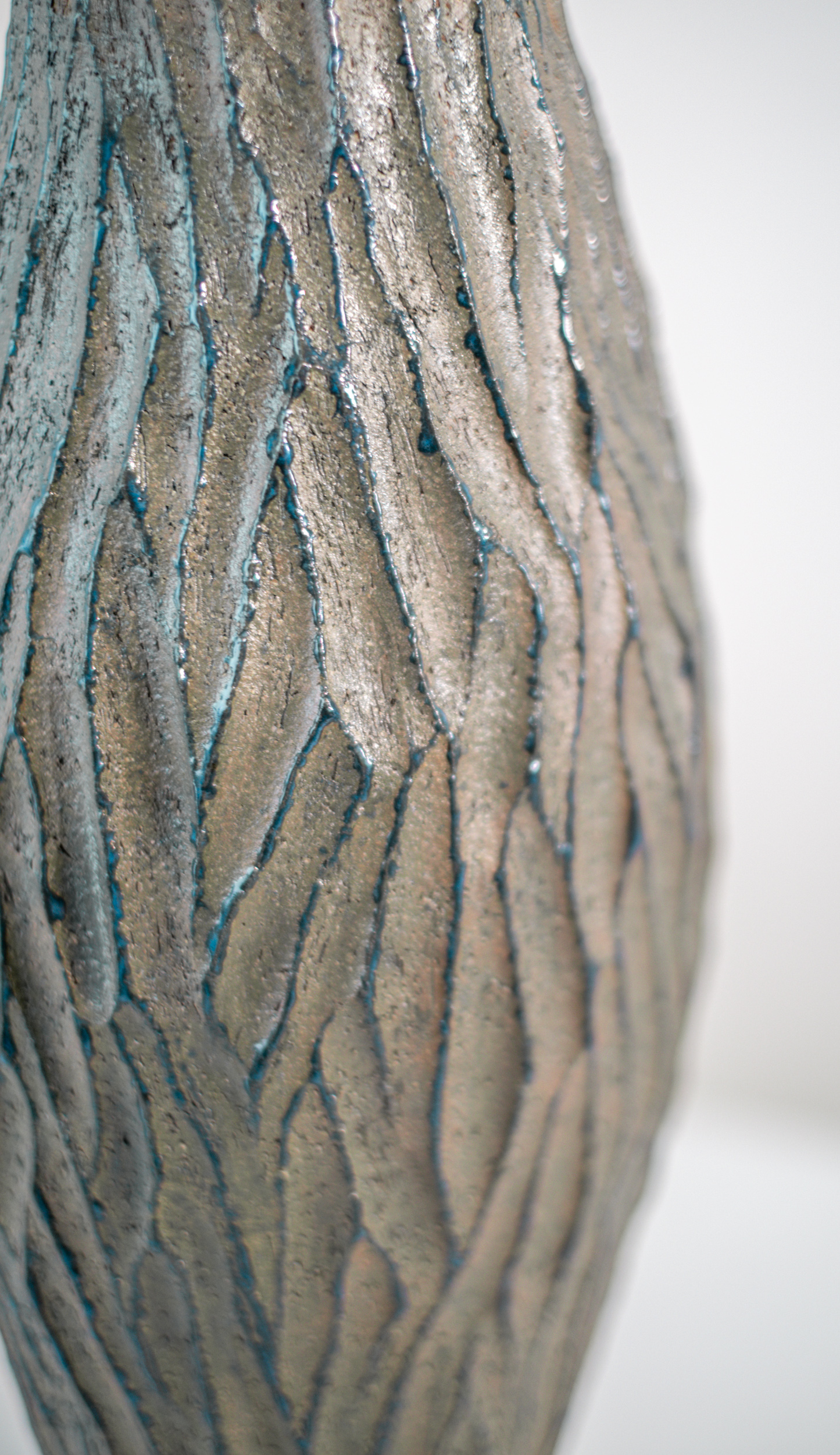 This contemporary tall ceramic vessel is handmade.Bill Greaves creates handsome contemporary ceramics inspired by the colours, forms and textures found in nature. The Canadian ceramicist hand coils his eclectic vessels to build the form. The remarkable visible texture of this elegant piece is created by carving the surface. The palette is neutral—the raised surface pattern highlighted by moss green. The interior is an earthy dark clay colour. The sienna coloured rim of the vase is irregular—a characteristic that adds to its bespoke form. The former architect loves the tactile quality of clay and the almost endless possibilities that working with this ancient material possesses. One of a series.
