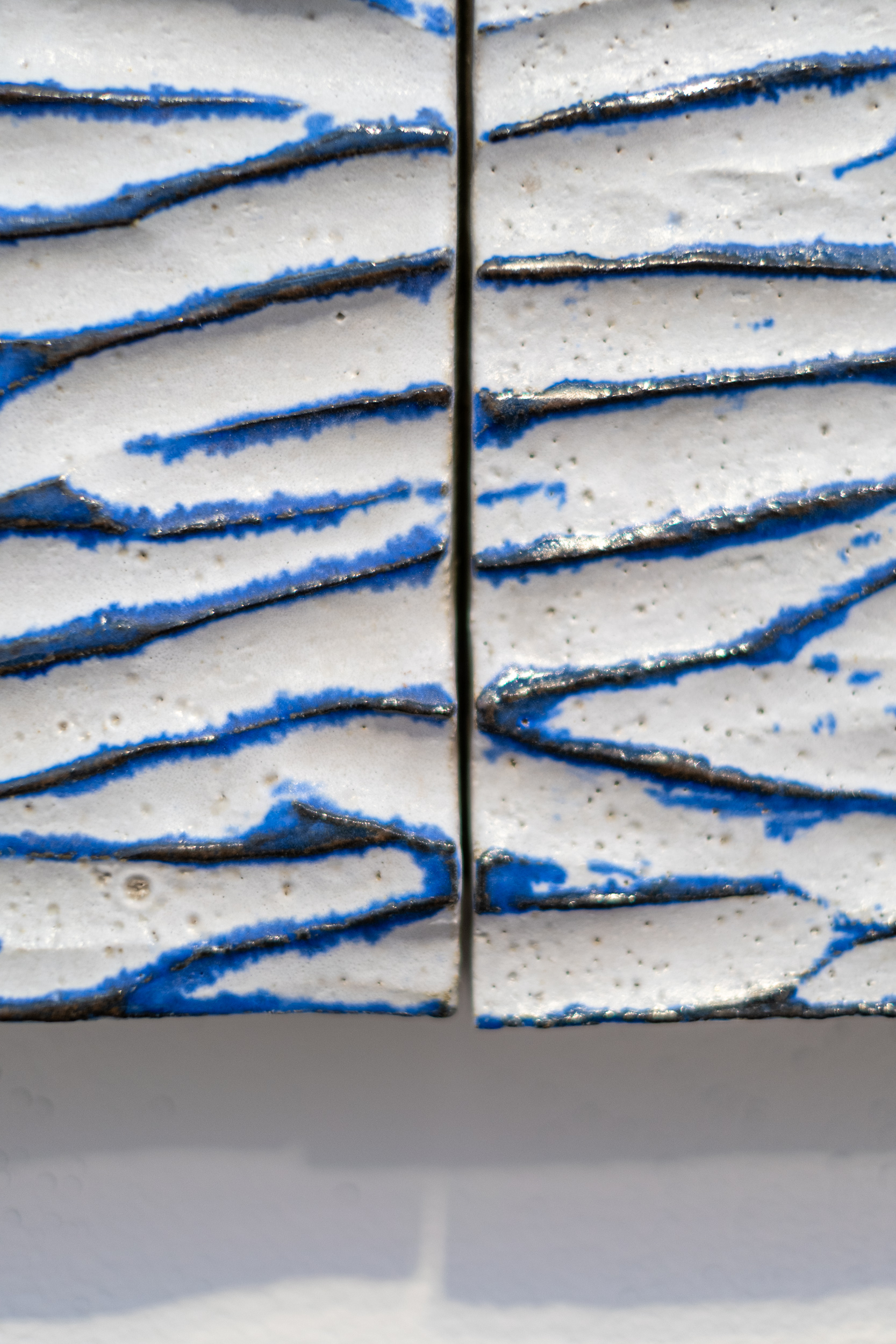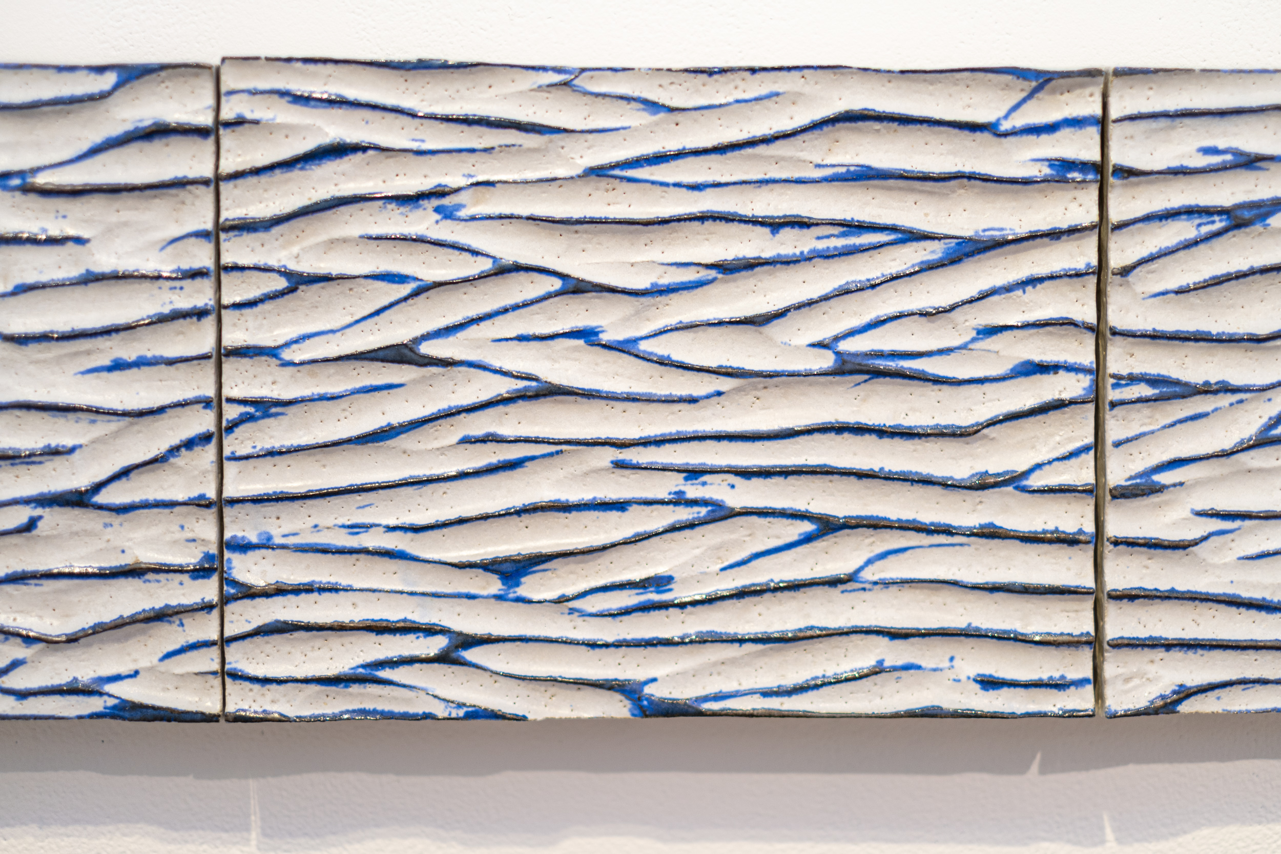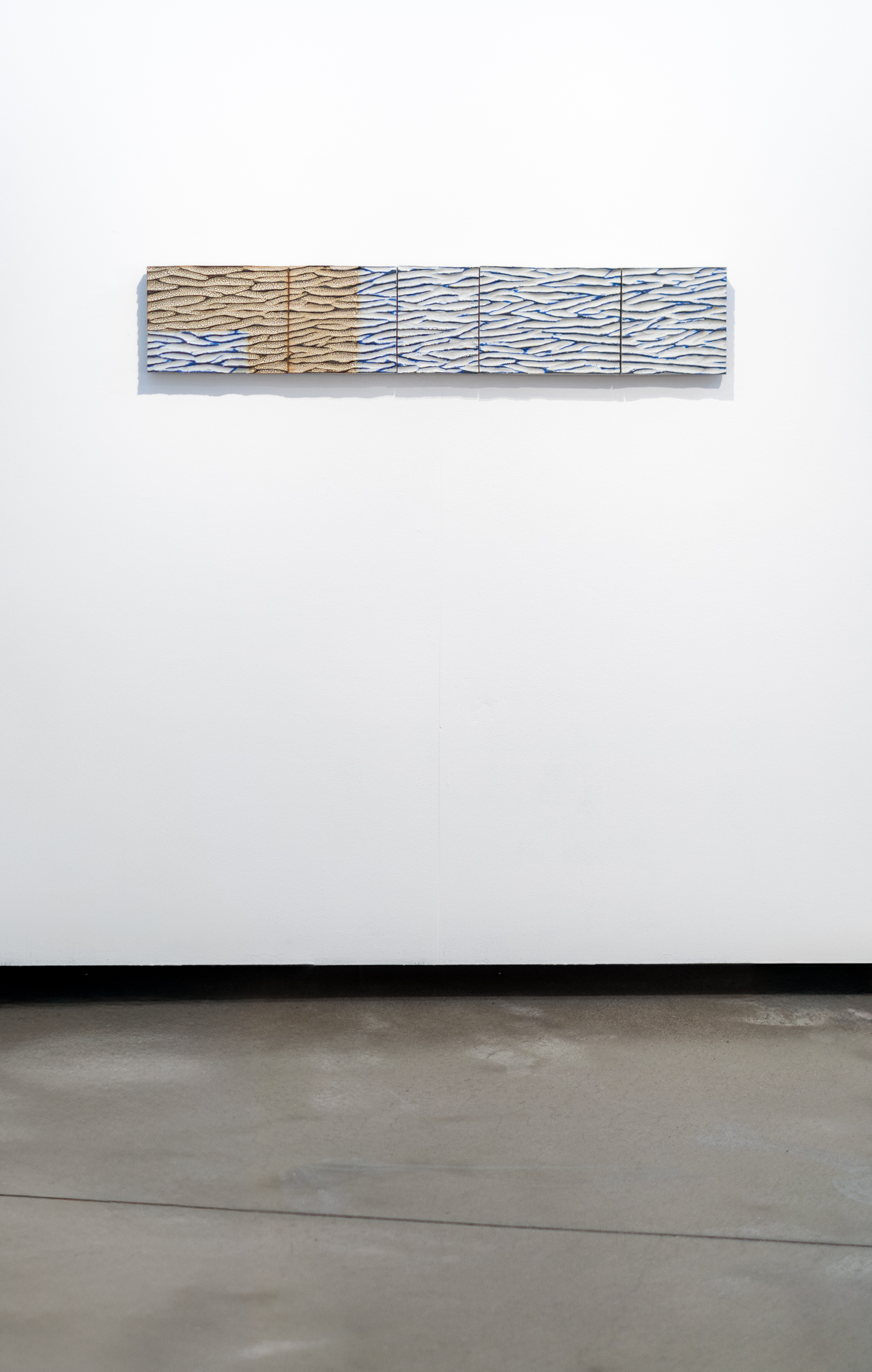 The contemporary horizontal panels of this wall composition are handmade in ceramic.On his Instagram post, Bill Greaves has a series of photographs taken from the shoreline of his family farm. The photos record the horizon line—that imaginary line that appears to divide the water from the sky. This powerful imagery appears to have found a new expression in the form of a ceramic ‘mural’—effectively an abstracted landscape. In his own ceramic work, Greaves is often inspired by the colours, patterns and forms found in nature. This series of five panels—each one hand-formed and joined with a vertical seam creates a dynamic and modern horizontal composition. As with much of his ceramic art, the panels have a distinctive ripple texture—the result of hand-carving the surface of the clay.