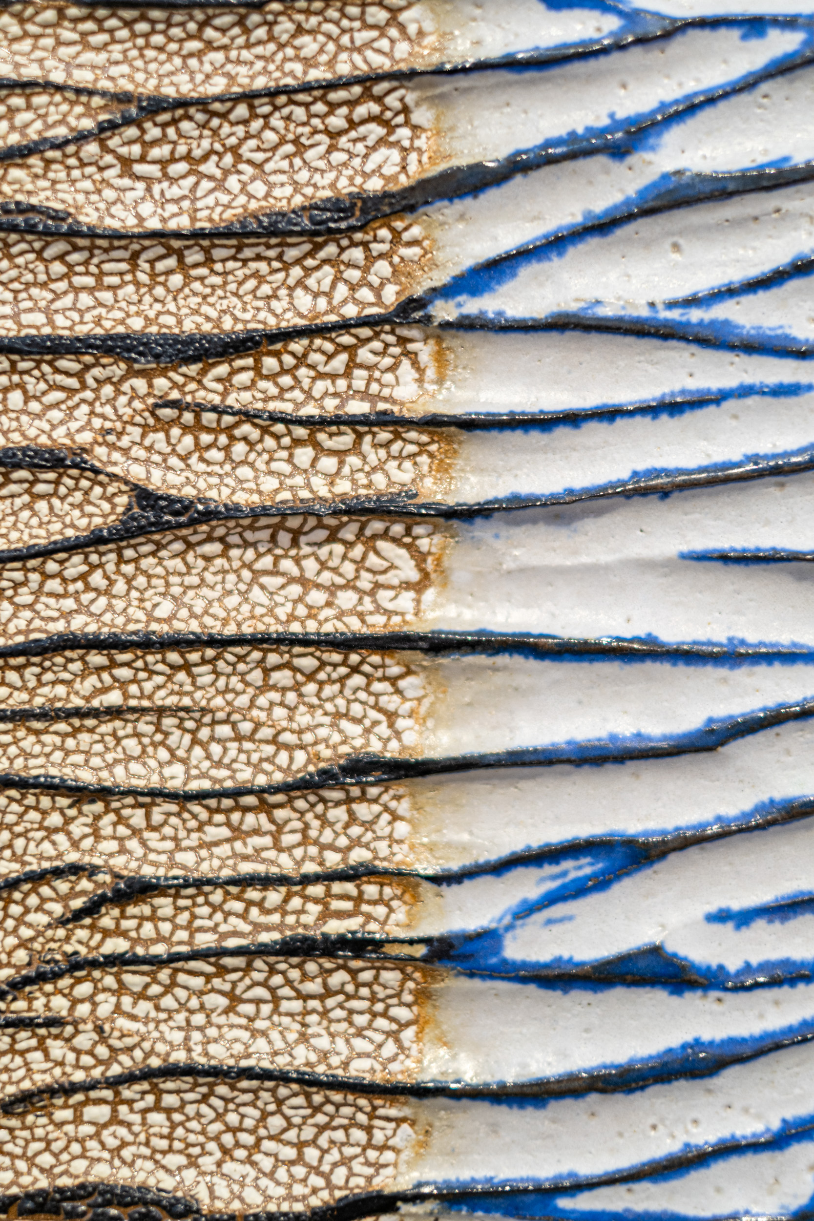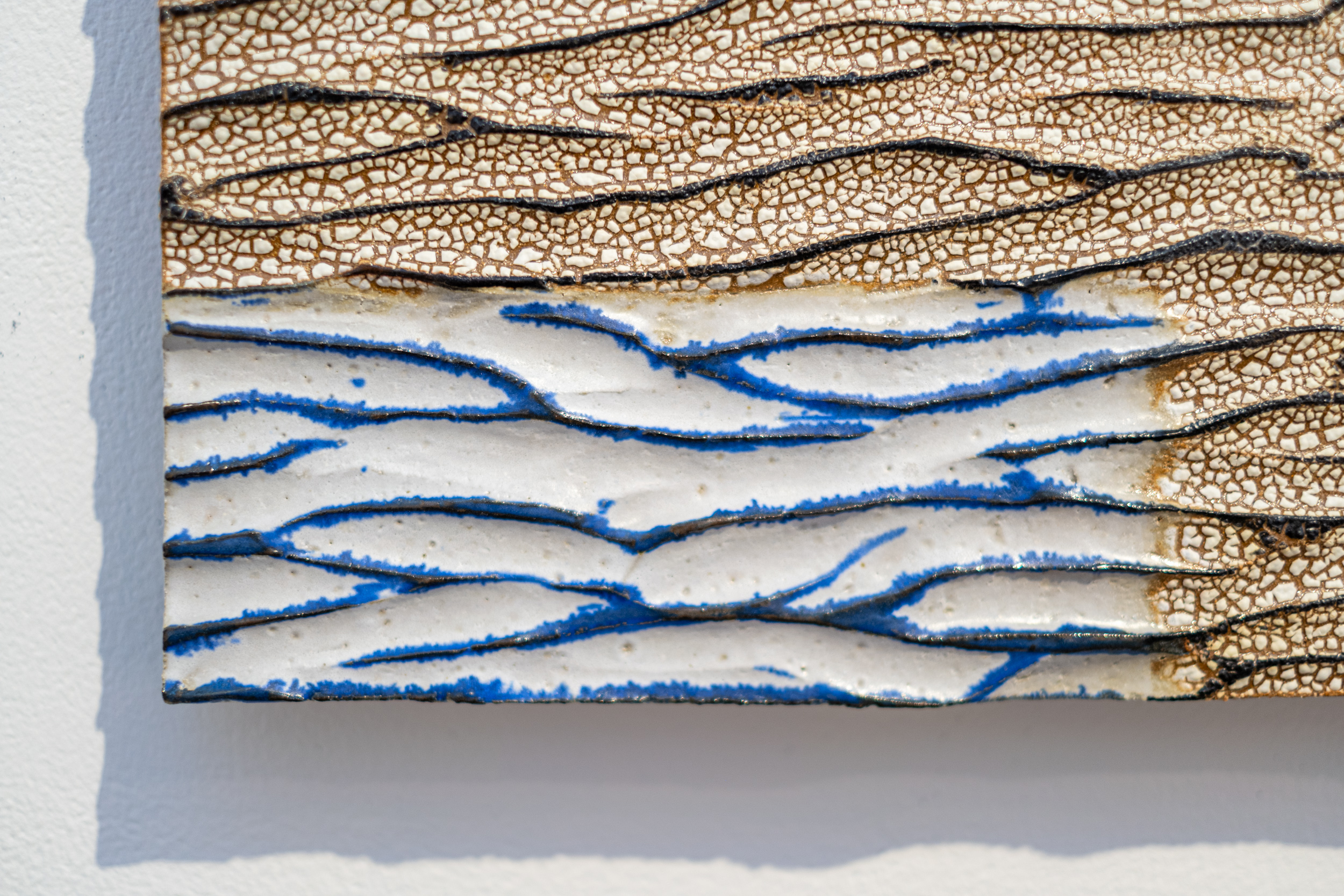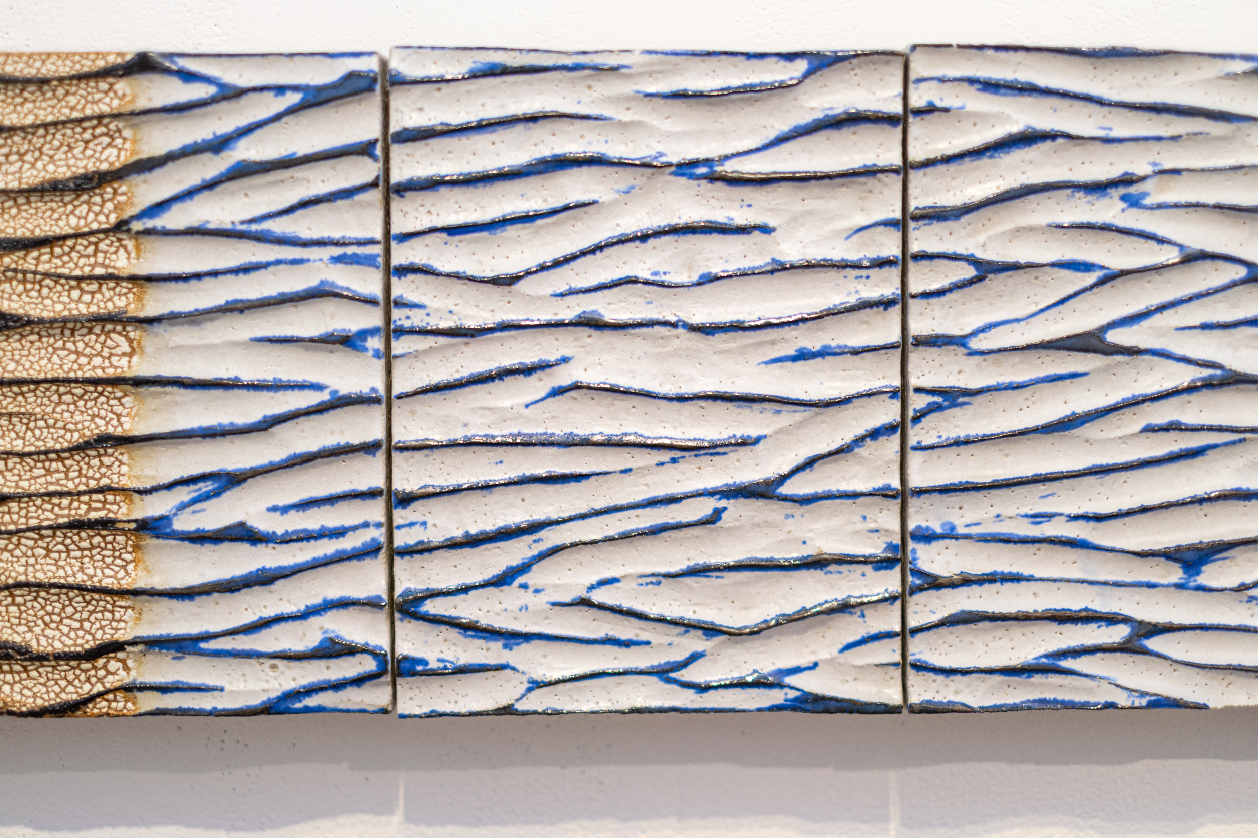 One panel has attractive markings that are naturally caused by a particular glaze that shrinks and bubbles up as it dries, leaving behind a ‘dry river bed pattern.’ The palette of this piece is earthy and neutral, highlighted by a deep blue.