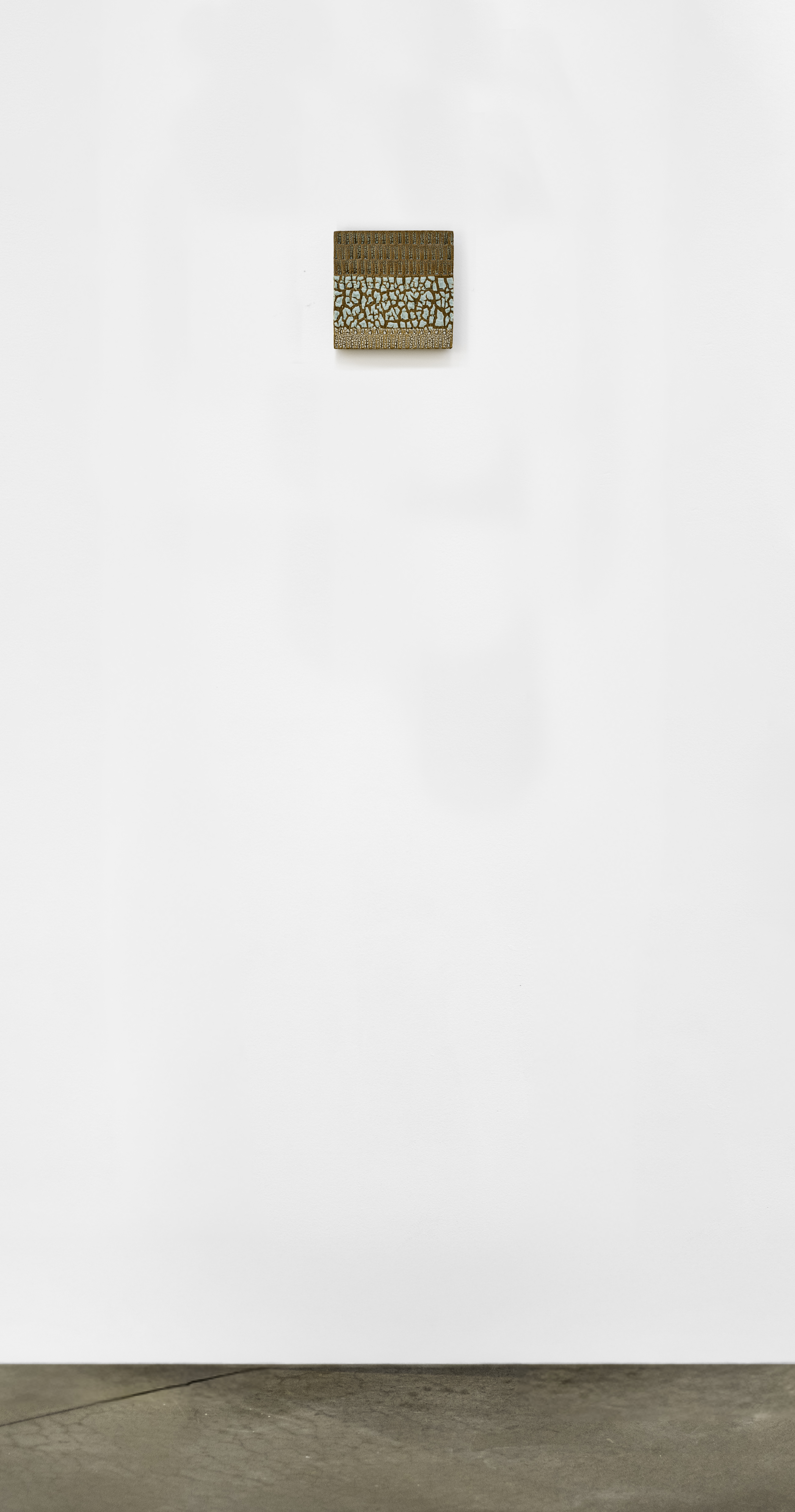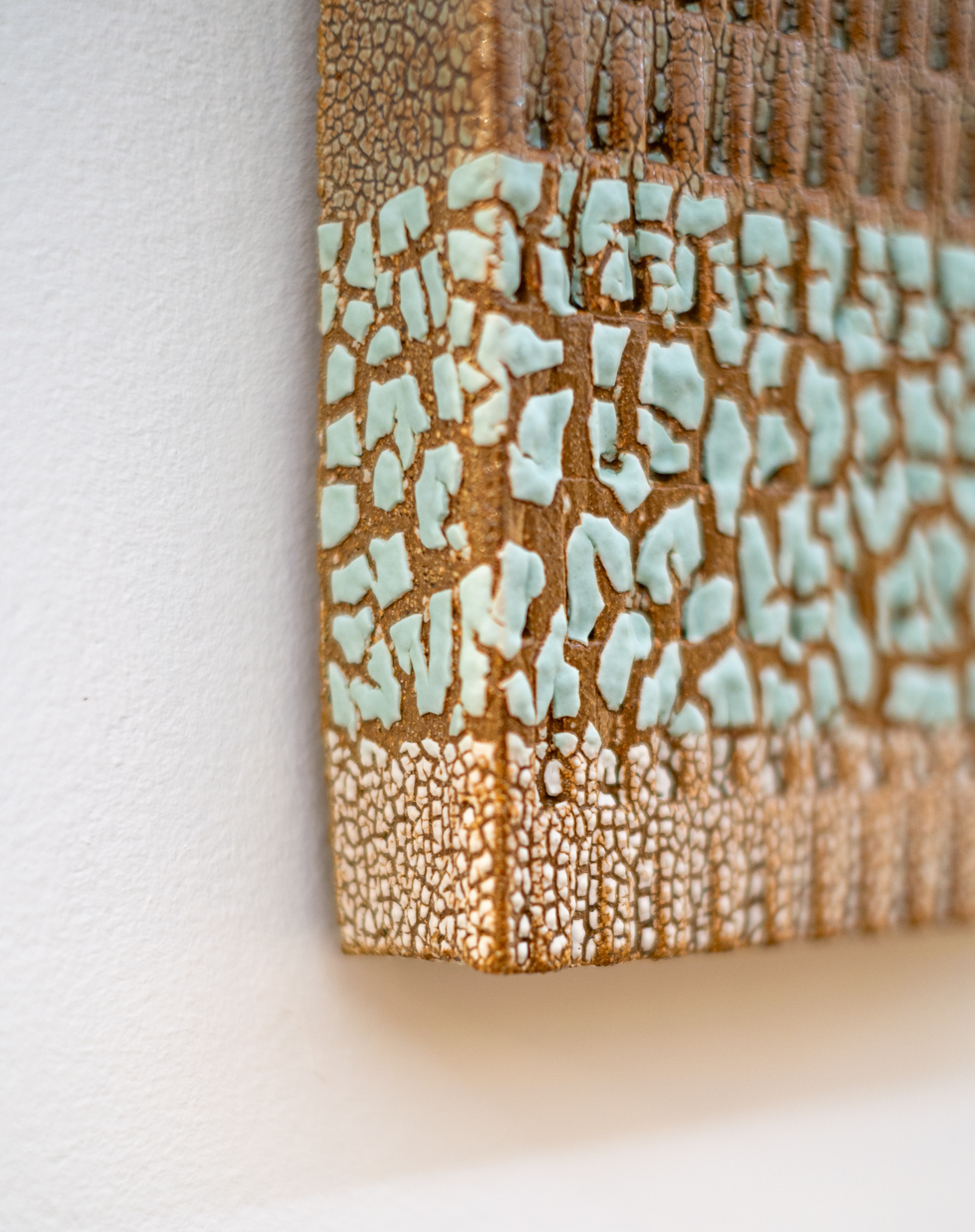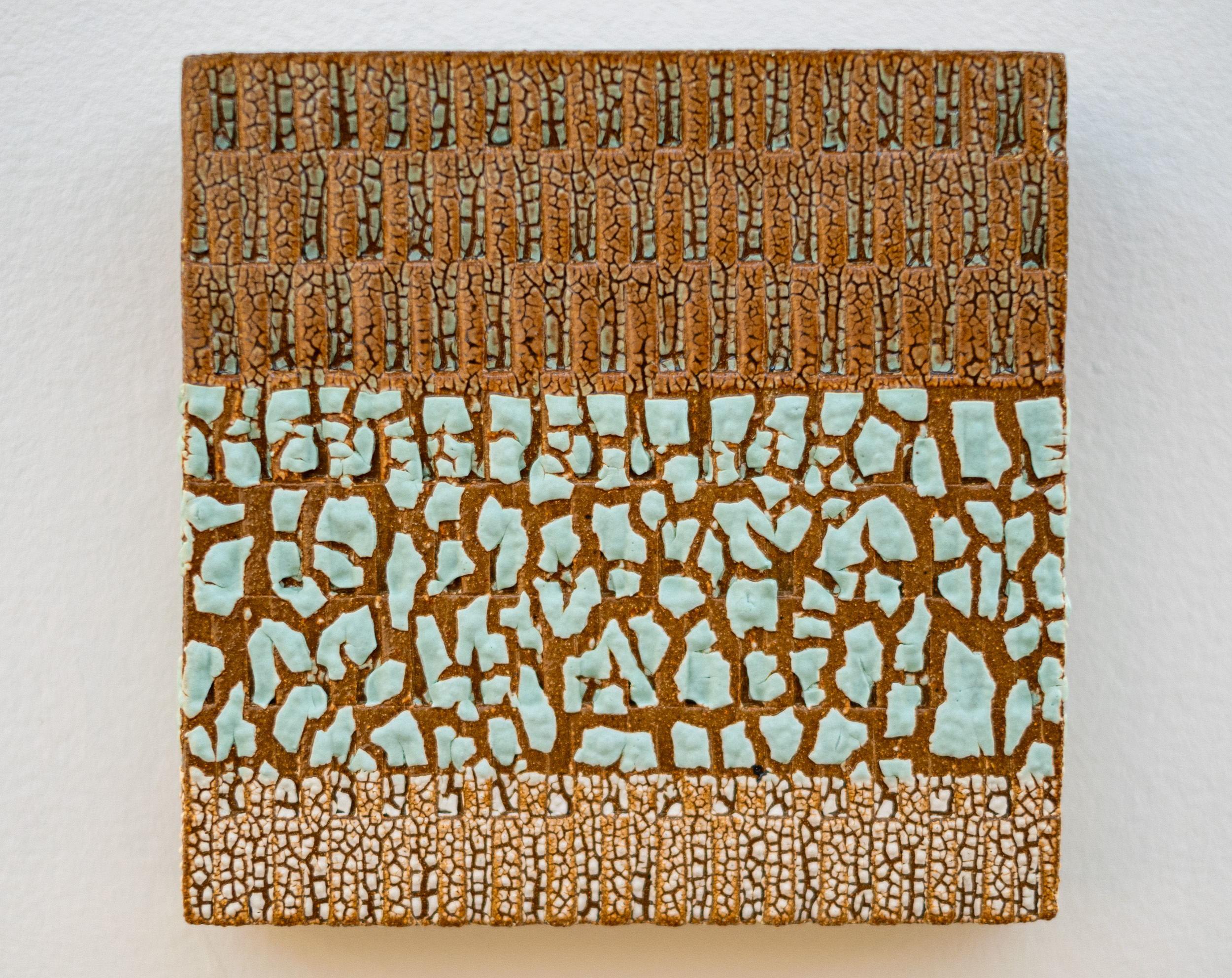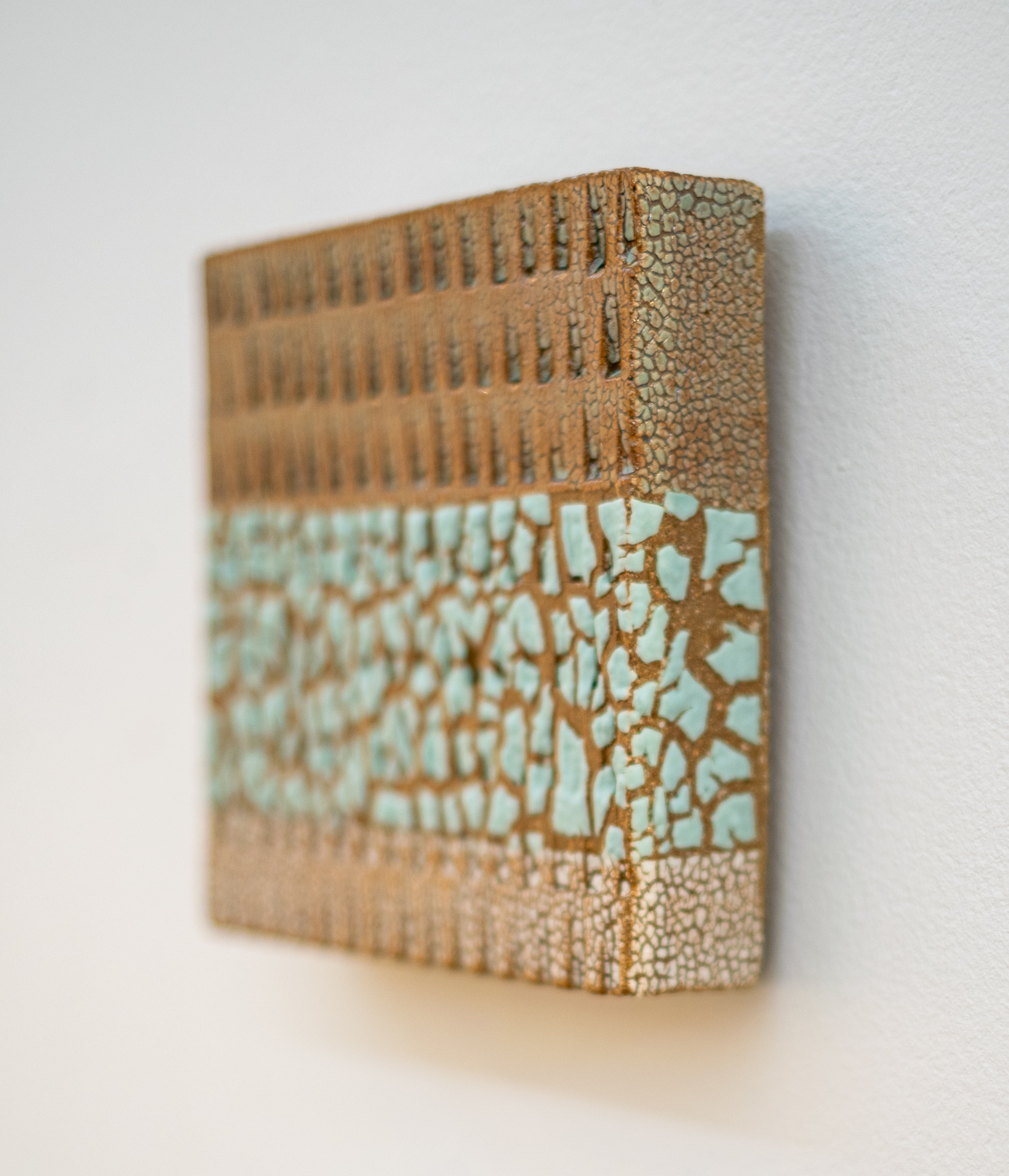 This contemporary ceramic wall tile is handmade.Bill Greaves exhibits and has attracted collectors of fine ceramic art both here in Canada and the U.S. A former architect, Greaves continues to experiment and explore the properties of clay, often making hundreds of test tiles to find glazes, colours and patterns he likes. His work centers on hand-built vessels whose surfaces are scraped and carved to create unique details. But, he has begun to integrate his architectural background with his ceramic work by also creating ceramic surfaces—murals and tiles for buildings and furniture. This series of individual square tiles exhibits his superb craftsmanship. The colours are earthy and rich, the textures visible, and the woven patterns distinctive. This tile is a dark clay colour, with craquelure detail and a pop of turquoise coloured puzzle-piece like shapes. One of a series that, when grouped together, make an attractive wall composition.