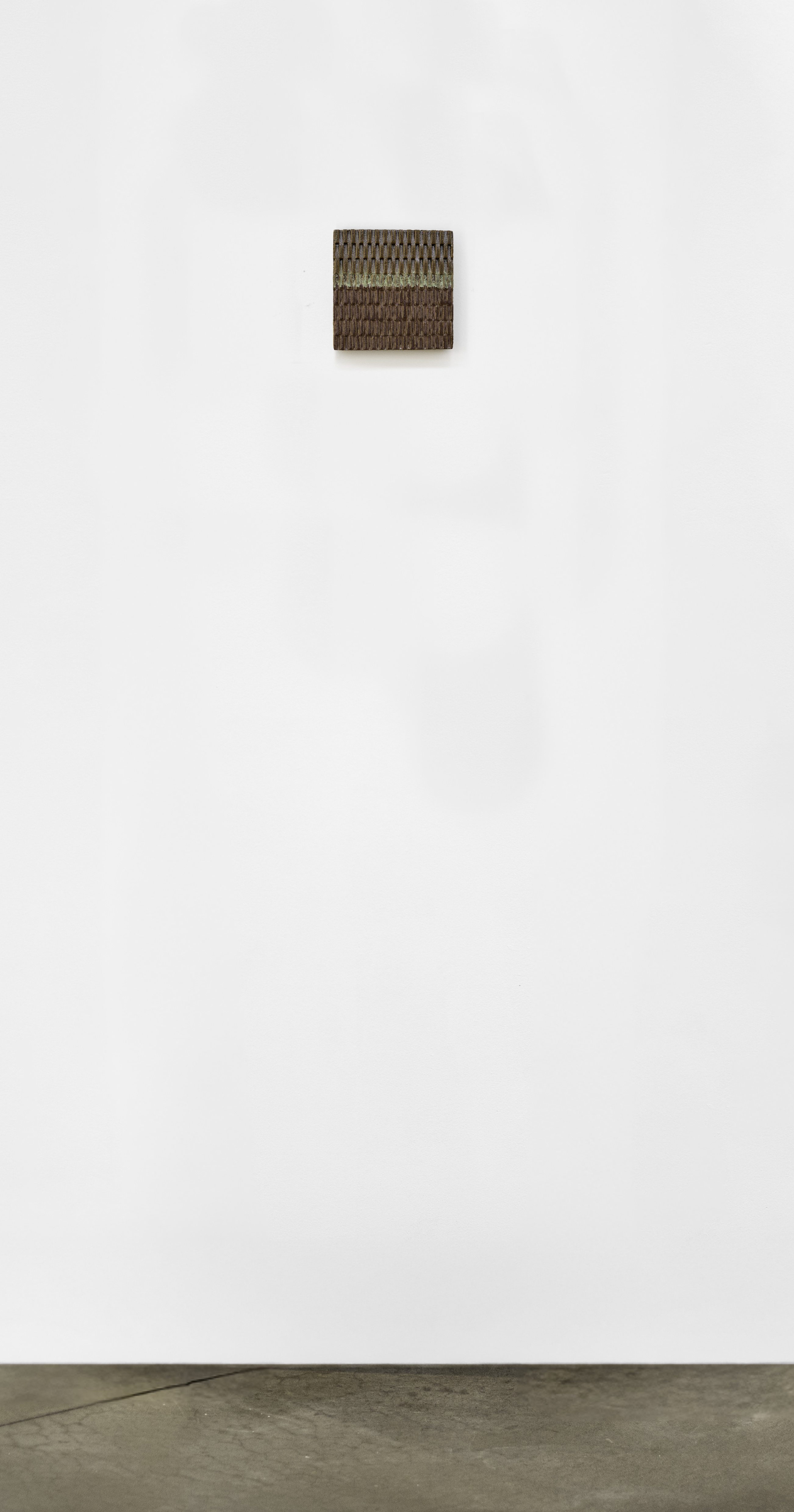 This contemporary ceramic wall tile is handmade.Bill Greaves exhibits and has attracted collectors of fine ceramic art both here in Canada and the U.S. A former architect, Greaves continues to experiment and explore the properties of clay, often making hundreds of test tiles to find glazes, colours and patterns he likes. His work centers on hand-built vessels whose surfaces are scraped and carved to create unique details. But, he has begun to integrate his architectural background with his ceramic work by also creating ceramic surfaces—murals and tiles for buildings and furniture. This series of individual square tiles exhibits his superb craftsmanship. The colours are earthy and rich, the textures visible, and the woven patterns distinctive. This tile is a dark clay colour, with craquelure detail and a narrow band of soft green for contrast. One of a series that, when grouped together make an attractive wall composition.