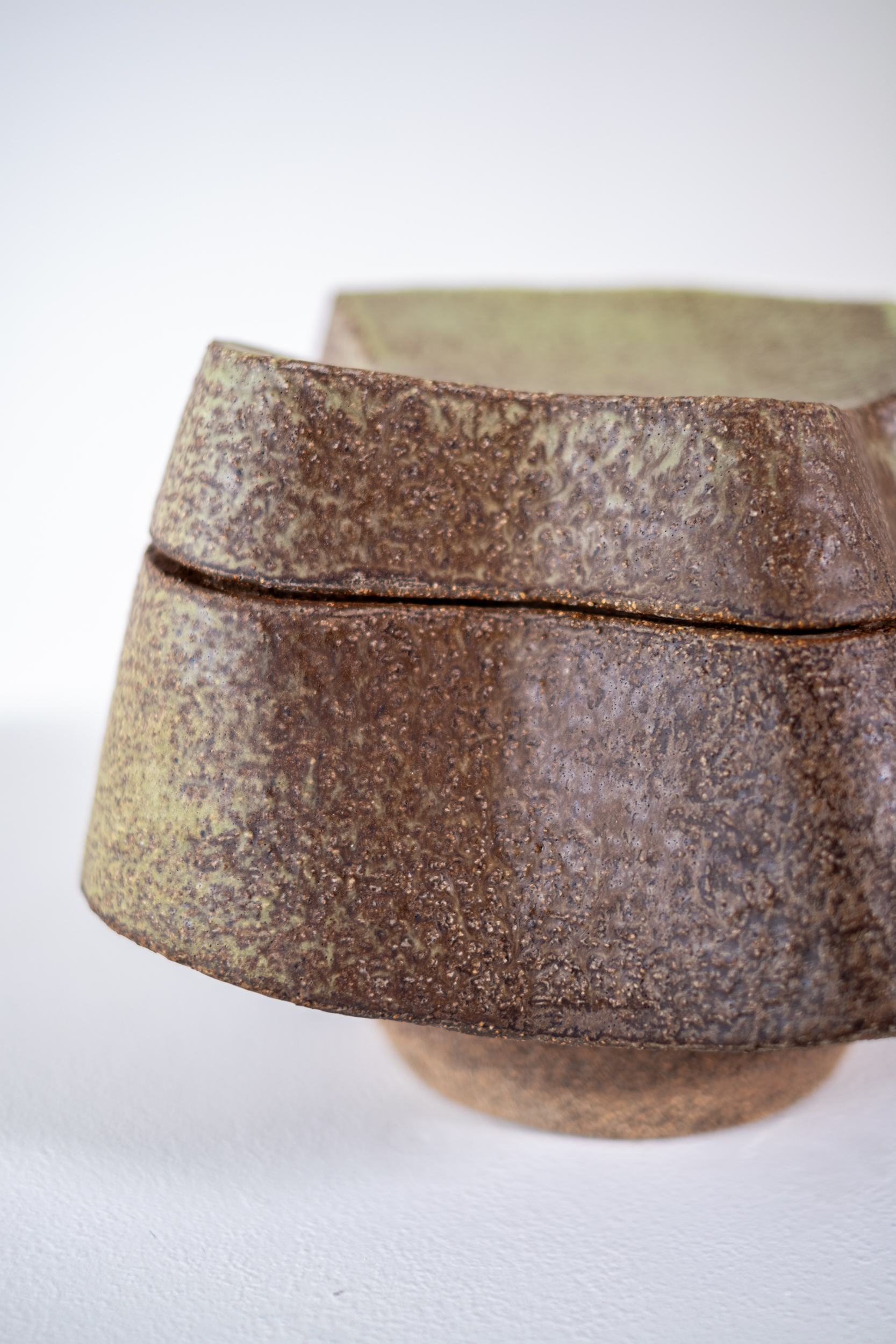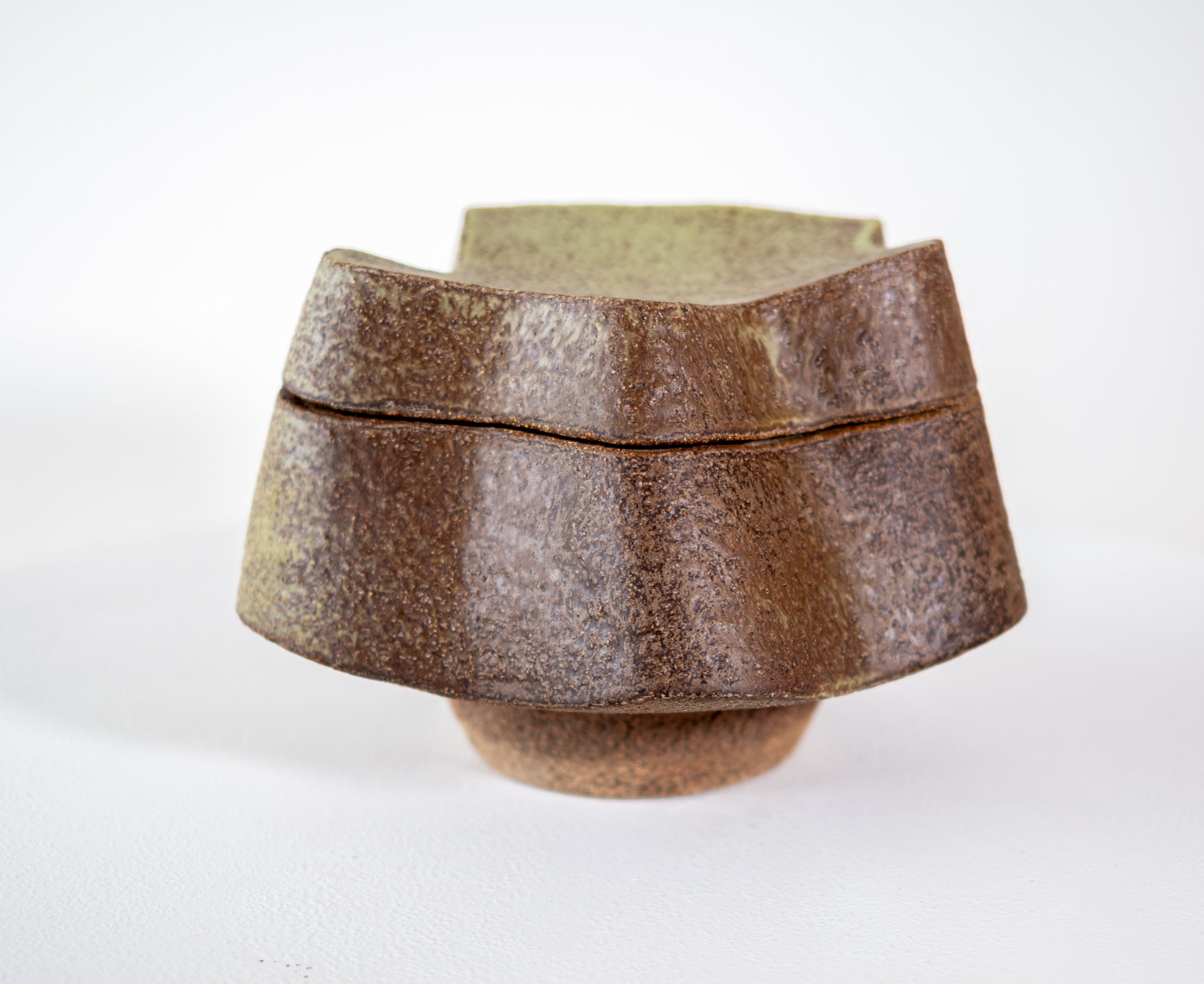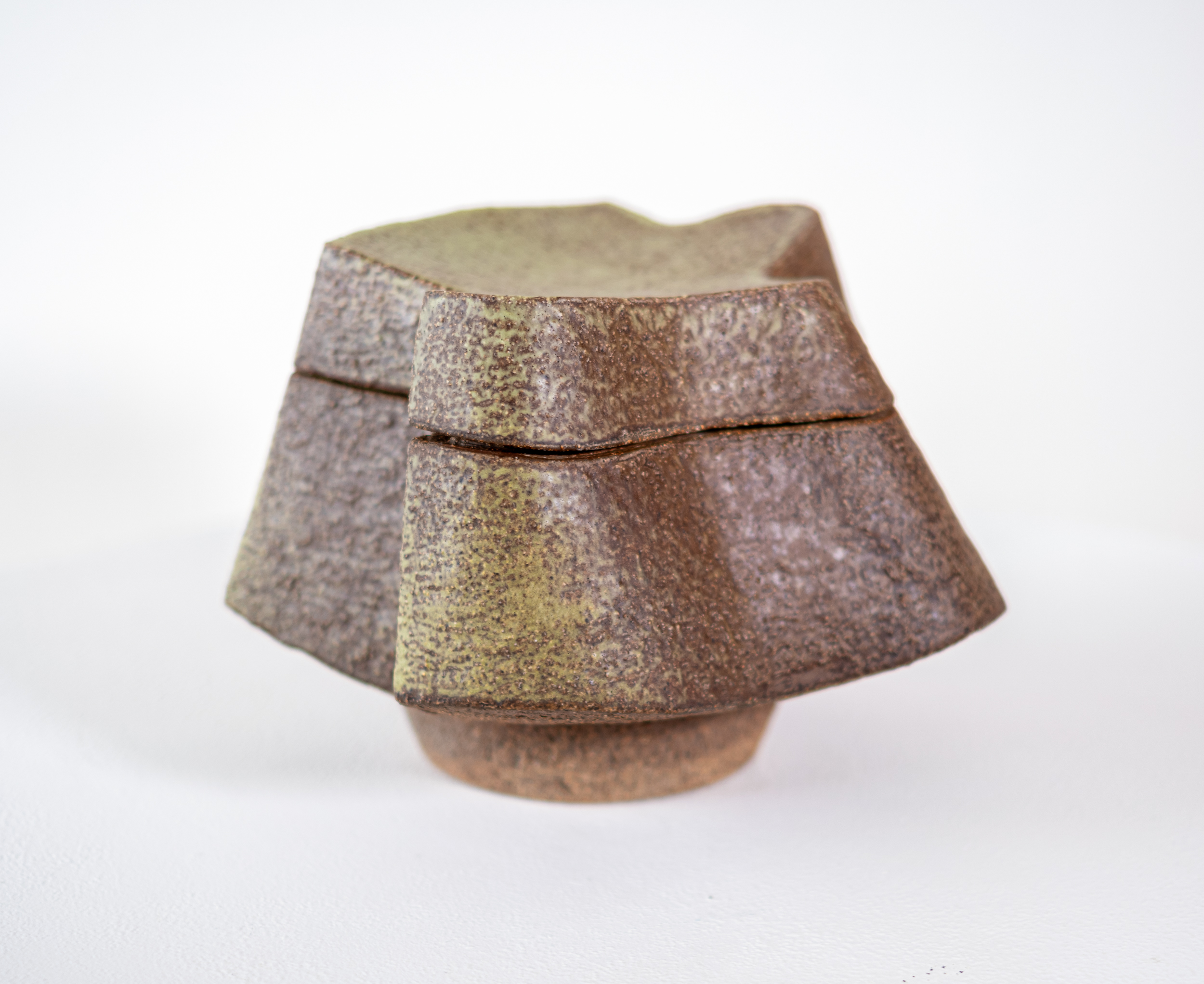 This contemporary ceramic sage coloured box is made by Bruce Cochrane.Internationally recognized for his bold artistic vision, Bruce Cochrane has earned a reputation as one of Canada’s finest ceramicists. His eclectic, dynamic forms are strong, solid and aesthetically pleasing. He favours organic shapes, and his habit of gas or wood firing his clay results in distinctive textures and colours.