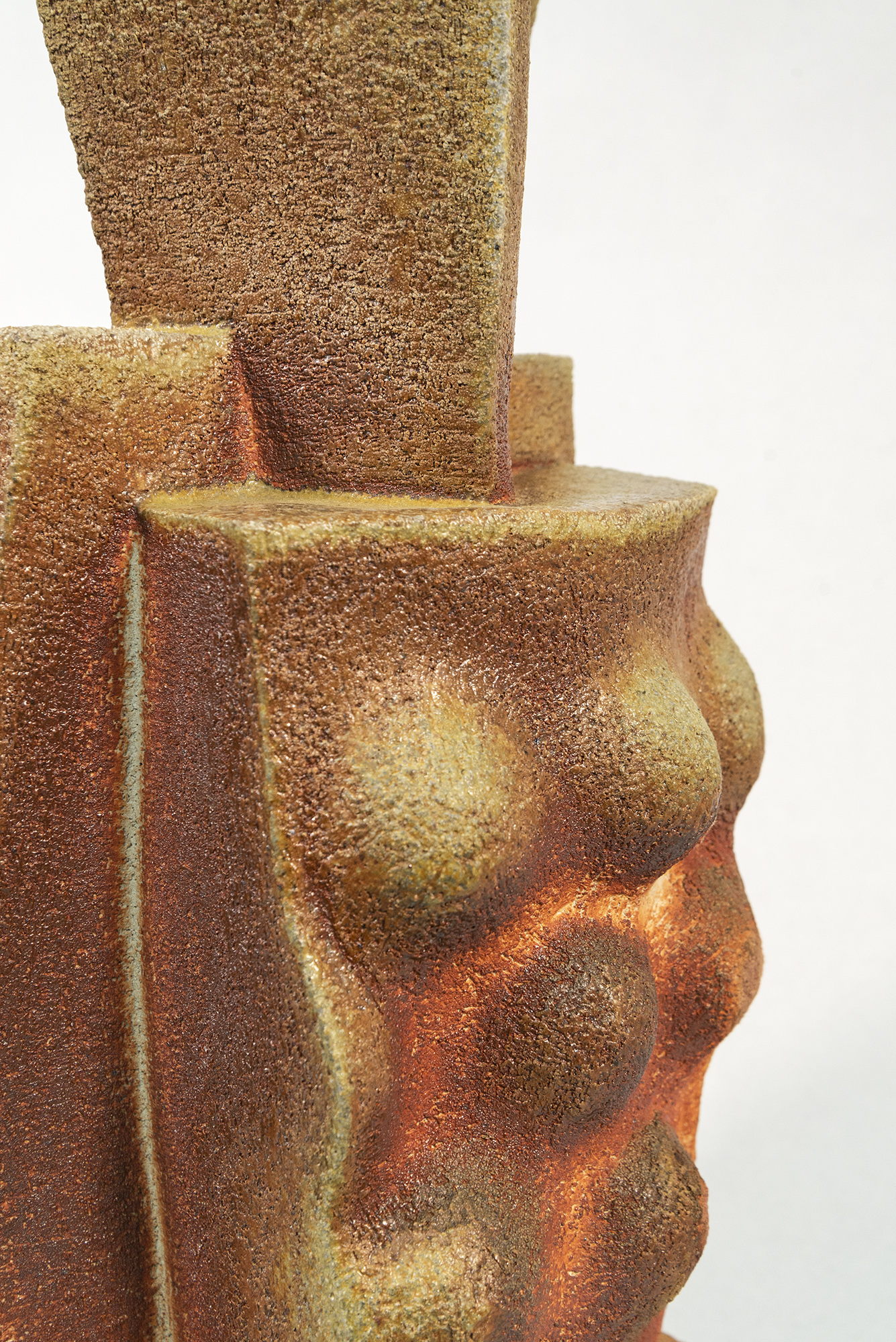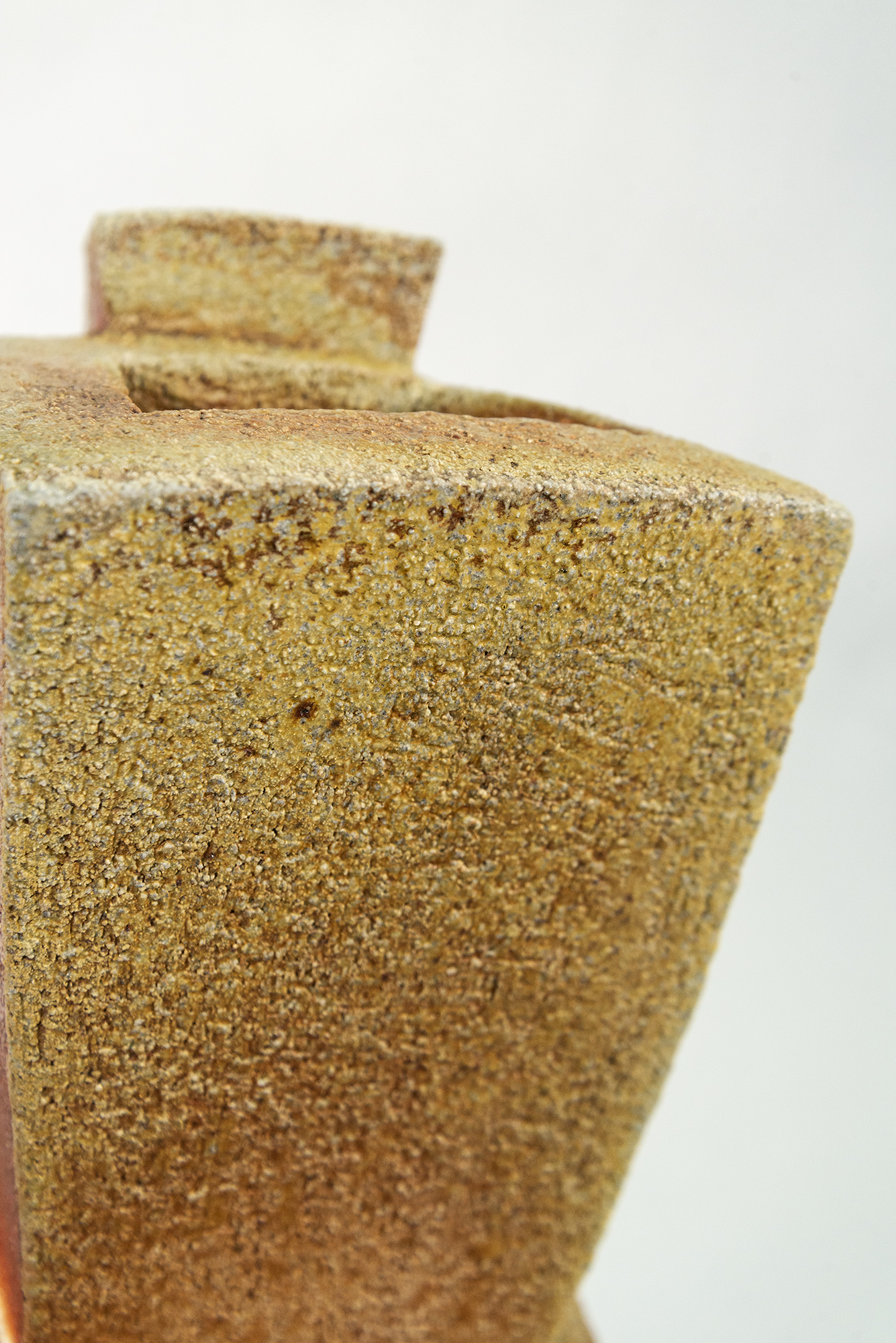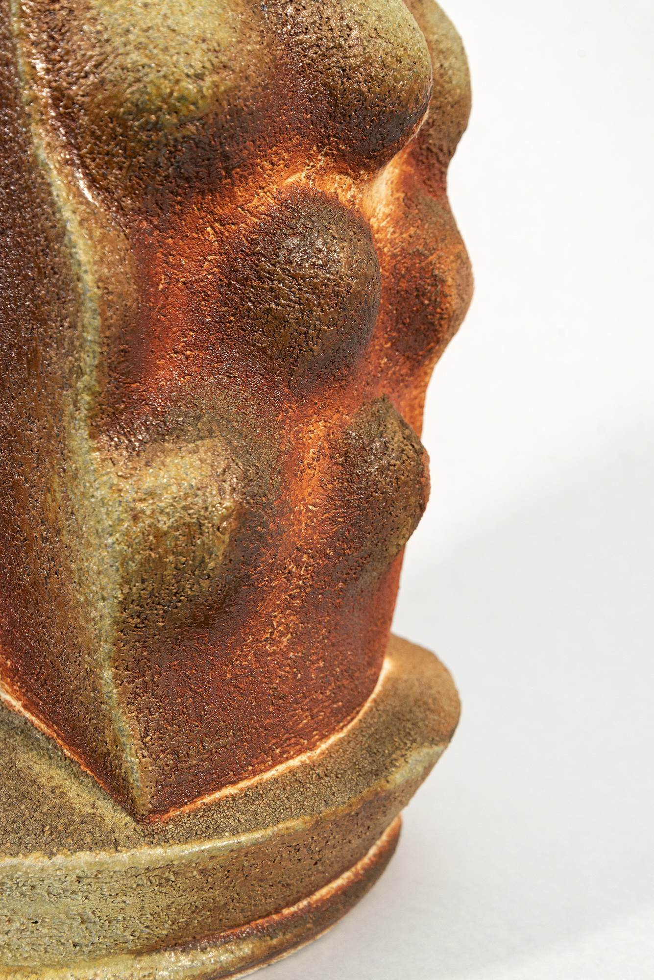This unique contemporary ceramic vessel is by Bruce Cochrane.The striking clay artwork of this Canadian artist has garnered him international attention, including several nominations for the esteemed Governor General’s Award for excellence. A master ceramicist, Cochrane’s ethereal work is wholly contemporary but inspired by the ancient global tradition of working with clay. At the heart of his work is a deep respect for aesthetics but a commitment to functionality. Cochrane has been firing clay for more than fifty years, having developed a signature style that is often described as both ‘tactile and dynamic. He is known for using wood firing, which creates the distinctive texture and rich clay colour variations evident in this unique piece.