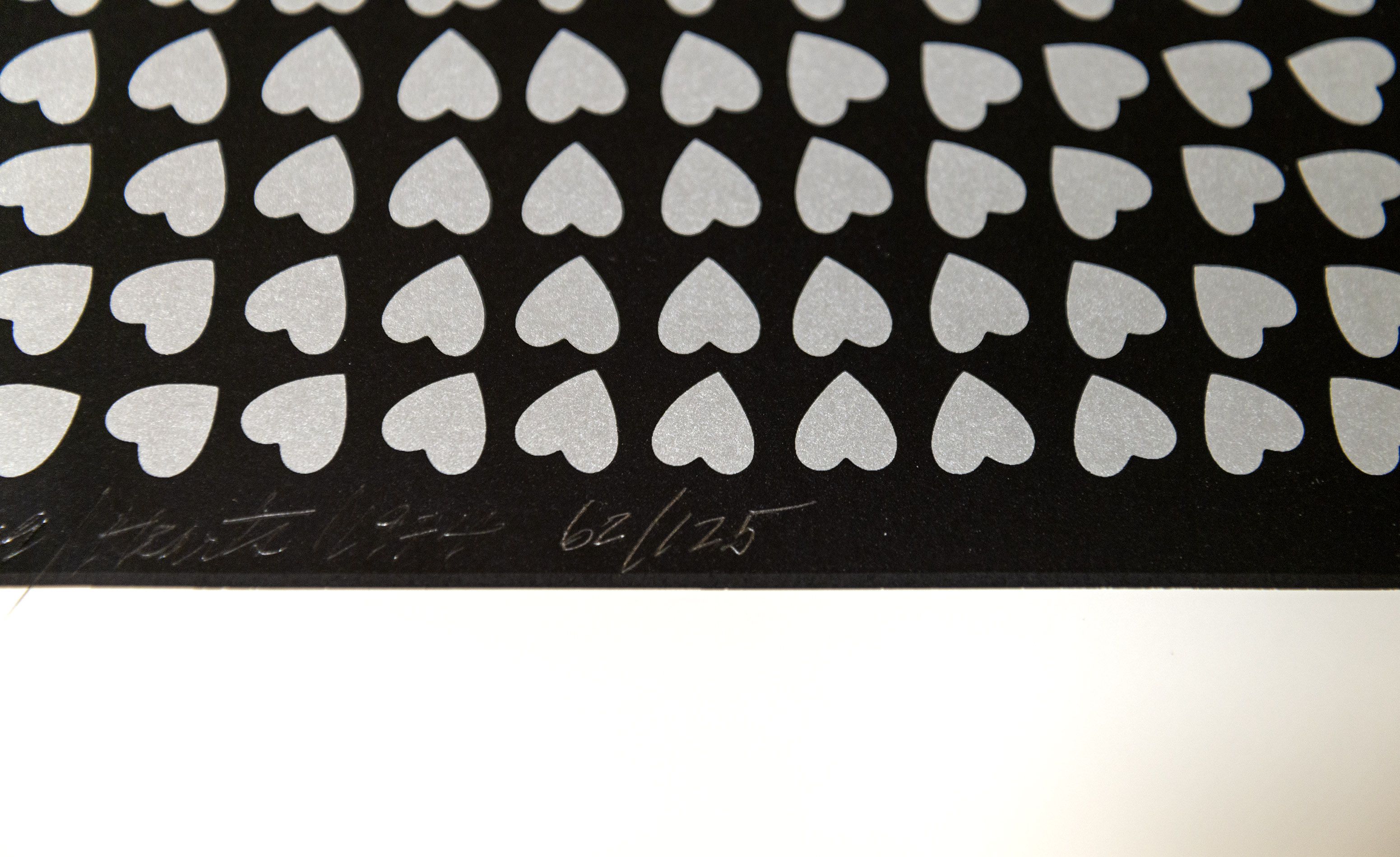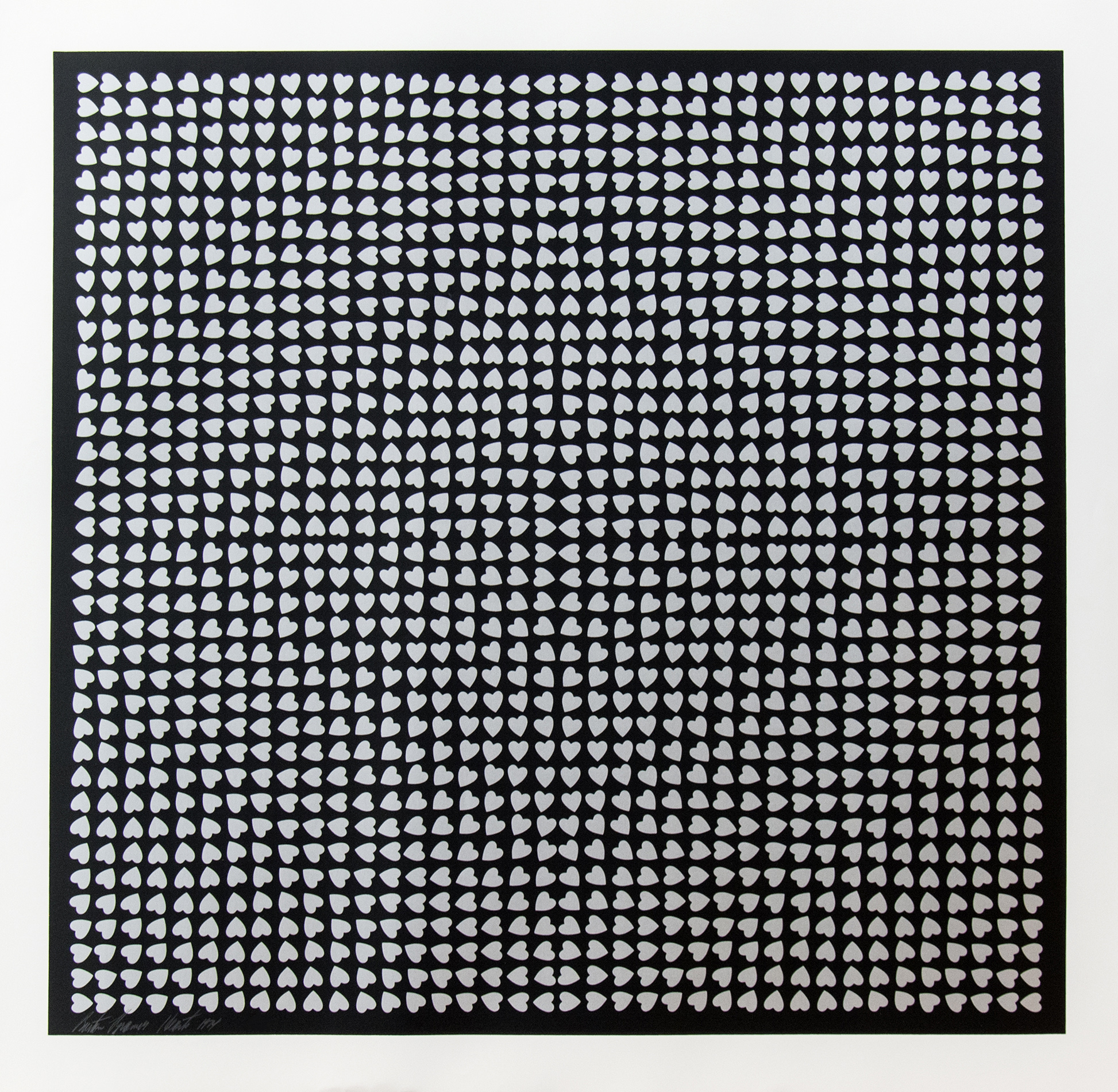 Small silver hearts in a precise geometric design on a black ground create an optical pattern of concentric squares. This square serigraph (silkscreen) is an elegant yet playful image. It is number 62 in an edition of 125. Unframed.Kramer trained at Yale University (MFA), The Institute of Design at the Illinois Institute of Technology (BSc), The Royal College of Art, London (Fulbright Scholar) and The State University of New York. He gained international success with a number of group and solo exhibitions in North America and Europe. He is one of Canada's most influential graphic designers. Notably, Kramer designed the Canadian Broadcasting Corporation logo in 1974. In 1999, Kramer received the Lifetime Achievement Award from Arts Ontario and in 2002 was awarded The Order of Ontario by the Province and an Honorary Doctorate from Ontario College of Art & Design. His work is in many private and public collections including the Royal Ontario Museum.