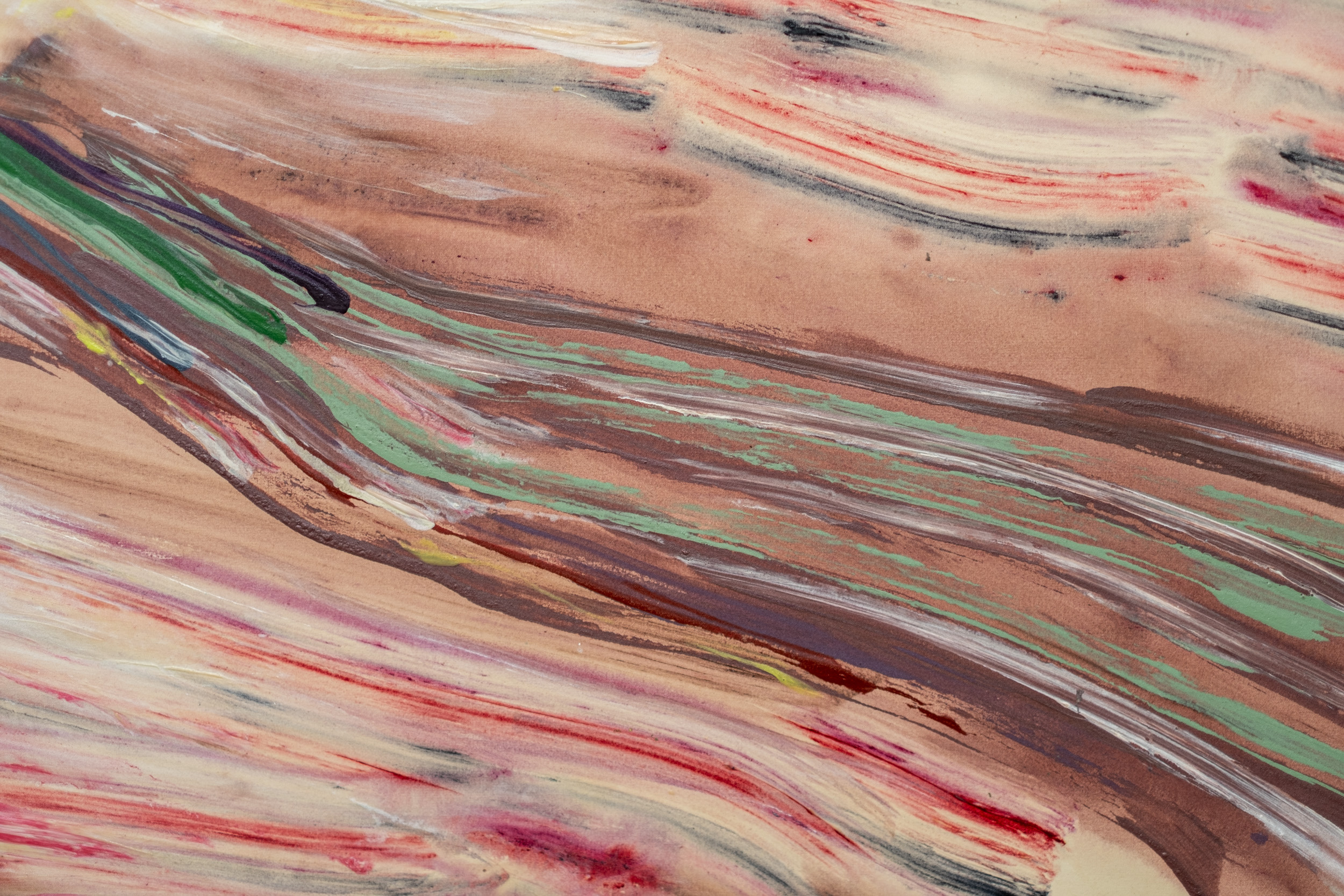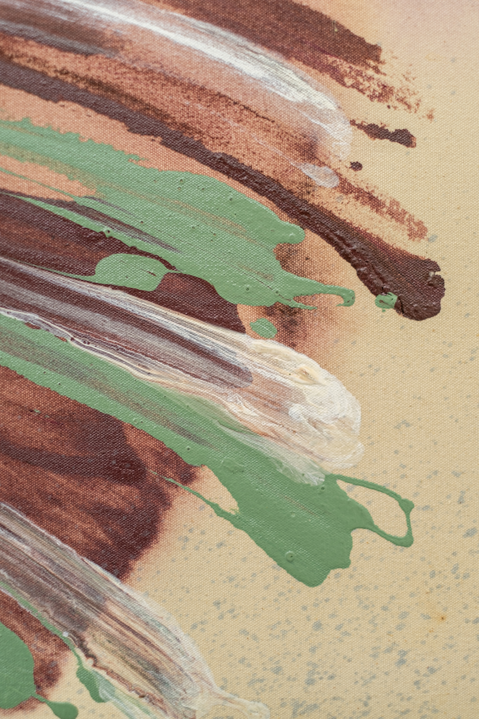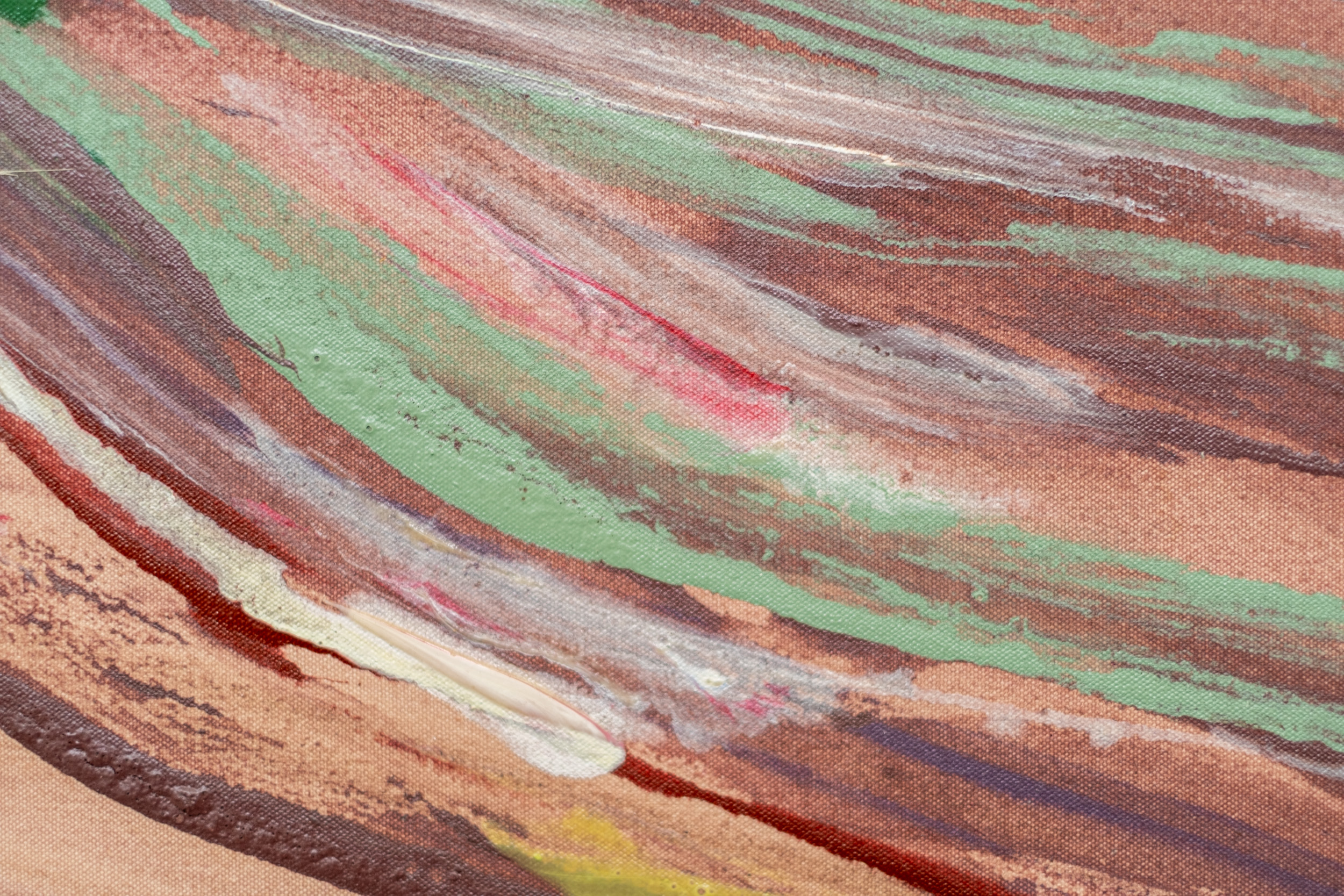 This colourful contemporary abstract painting is by Carol Sutton.In the 1970s, the paintings of a young Carol Sutton caught the attention of one of America’s best-known art critics, Clement Greenberg, who visited her studio often. The prolific artist was known for creating large-scale works painted on canvases that were placed on the floor. Sutton was appreciated for her bold use of colour and her intuitive understanding of light. This piece showcases deliciously fresh ‘peppermint’ colours—pinks, greens, red, and white that flow in fluid lines across the canvas. The intense colours are grounded by the addition of chocolate brown and black.